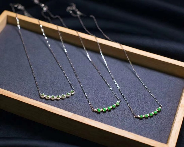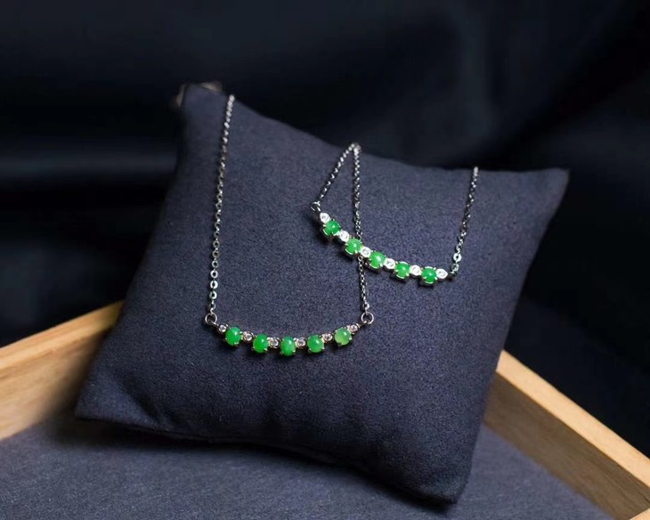 阳绿冰绿天然A货翡翠蛋面,925纯银锆石微镶,经典微笑款锁骨链