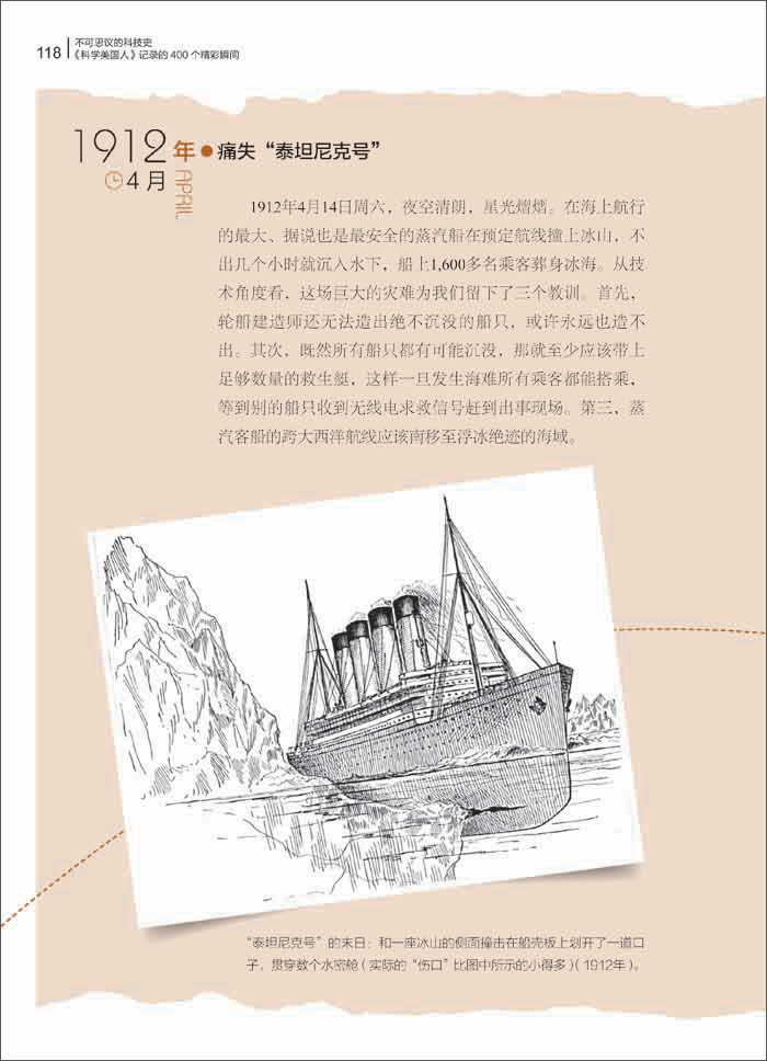 1912年4月14日周六,夜空清朗,星光熠熠,在海上航行的Zui大、据说也是Zui安全的蒸汽船在预定航线撞上冰山,不出几个小时就沉入水下,船上1,600多名乘客葬身冰海。以技术角度看,这场巨大的灾难为我们留下了三个教训。首先,轮船建造师还无法造出绝不沉没的船只,或许永远也造不出。其次,既然所有船只都有可能沉没,那就至少应该带上足够数量的救生艇,这样一旦发生海难所有乘客都能搭乘,等到别的船只收到无线电求救信号赶到出事现场。第三,蒸汽客船的跨大西洋航线应该南移至浮冰绝迹的海域。