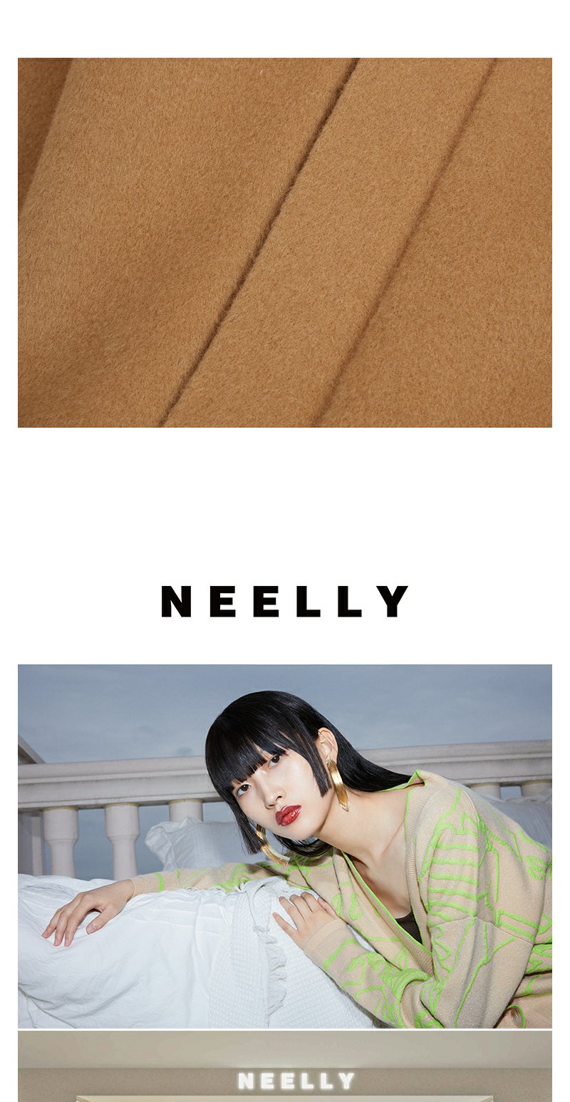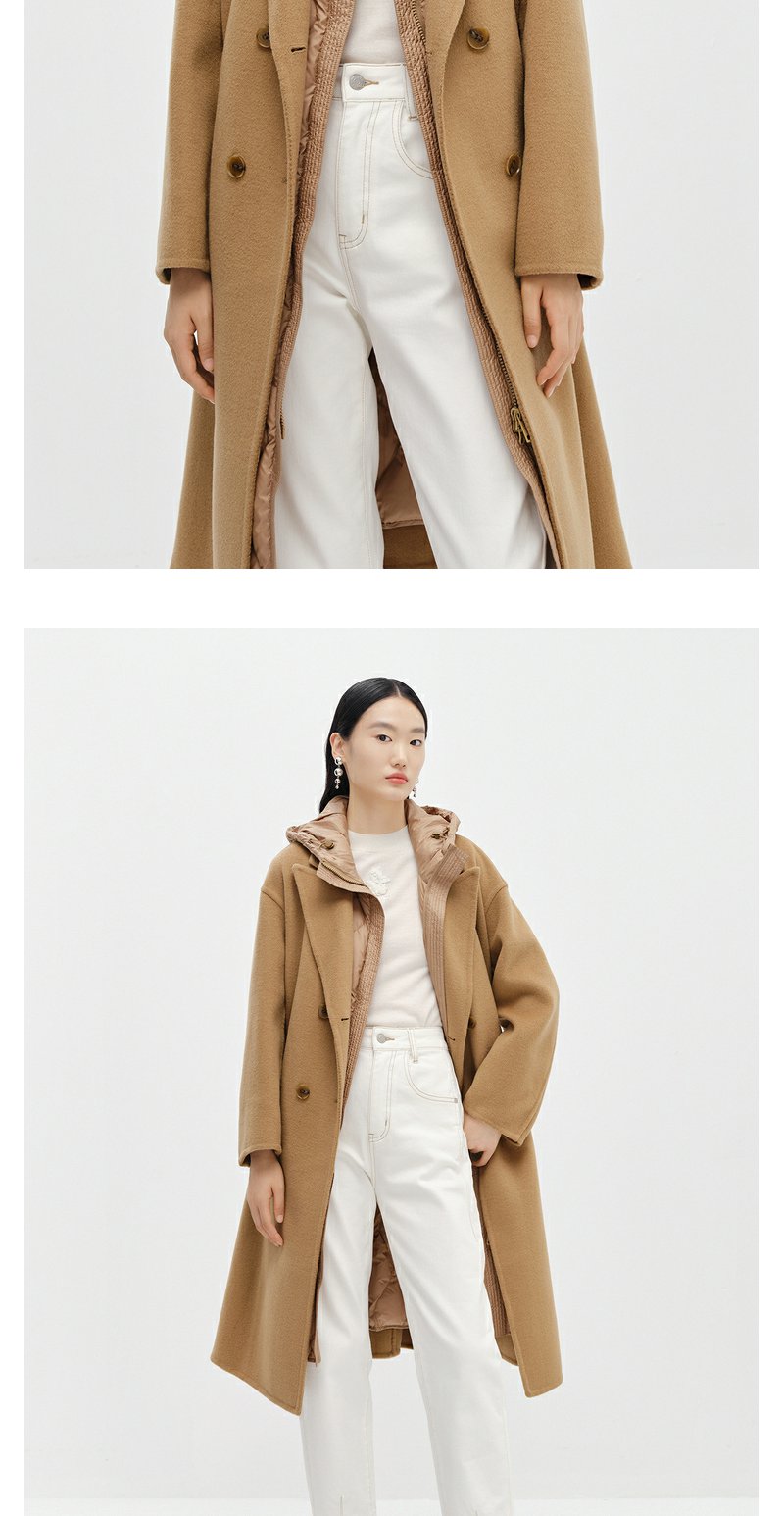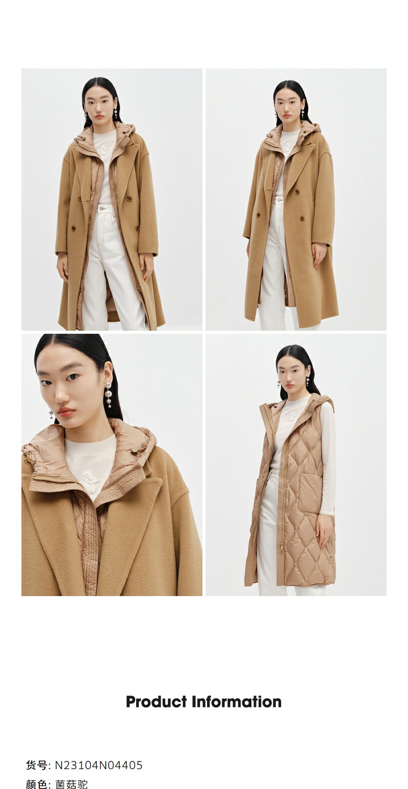 NEELLY纳俪商场同款驼色毛呢大衣中长款连帽羽绒马夹可脱卸两件套N24104N04602