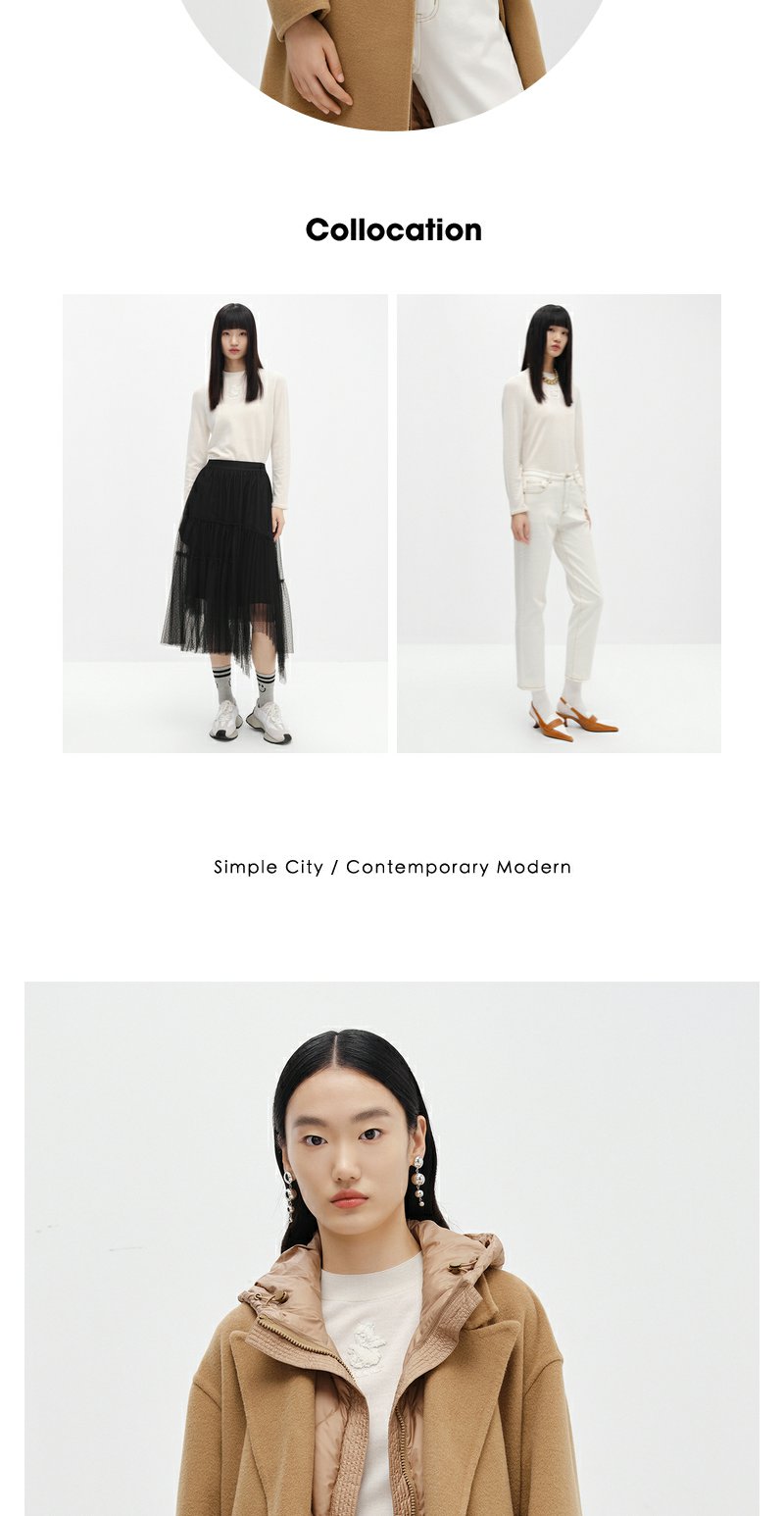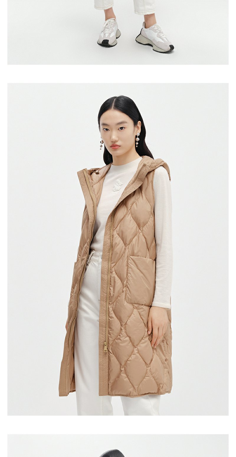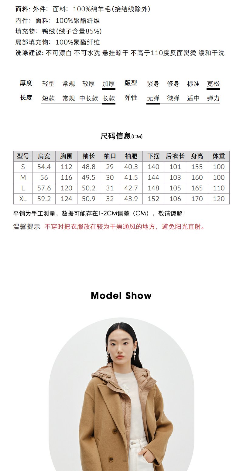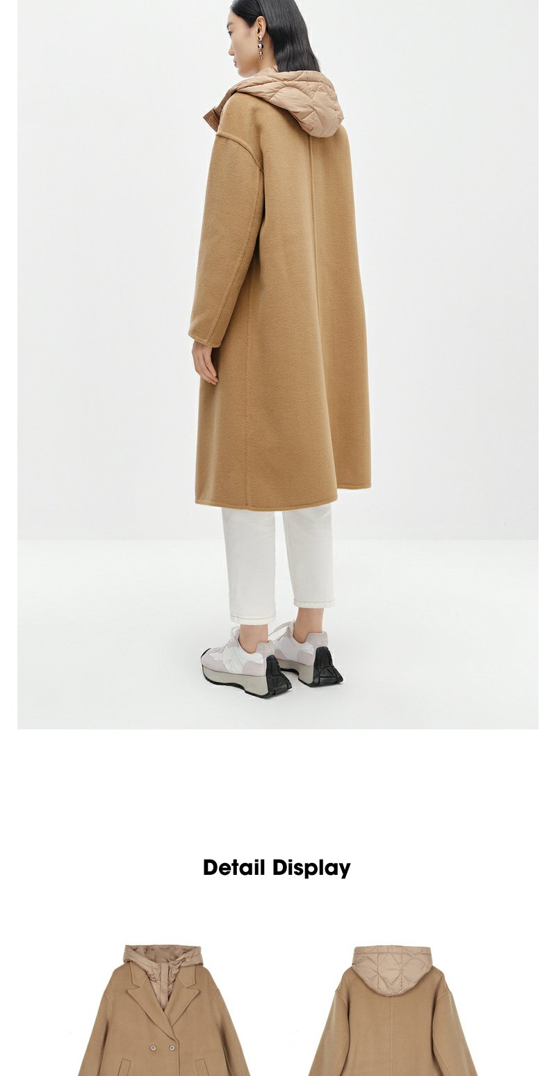 NEELLY纳俪商场同款驼色毛呢大衣中长款连帽羽绒马夹可脱卸两件套N24104N04602