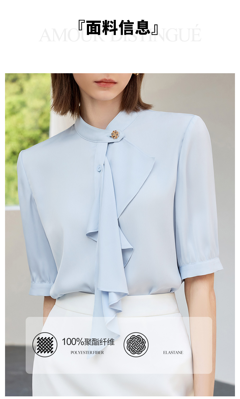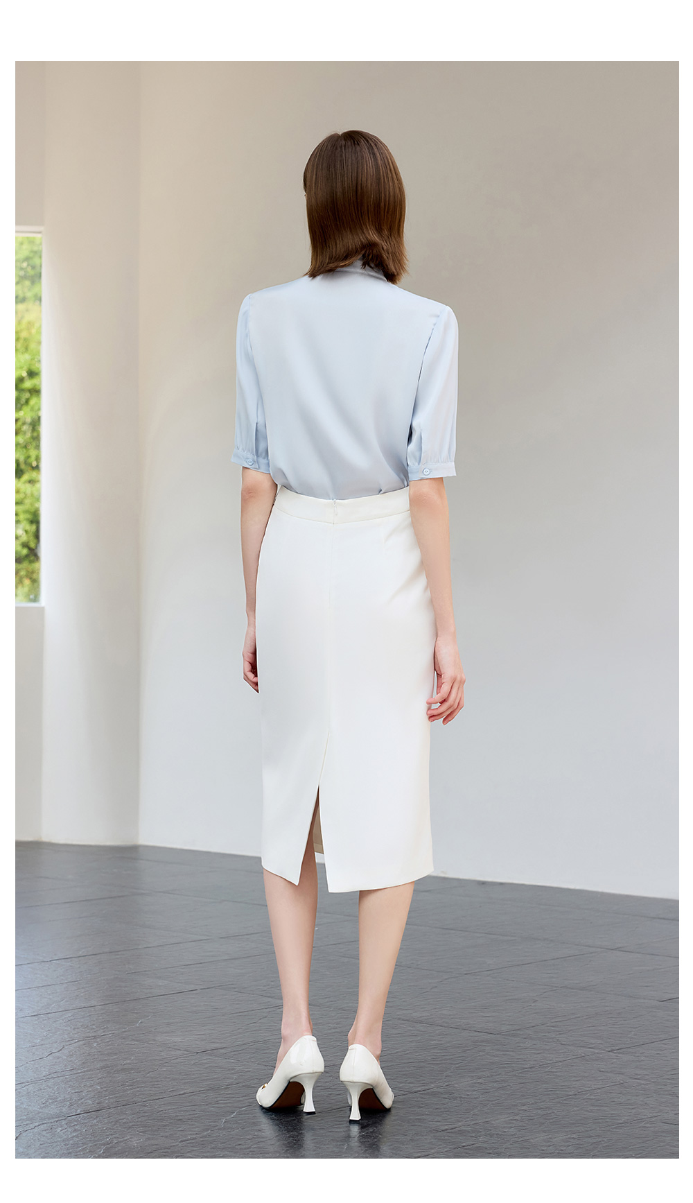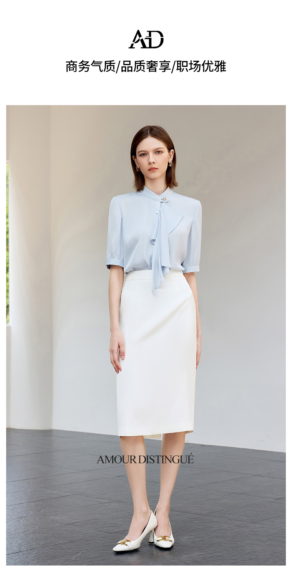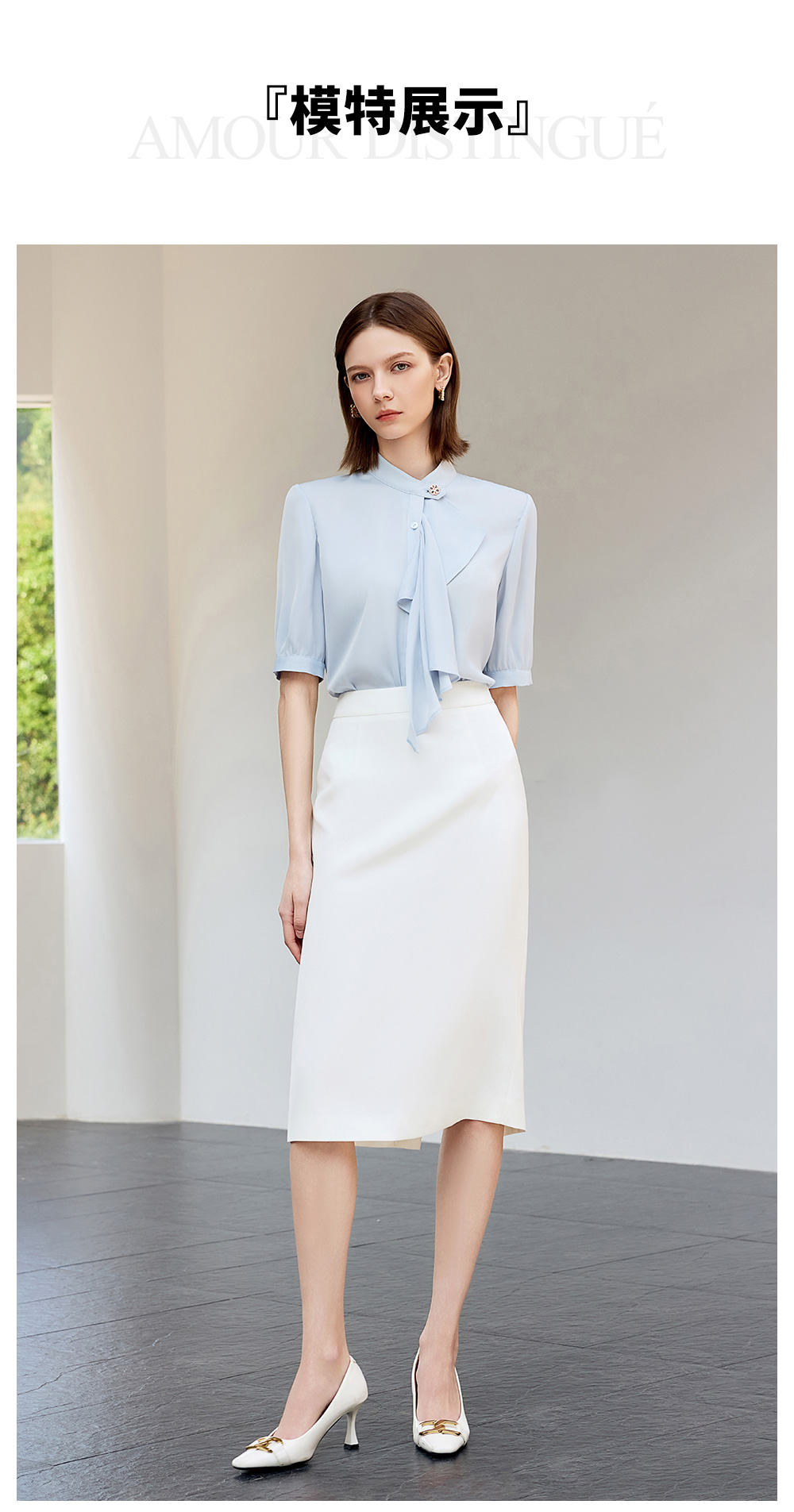 IWY/轻奢质感蓝色短袖飘带衬衫女时尚简约套装主持人正装B560+S1584