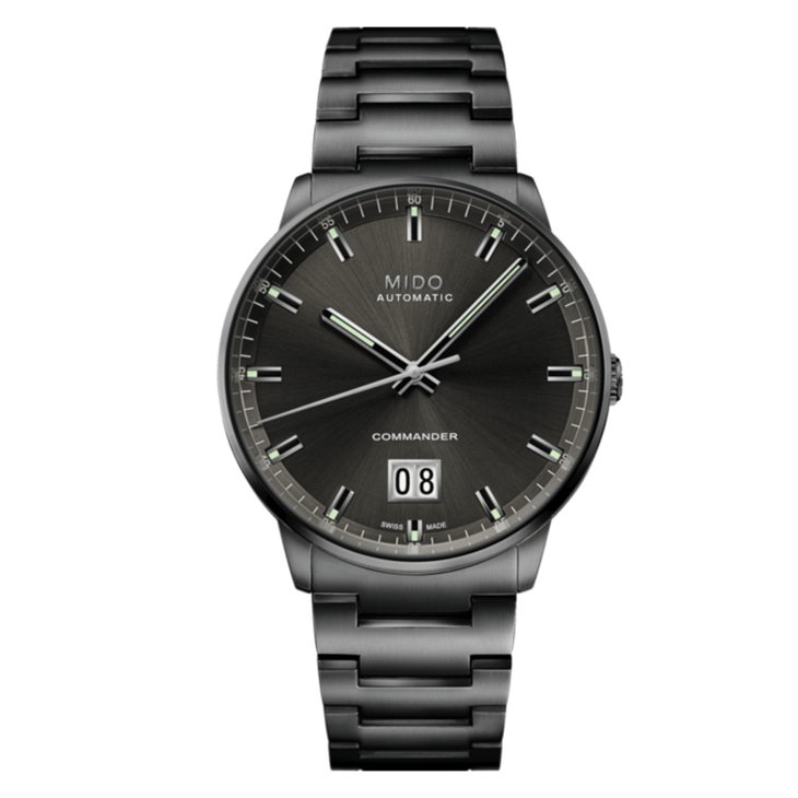 镜面 材质 | 蓝宝石水晶玻璃 | 表盘 | 烟煤灰色PVD精钢表壳 烟煤灰色丝光打磨太阳纹表盘 镶贴时标 大三针 大型日期视窗 透底 |