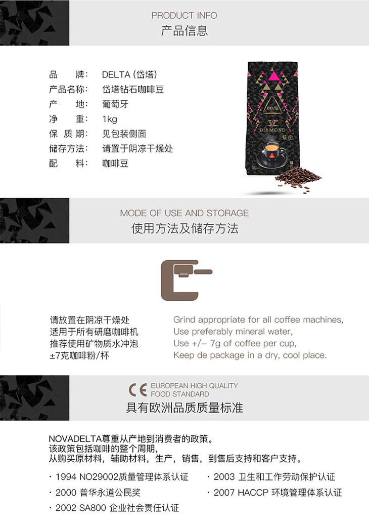 DELTA/岱塔 葡萄牙进口 钻石阿拉比卡咖啡豆1kg