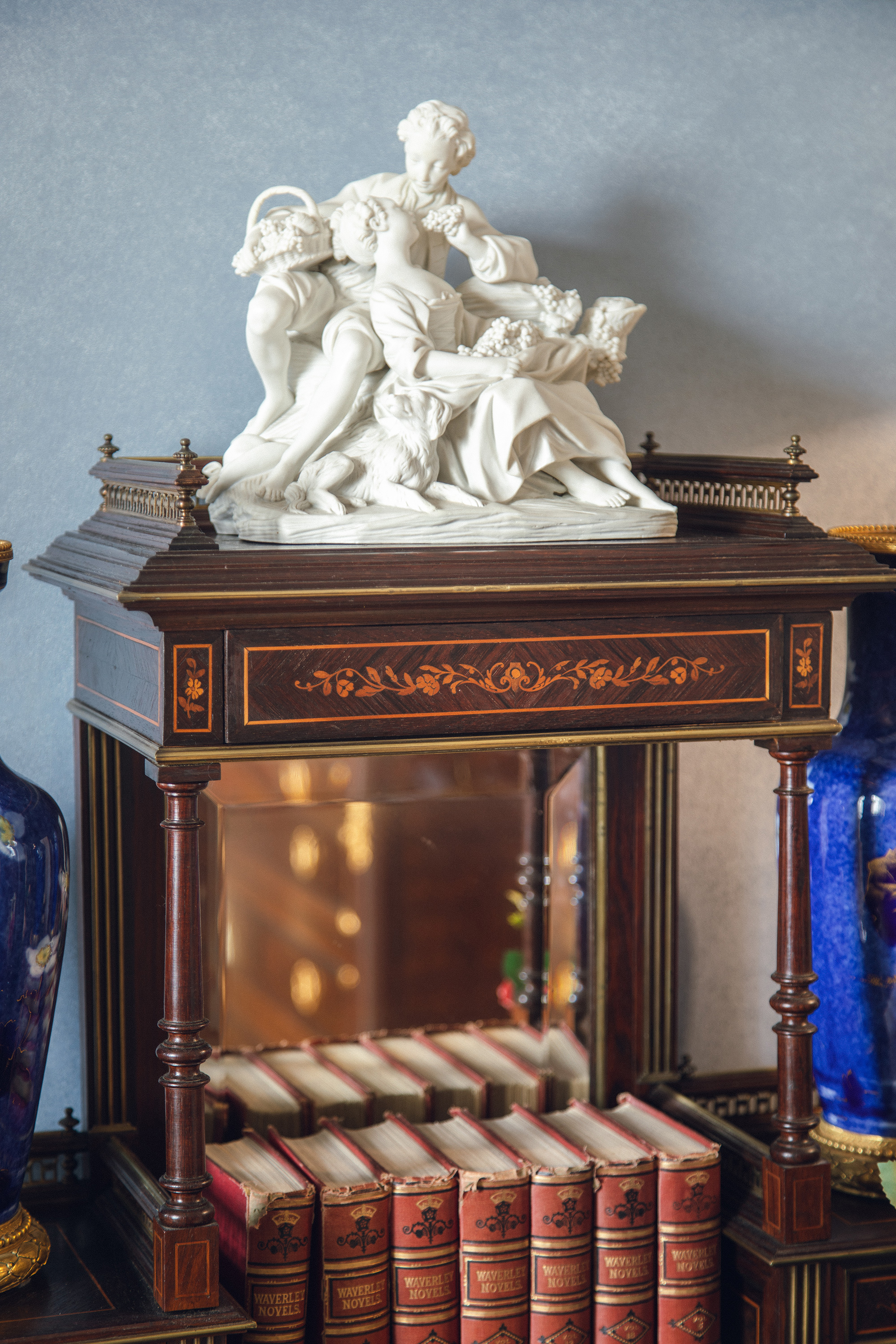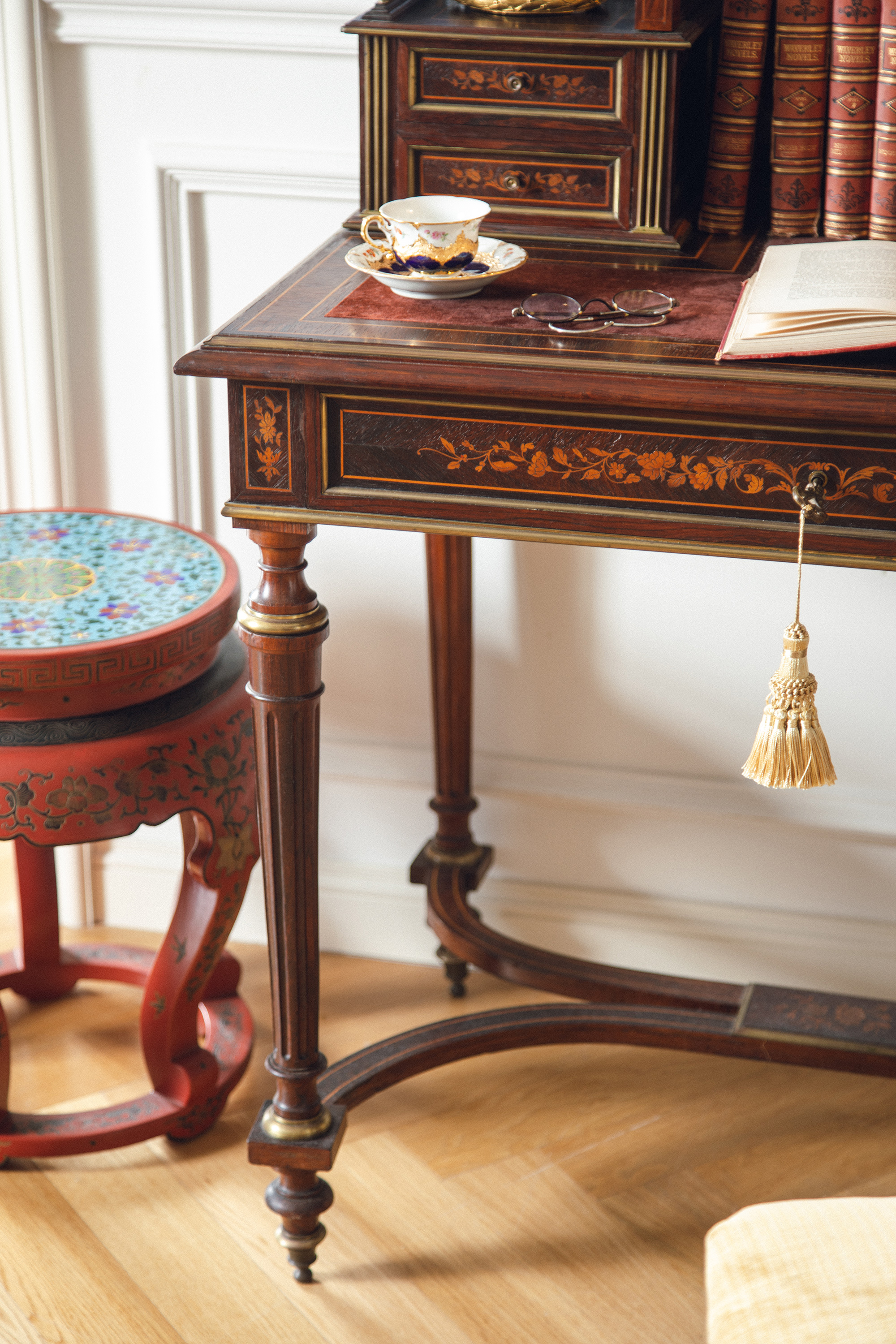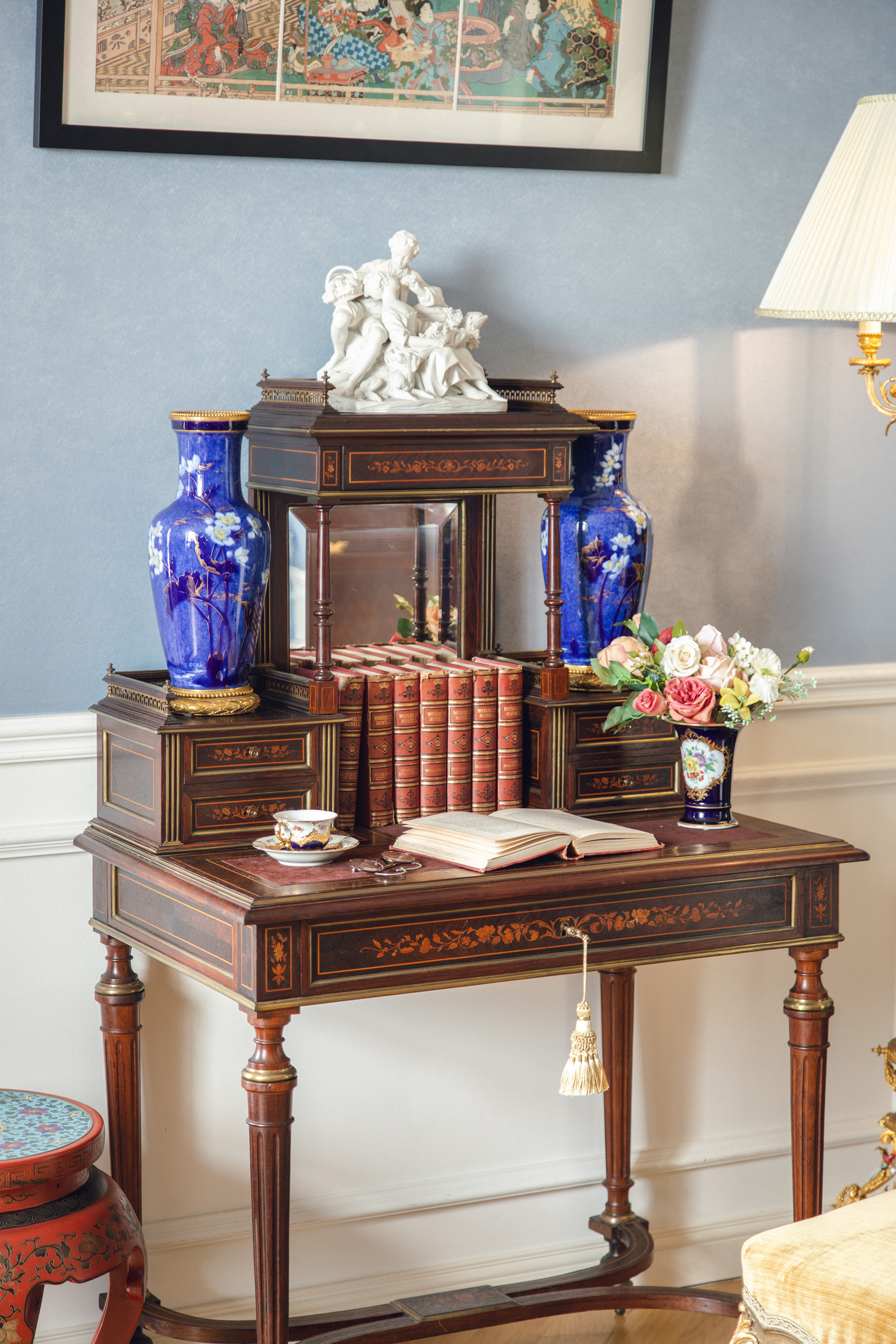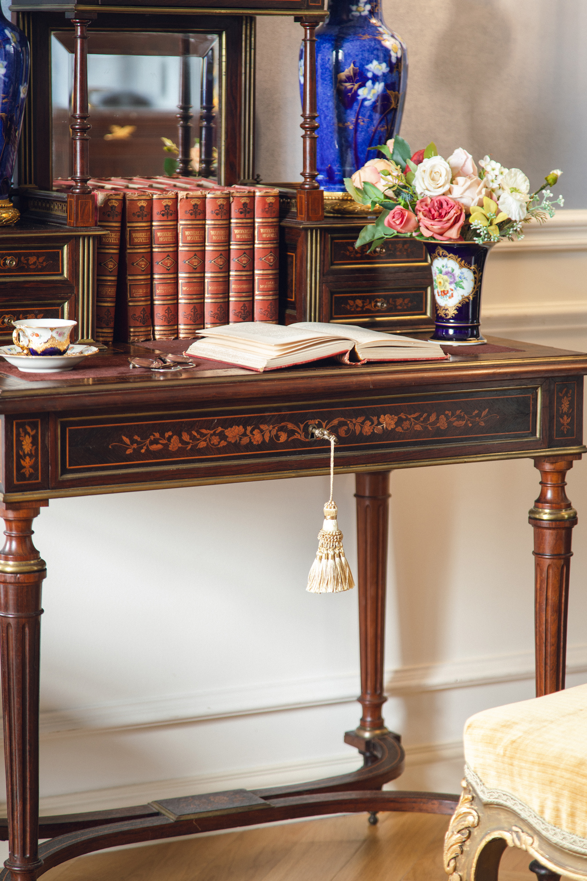 1890年代法国出品路易十六风格鎏金装饰胡桃木精雕古典花叶纹细木镶嵌带镜写字桌