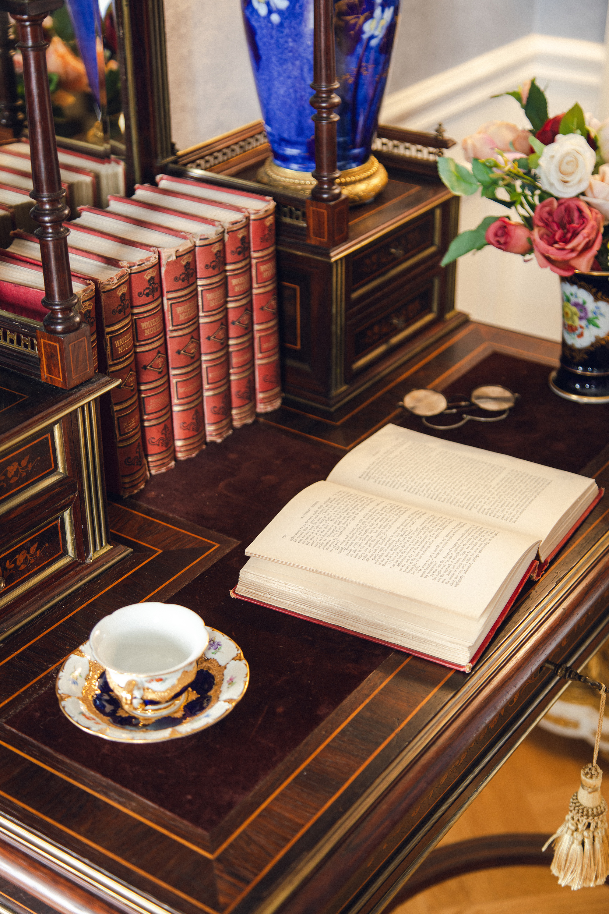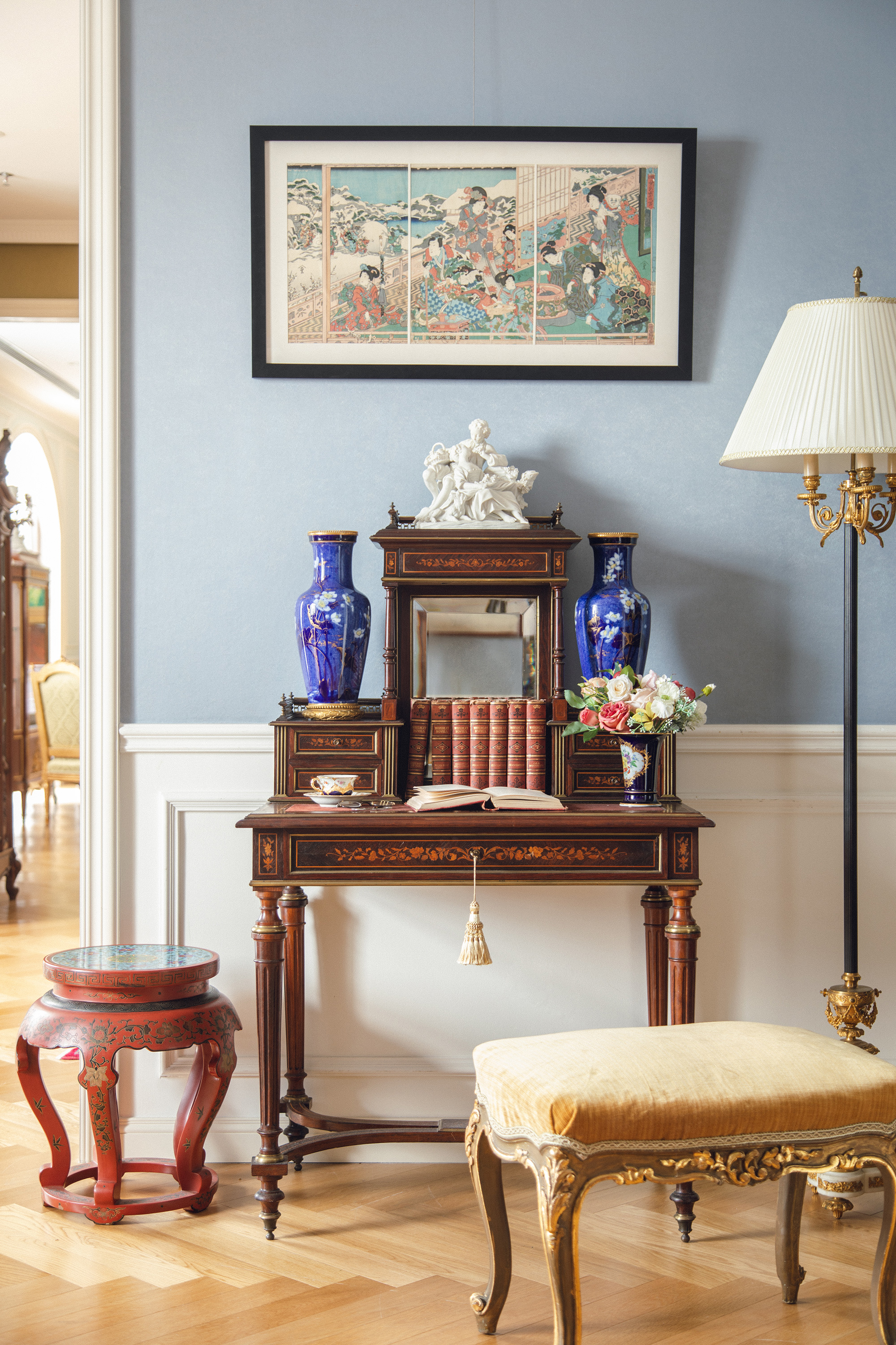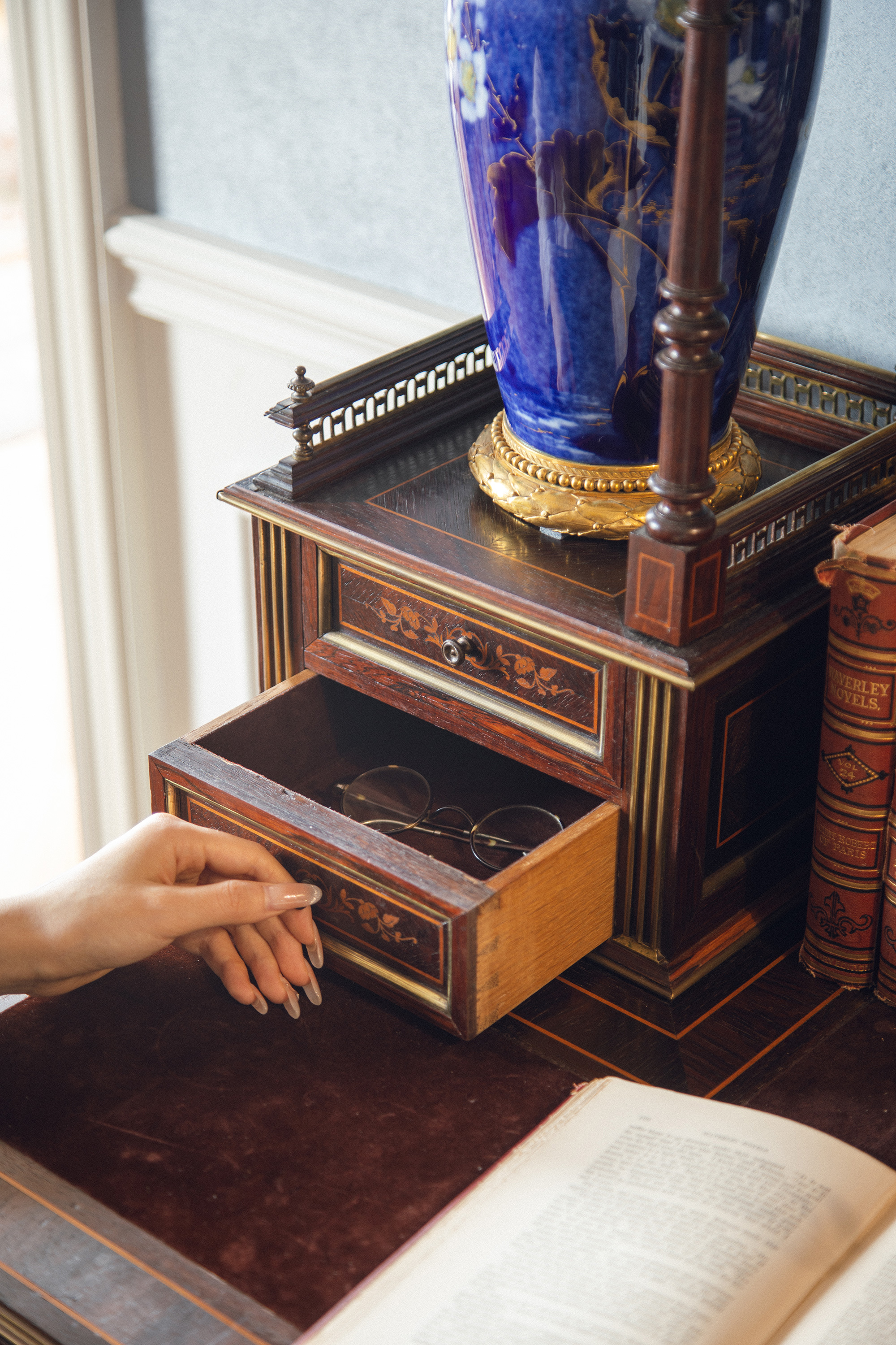 材质:胡桃木,花梨木及其他木材贴皮,丝绒(桌面),镜面等