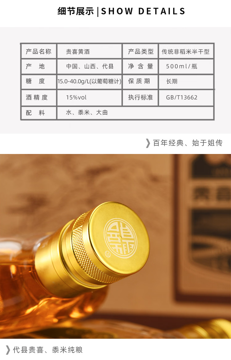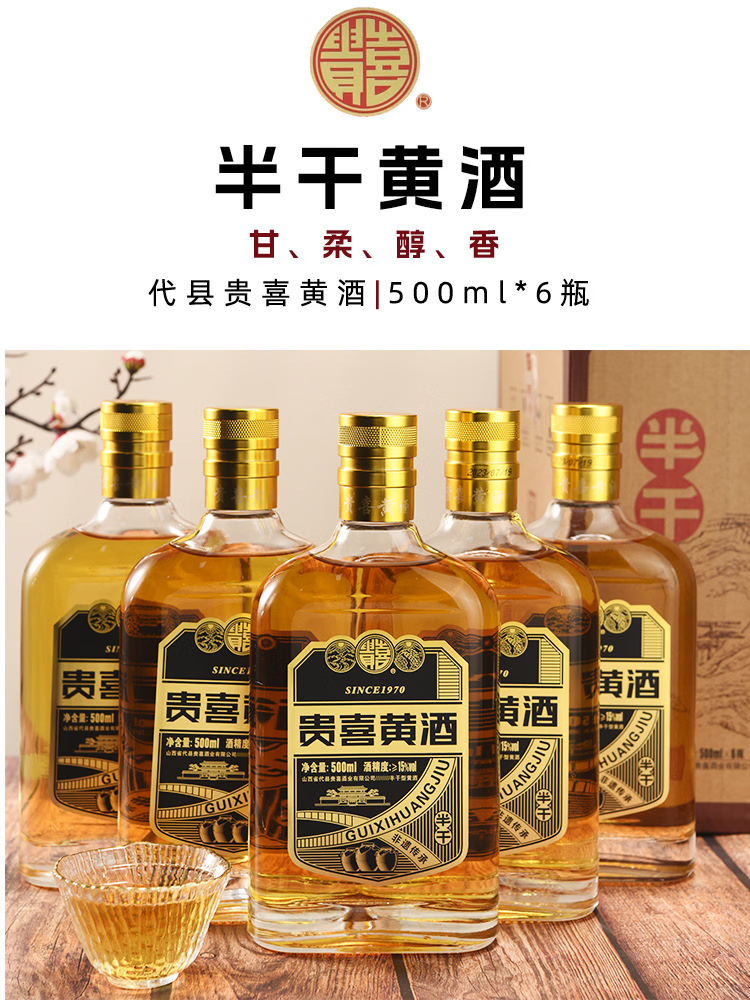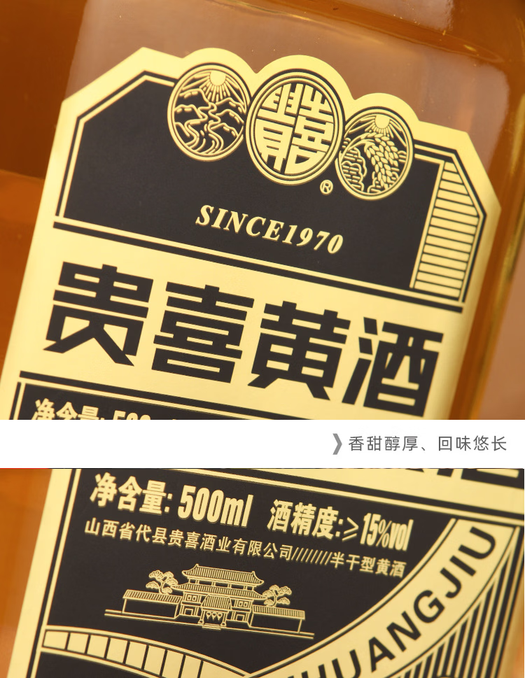 贵喜山西非遗代州黄酒 半干醇香黄酒15度500ml*6瓶装/箱