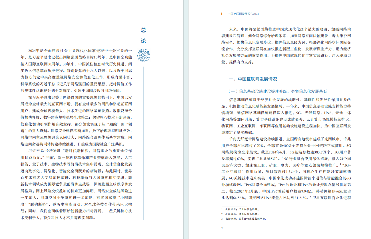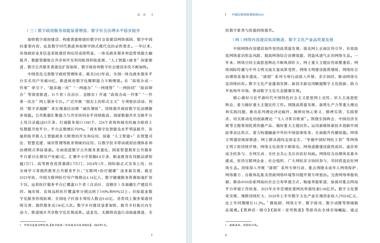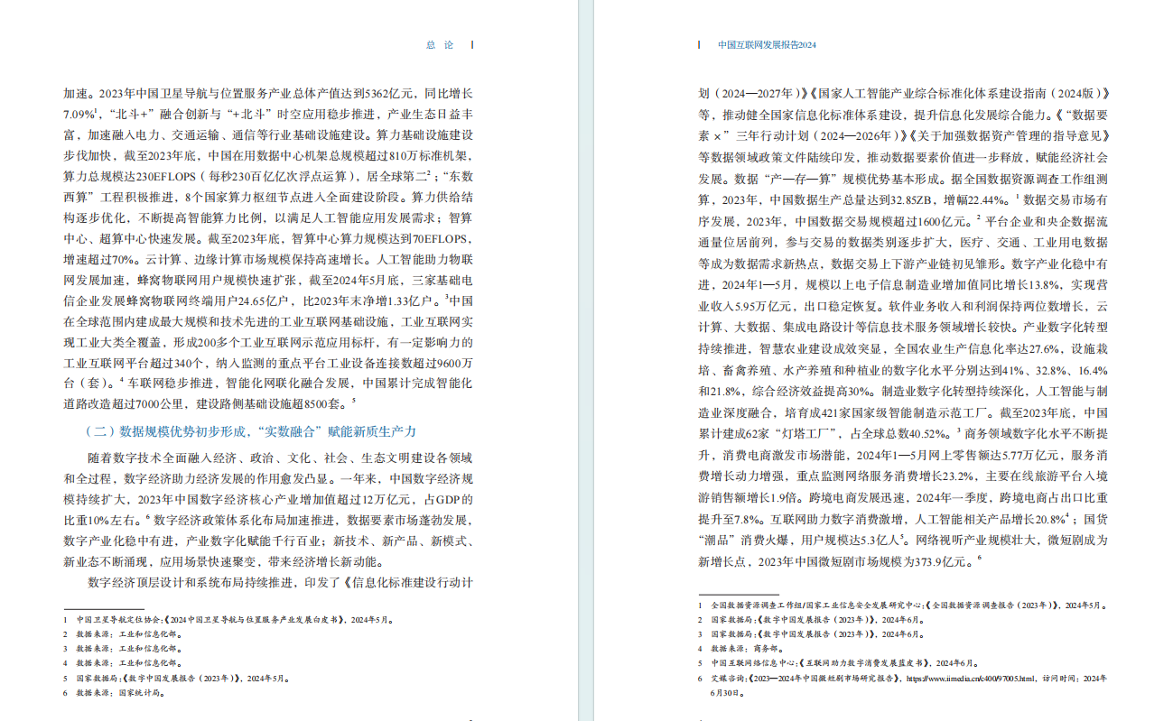 2024年是中华人民共和国成立75周年,是习近平总书记提出网络强国战略目标10周年和我国全功能接入国际互联网30周年。十年来,在习近平新时代中国特色社会主义思想特别是习近平文化思想和习近平总书记关于网络强国的重要思想指引下,网信事业取得历史性成就、发生历史性变革,网络强国建设迈出新步伐,2024年7月,党的二十届三中全会胜利召开,对健全促进实体经济和数字经济深度融合制度、健全网络综合治理体系等作出系统部署,为进一步深化网信领域改革,以网信事业高质量发展助力中国式现代化指明了方向。《中国互联网发展报告2024》旨在展现一年来我国互联网的发展成就和生动实践,展望互联网发展趋势,以期为广大读者提供丰富资料和翔实数据。