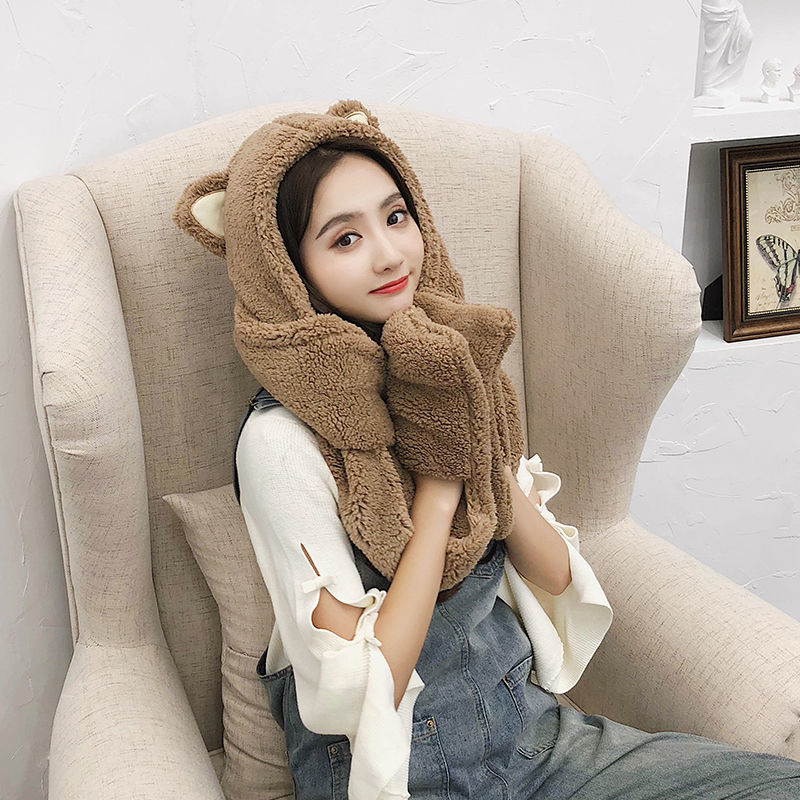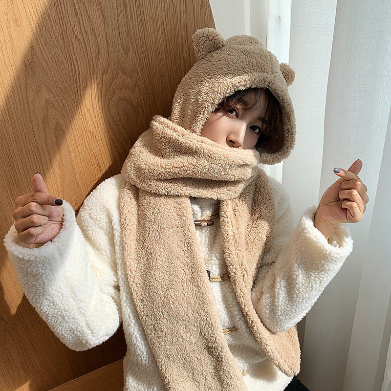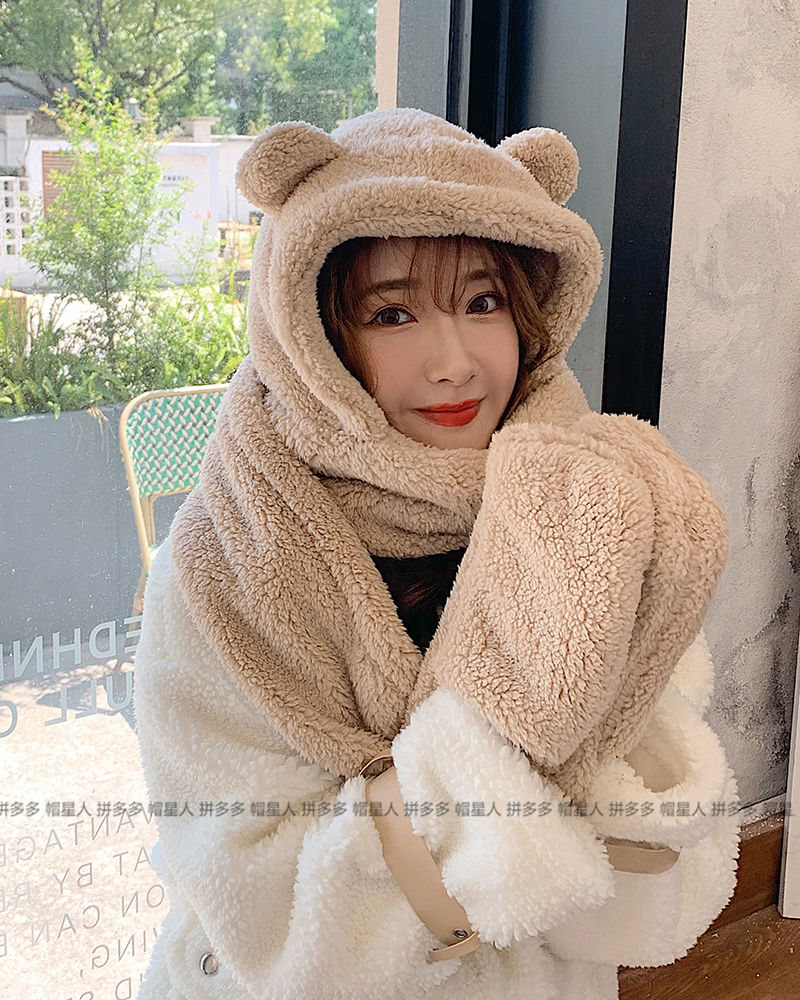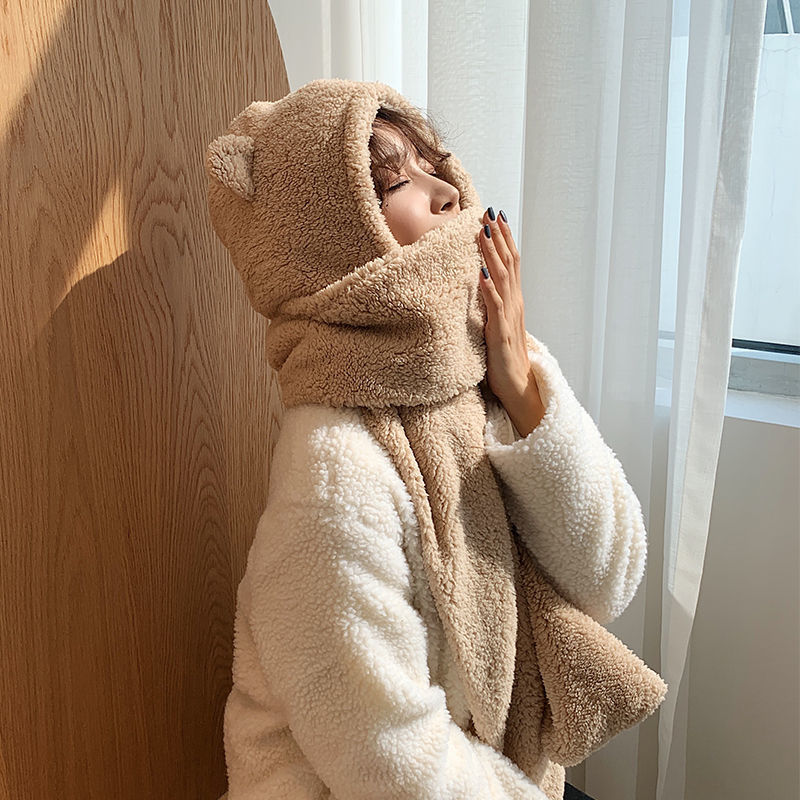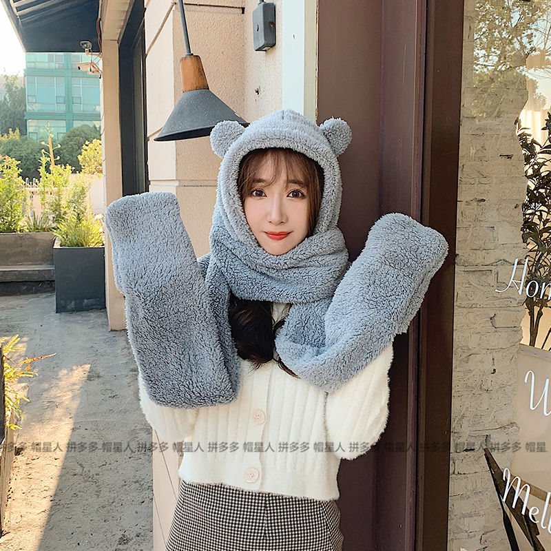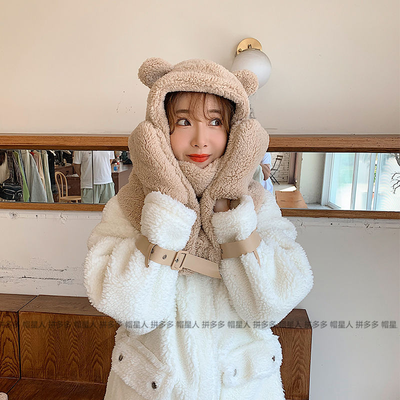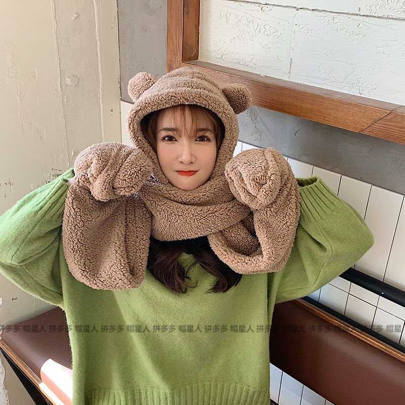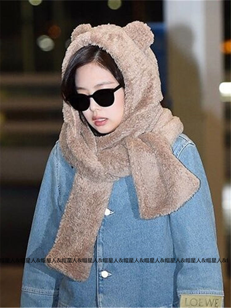 Jennie同款小熊围巾帽子一体女秋冬毛绒加厚保暖可爱围脖套装学生