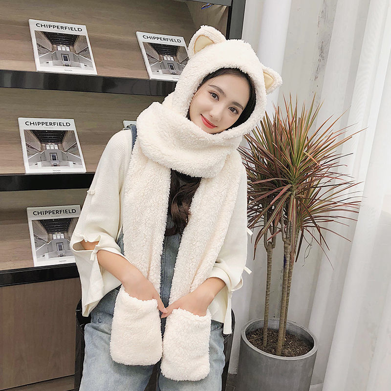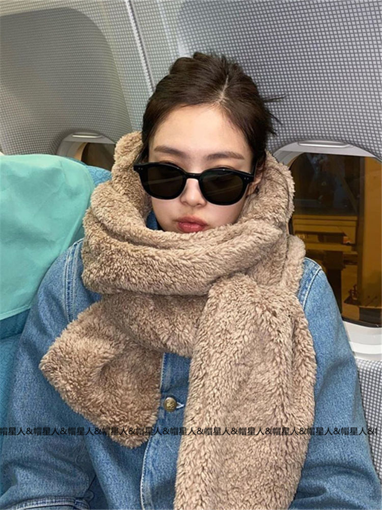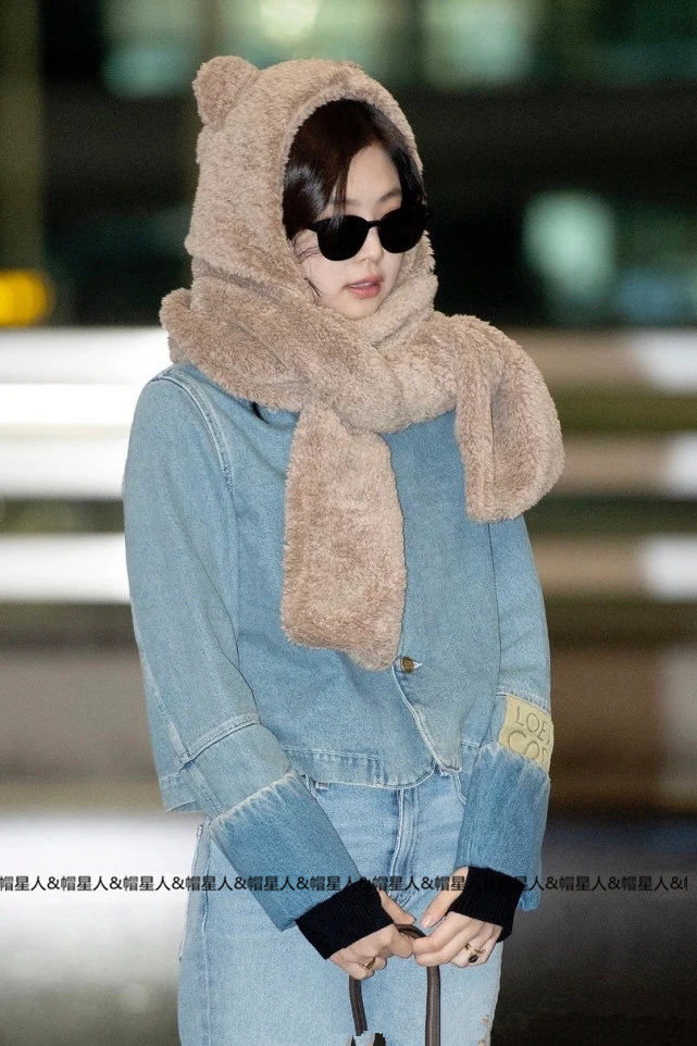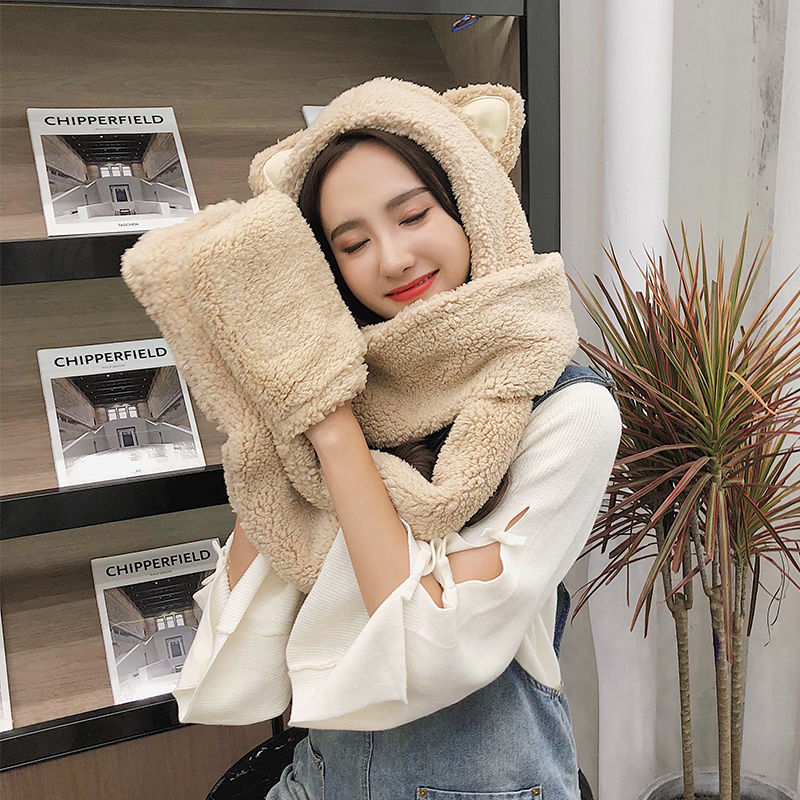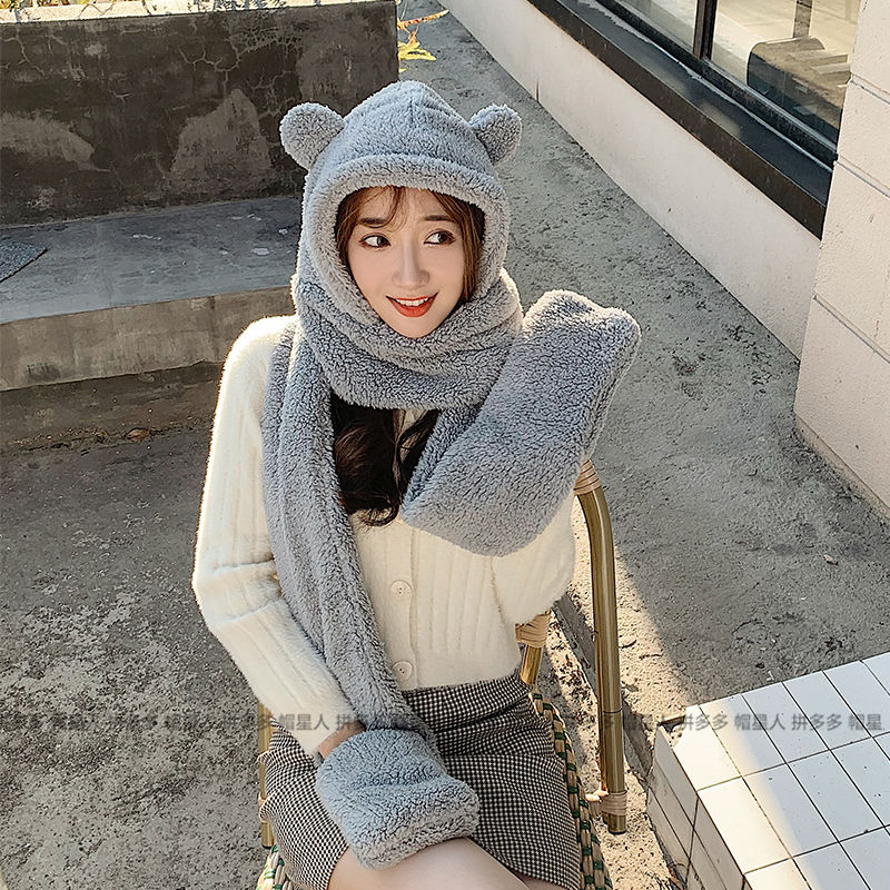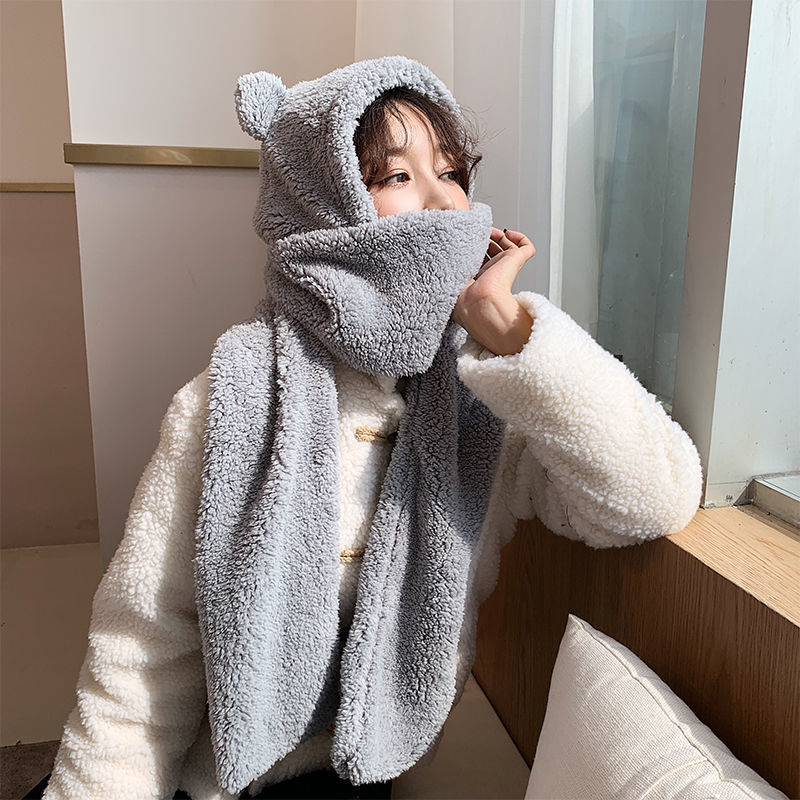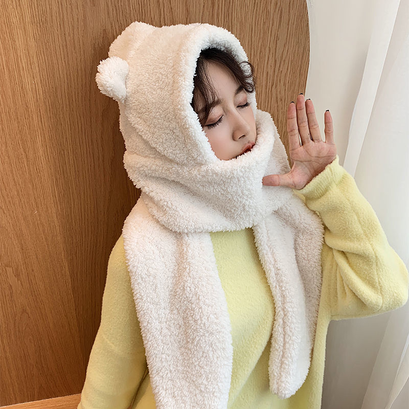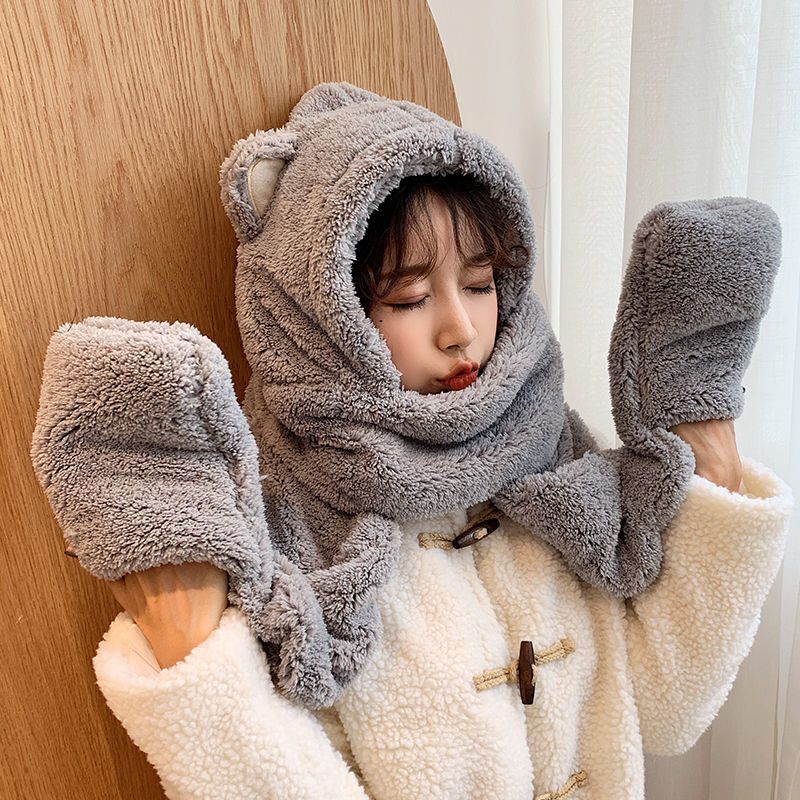 Jennie同款小熊围巾帽子一体女秋冬毛绒加厚保暖可爱围脖套装学生
