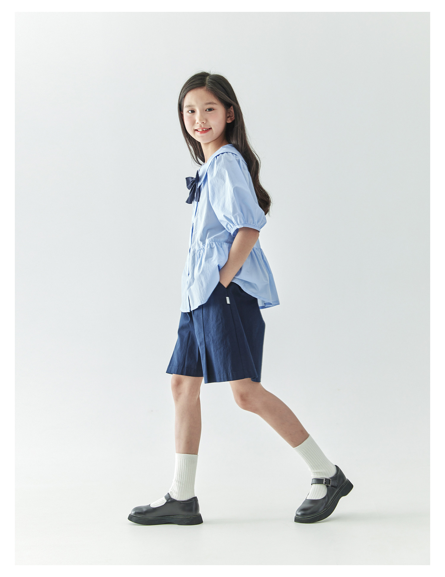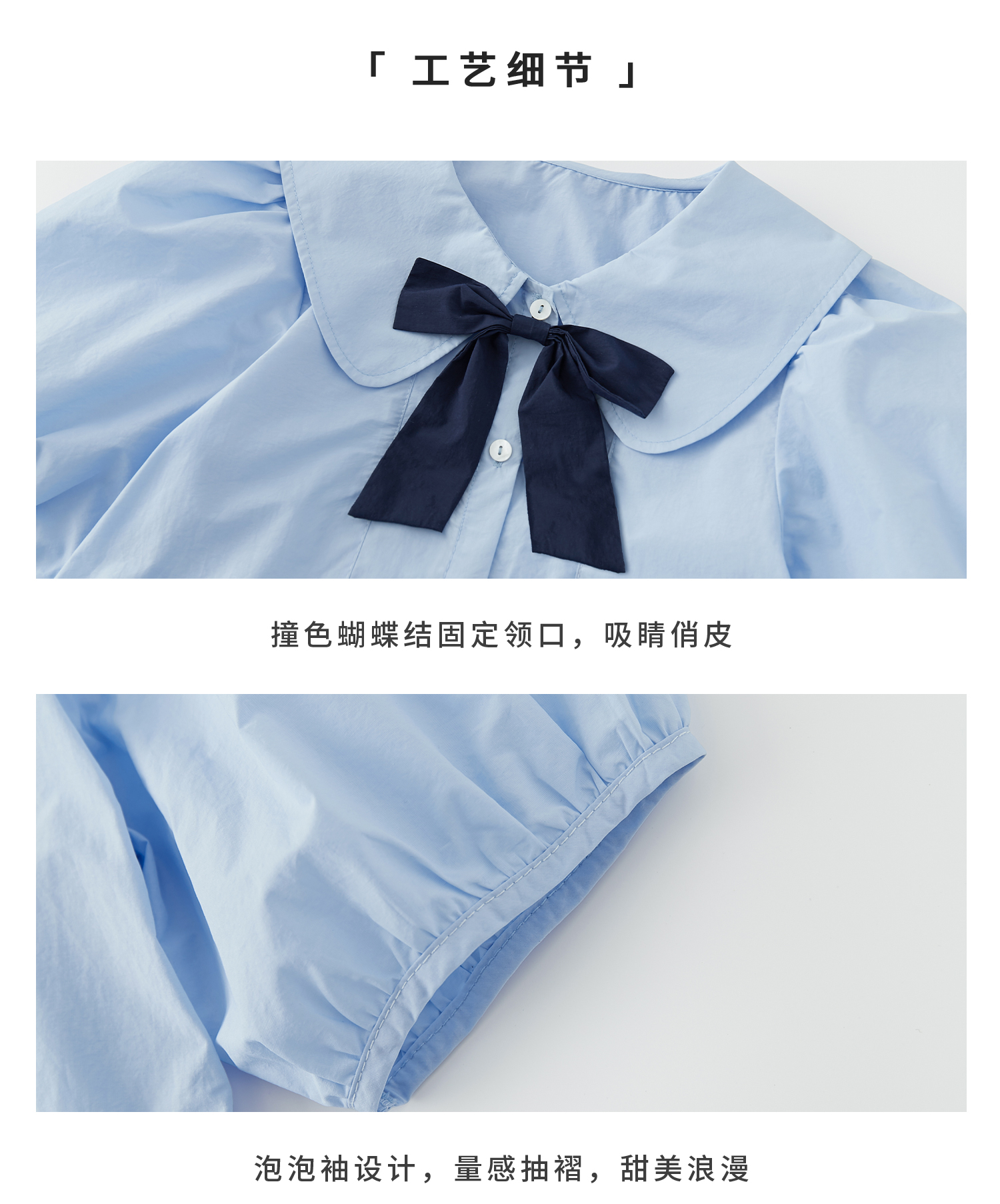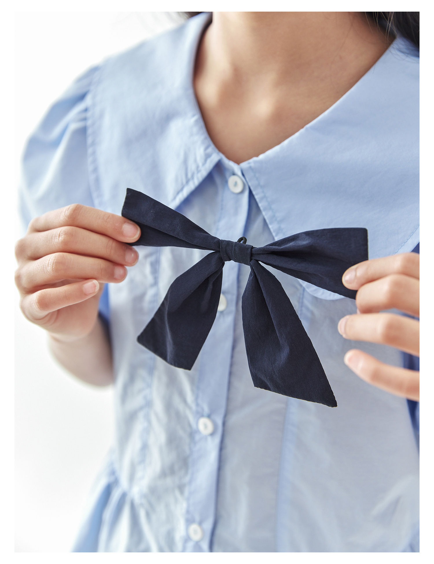 【代发】女款休闲小衫/短裤 棵初春夏款学院风套装蝴蝶领结短袖中大童上衣蓝色/短裤藏青色