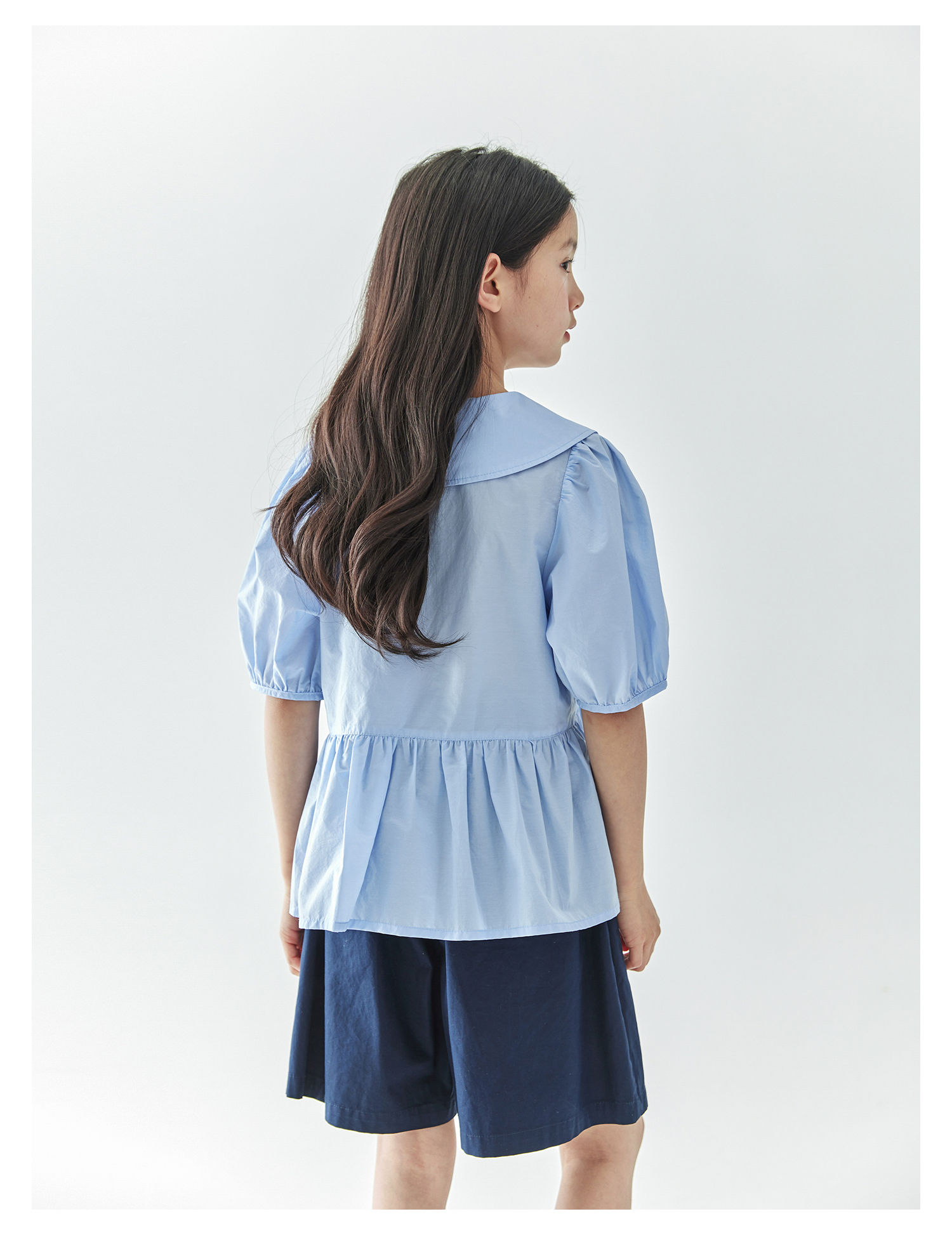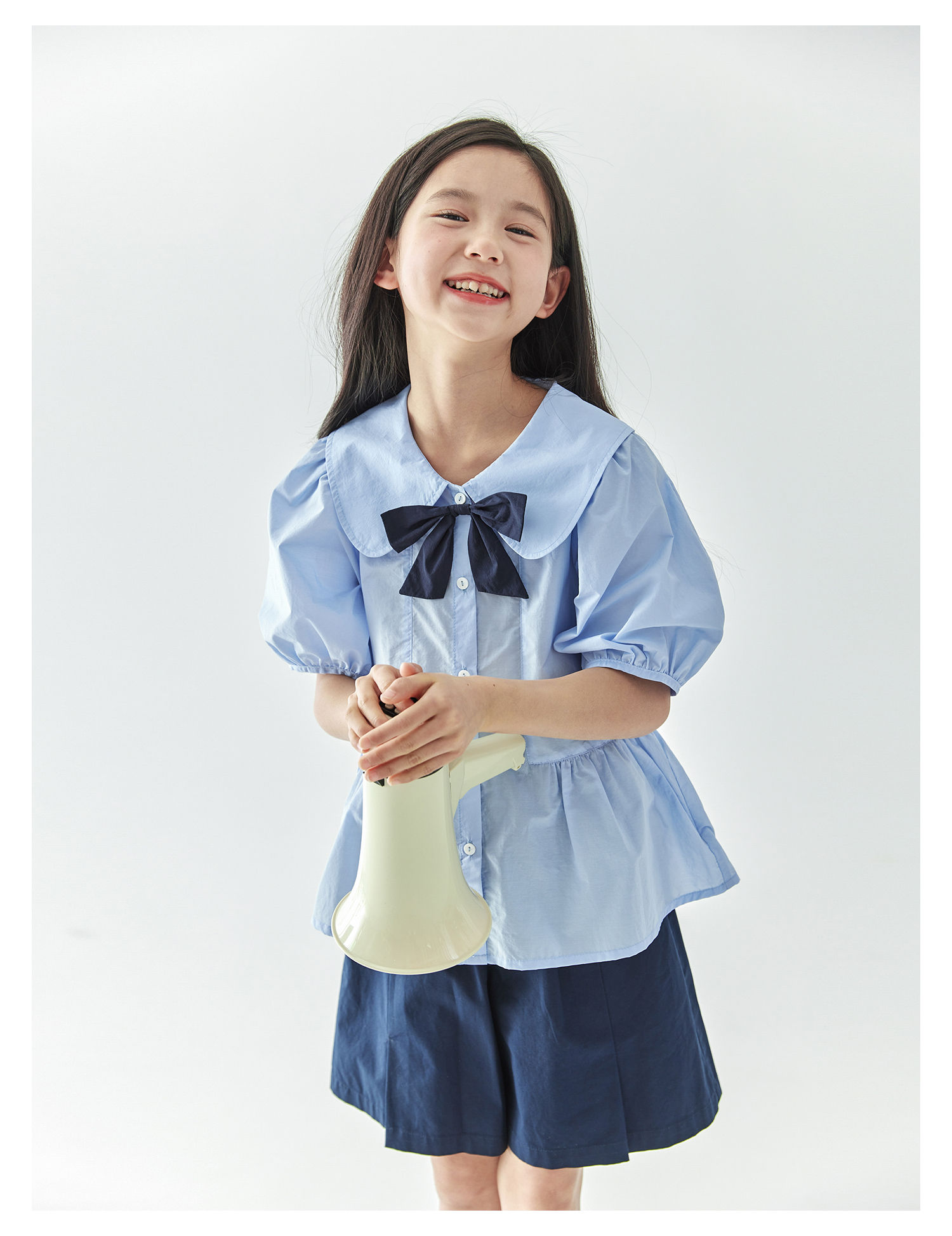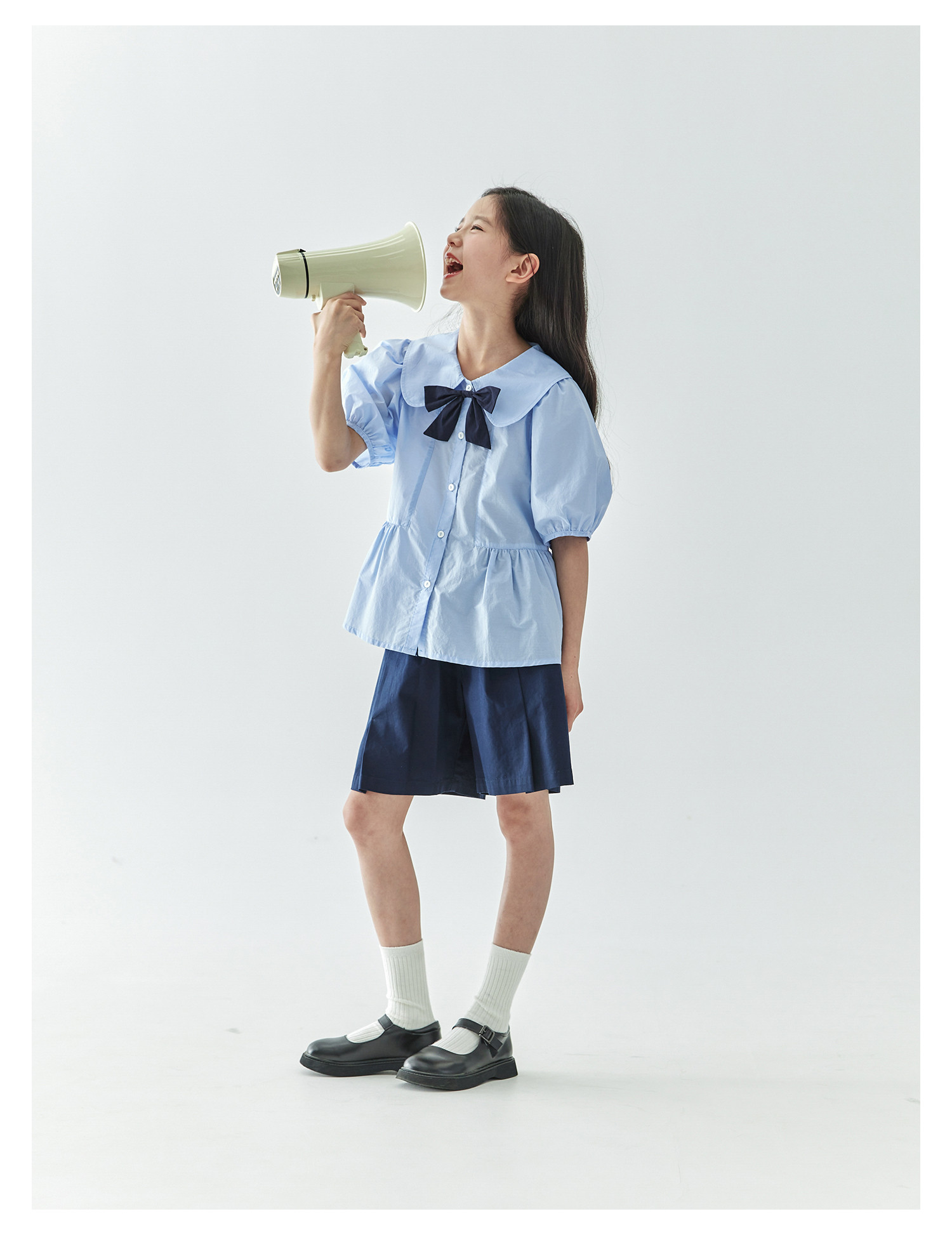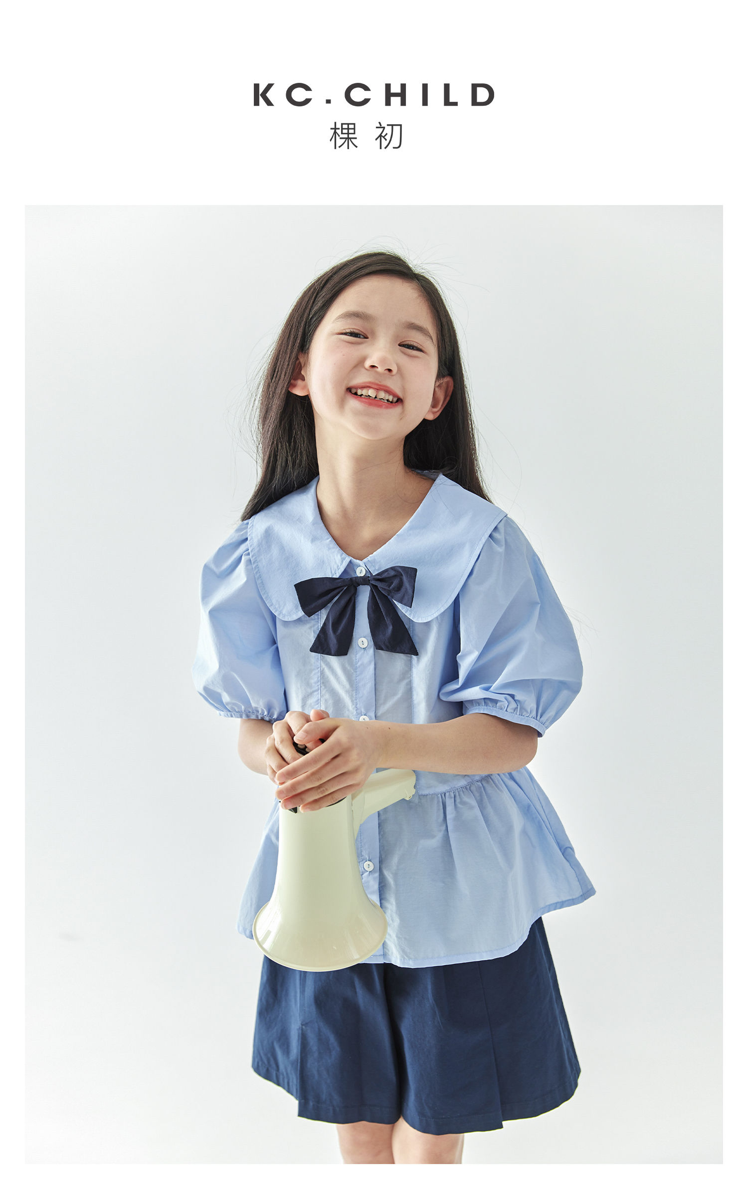 【代发】女款休闲小衫/短裤 棵初春夏款学院风套装蝴蝶领结短袖中大童上衣蓝色/短裤藏青色