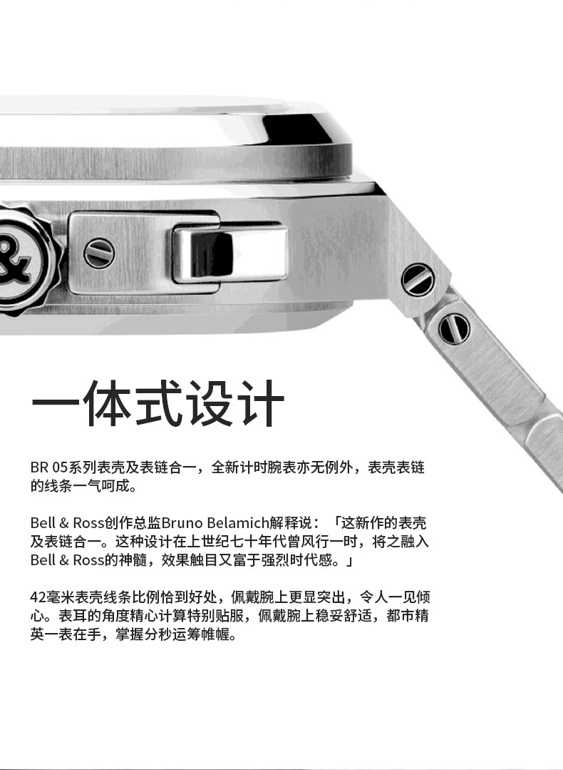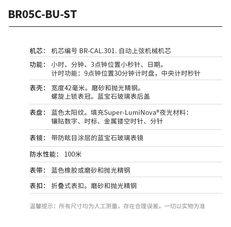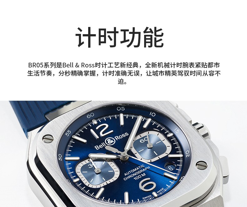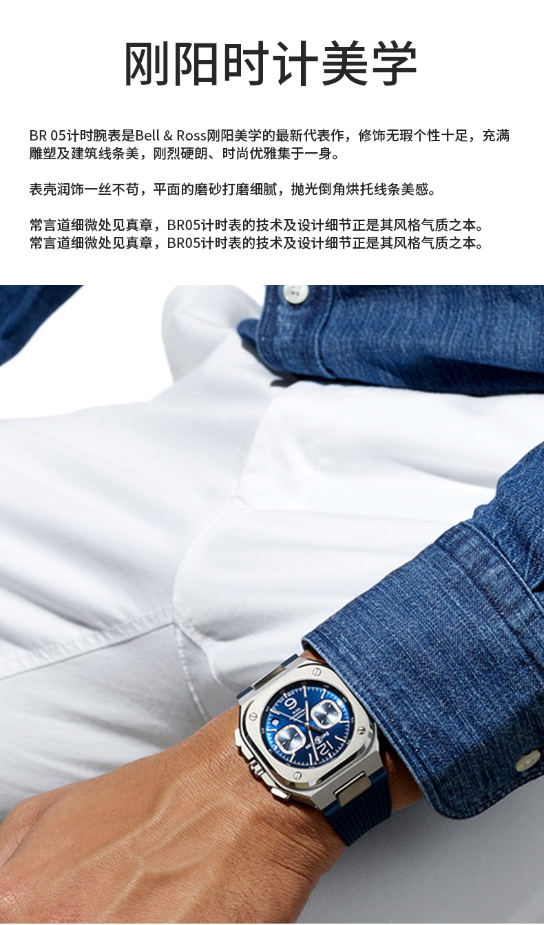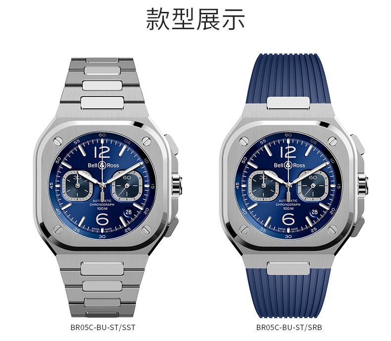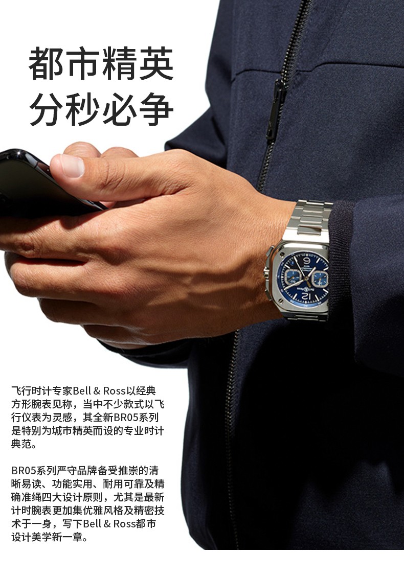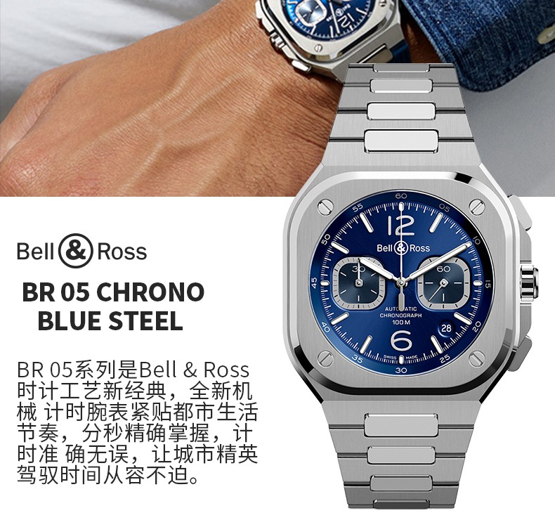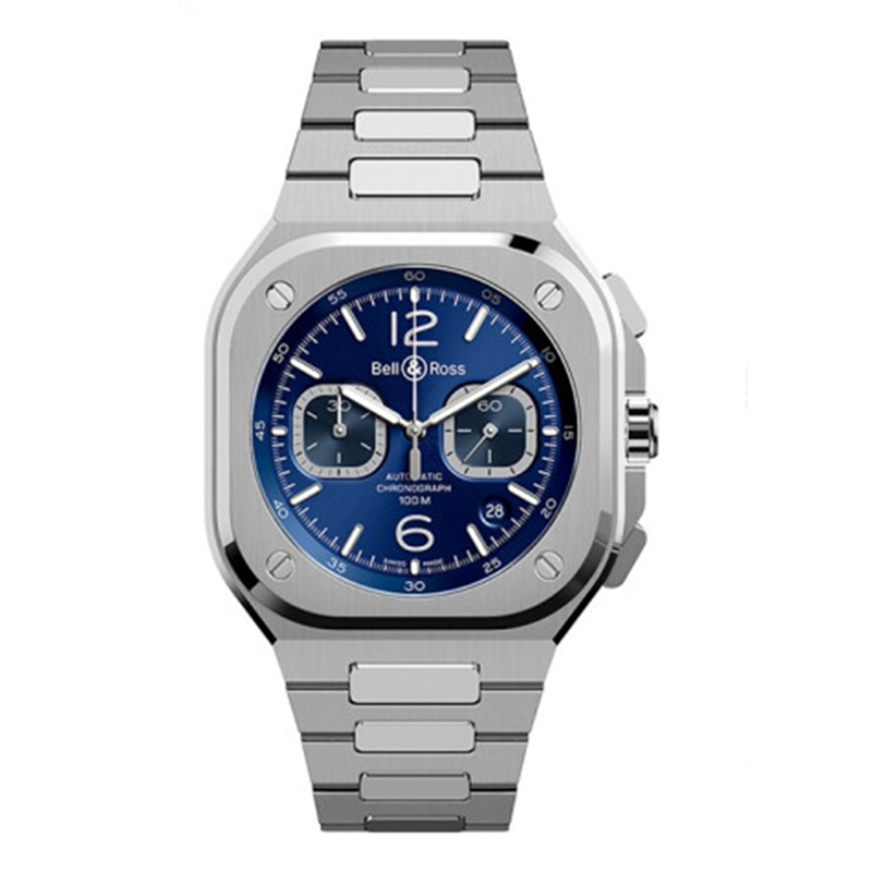 BellRoss 柏莱士 瑞士机械手表商务蓝色钢带小三针 BR05 CHRONO BLUE STEEL BR05C-BU-ST/SST
