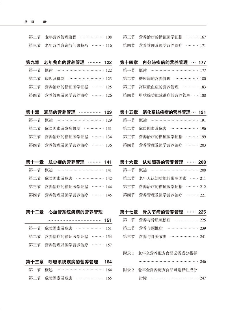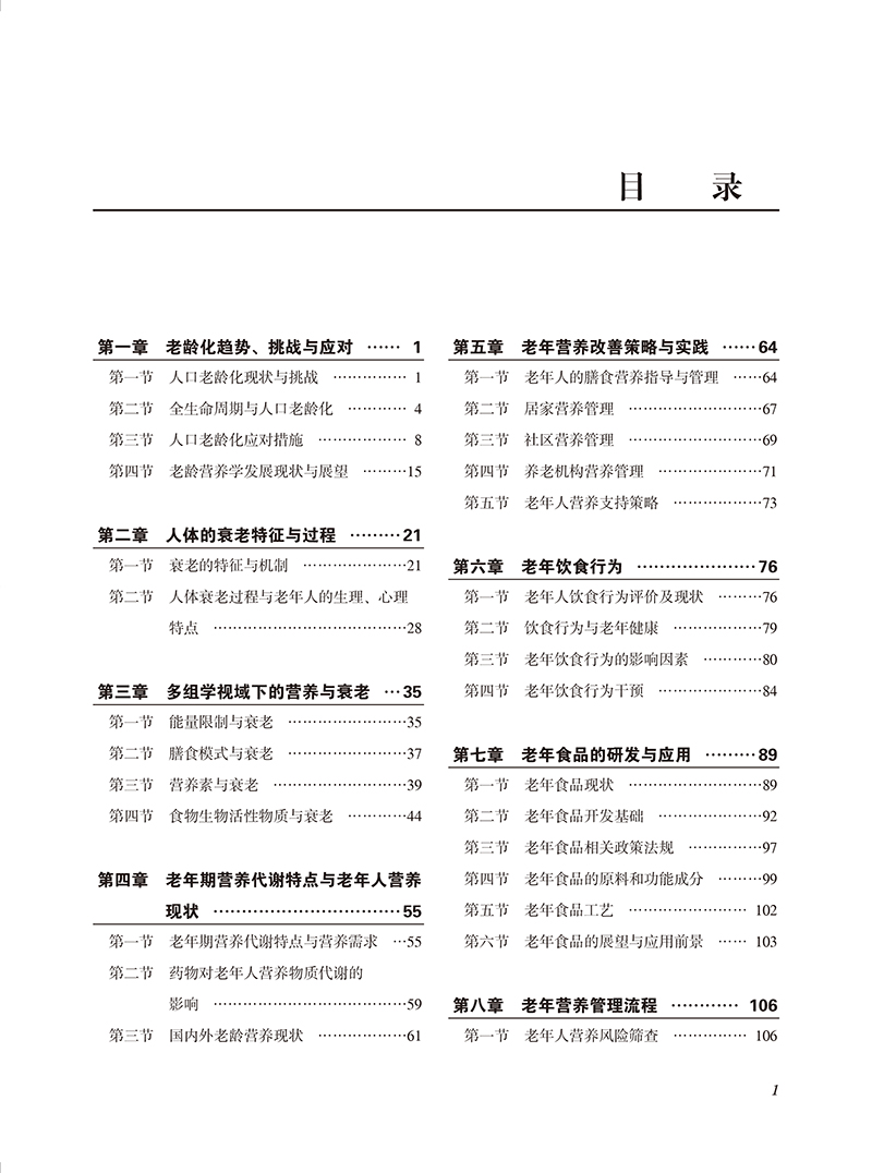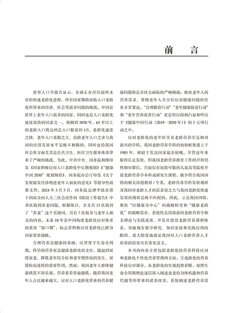 本书涵盖老年营养学基础、老年临床营养和老年营养食品三个范畴。老年营养学基础部分,从老龄化的宏观趋势着眼,沿生命全周期理论逐层深入阐述衰老给人体机能、营养代谢、以及营养、表观遗传与衰老的分子机理层面所带来的诸多改变,系统阐述老年营养需求与营养改善策略与实践。老年临床营养部分,以精准营养理论为框架,个性化临床营养治疗为核心思想,从老年营养咨询、老年人营养评估与风险筛查、危险因素控制、循证营养管理、营养药物交互作用等逐级铺展,构建并阐述临床常见老年相关疾病的营养管理方案,并辅以案例分析。老年营养食品部分,针对老年营养的落地载体——老年食品的现状、开发基础、发展与应用前景进行介绍。并将老年营养研究与实践应用中的常用工具(如DIRs和筛查量表等)附于附录,以便读者参阅使用。