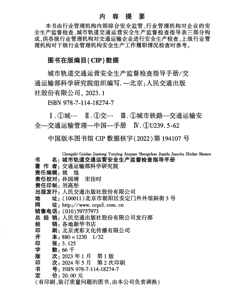 书名:城市轨道交通运营安全生产监督检查指导手册