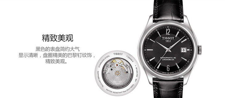 镜面 材质 | 蓝宝石水晶玻璃 | 表盘 | 精钢表壳 黑色表盘 大三针 日期显示 阿拉伯数字与条字刻度时标 |