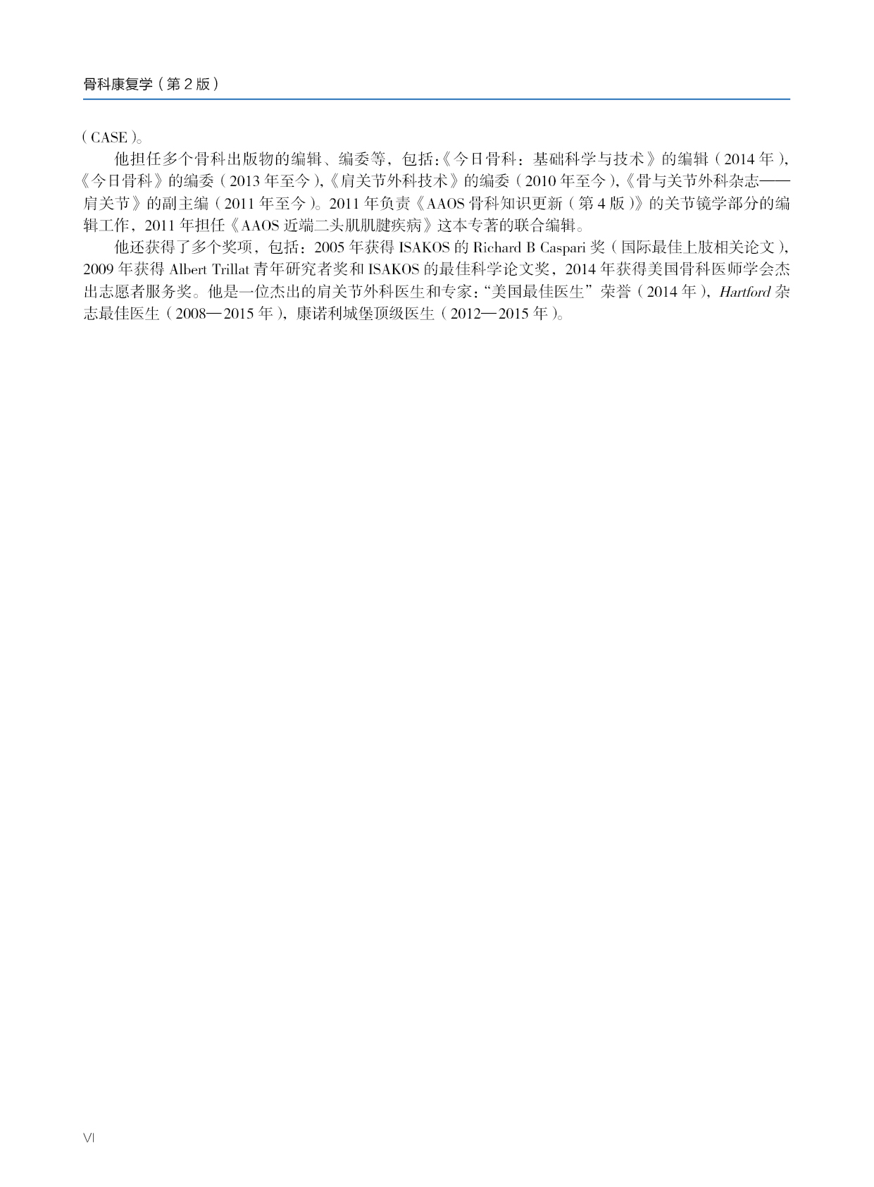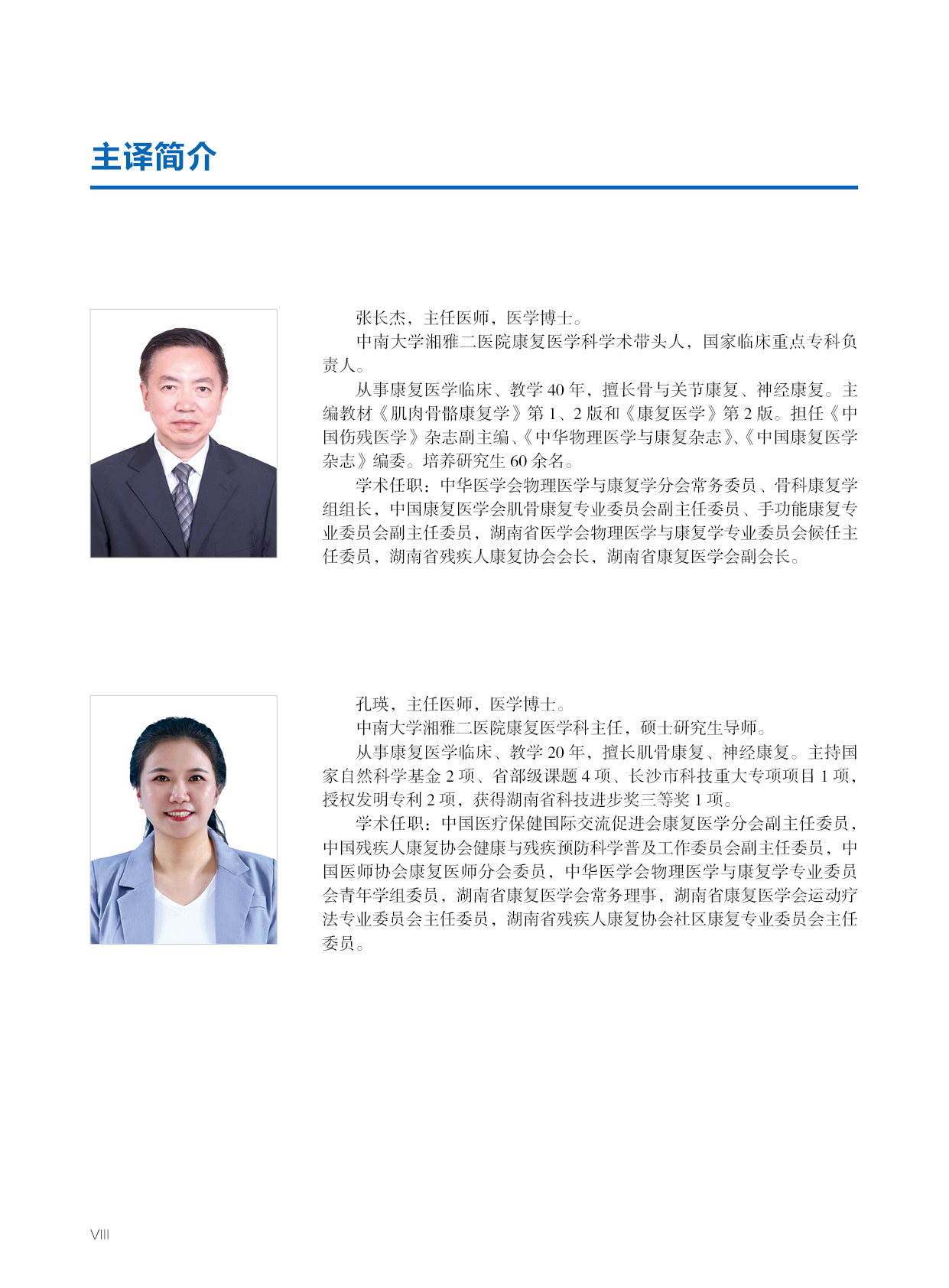 张长杰,主任医师,医学博士。中南大学湘雅二医院康复医学科学术带头人,国家临床重点专科负责人。从事康复医学临床、教学 40年,擅长骨与关节康复、神经康复。主编教材《肌肉骨骼康复学》第 1、2 版和《康复医学》第 2 版。担任《中国伤残医学》杂志副主编、《中华物理医学与康复杂志》、《中国康复医学杂志》编委。培养研究生 60 余名。学术任职:中华医学会物理医学与康复学分会常务委员、骨科康复学组组长,中国康复医学会肌骨康复专业委员会副主任委员、手功能康复专业委员会副主任委员,湖南省医学会物理医学与康复学专业委员会候任主任委员,湖南省残疾人康复协会会长,湖南省康复医学会副会长。 孔瑛,主任医师,医学博士。中南大学湘雅二医院康复医学科主任,硕士研究生导师。从事康复医学临床、教学 20 年,擅长肌骨康复、神经康复。主持国家自然科学基金 2 项、省部级课题 4 项、长沙市科技重大专项项目 1 项,授权发明专利 2 项,获得湖南省科技进步奖三等奖 1 项。学术任职:中国医疗保健国际交流促进会康复医学分会副主任委员,中国残疾人康复协会健康与残疾预防科学普及工作委员会副主任委员,中国医师协会康复医师分会委员,中华医学会物理医学与康复学专业委员会青年学组委员,湖南省康复医学会常务理事,湖南省康复医学会运动疗法专业委员会主任委员,湖南省残疾人康复协会社区康复专业委员会主任委员。