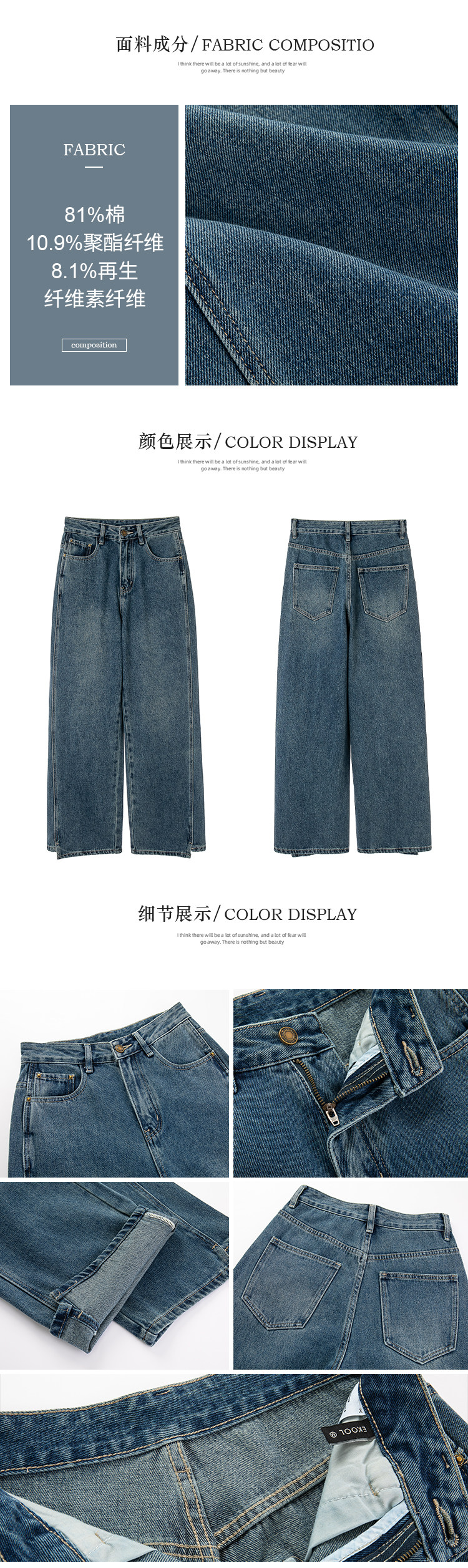 EKOOL衣库 水洗复古高腰牛仔裤女夏季宽松百搭显瘦阔腿直筒长裤子