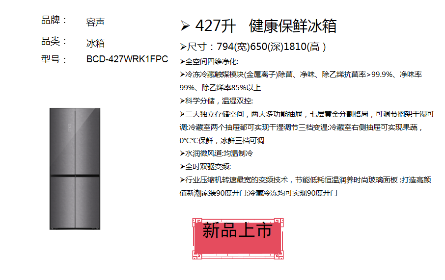 容声 冰箱 BCD-427WRK1FPC 427升 变频 风冷 一级能效 十字四门 玻璃面板 槿绣瑜
