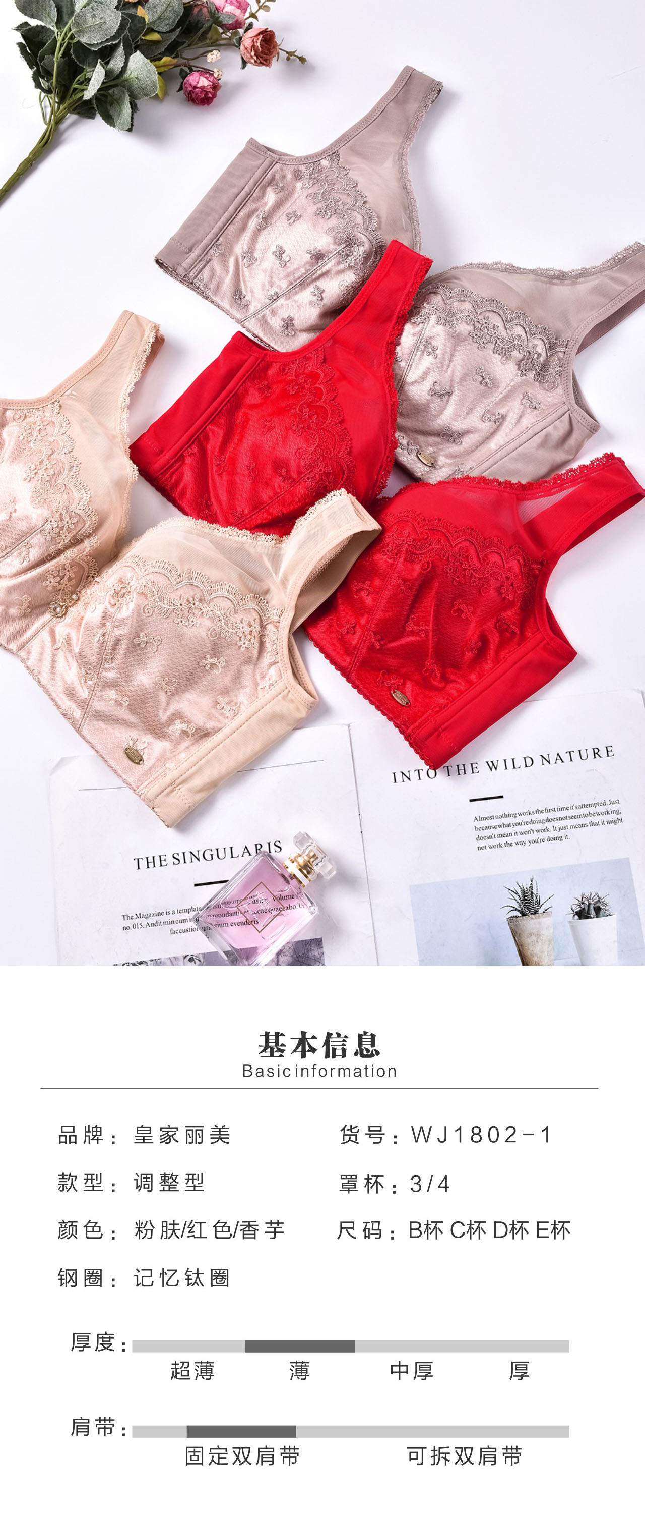 【秒杀品不退不换】皇家丽美3/4薄款棉杯记忆钛圈文胸透气蕾丝花边WJ1802-1