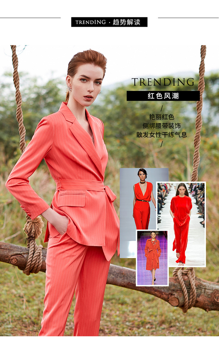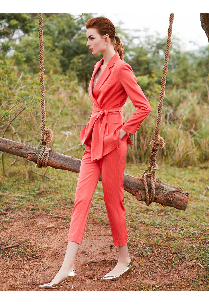 IWY/红色职业装女细条纹西装套装系带收腰西服商务OLCP9313