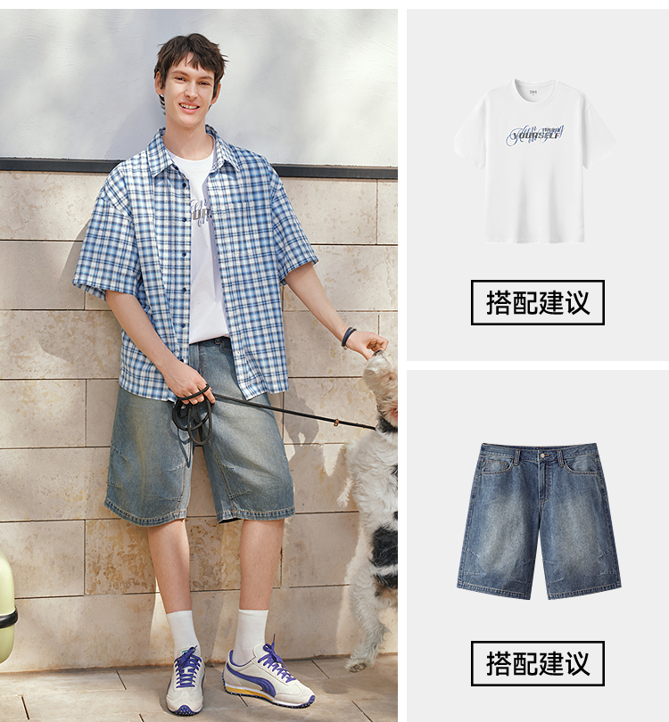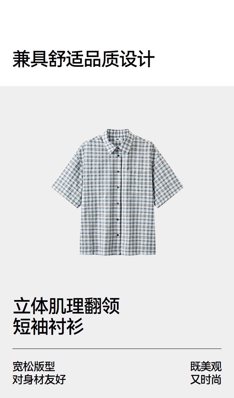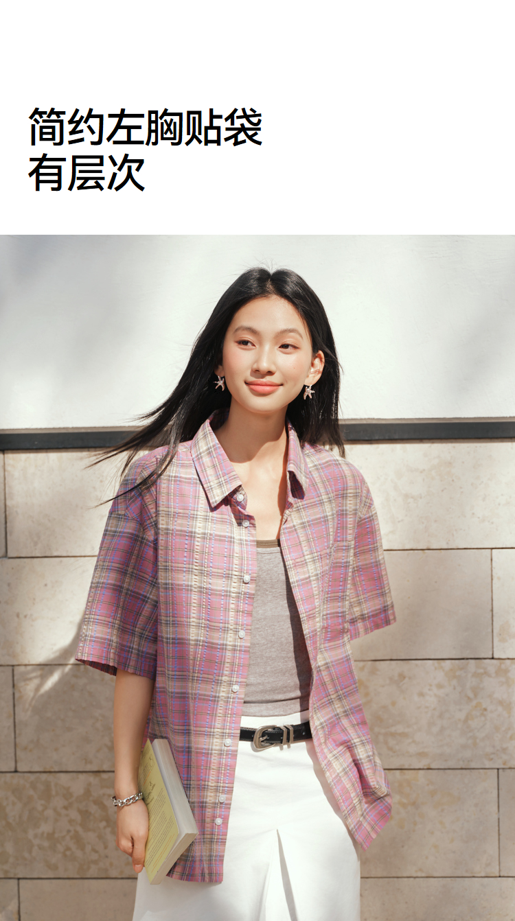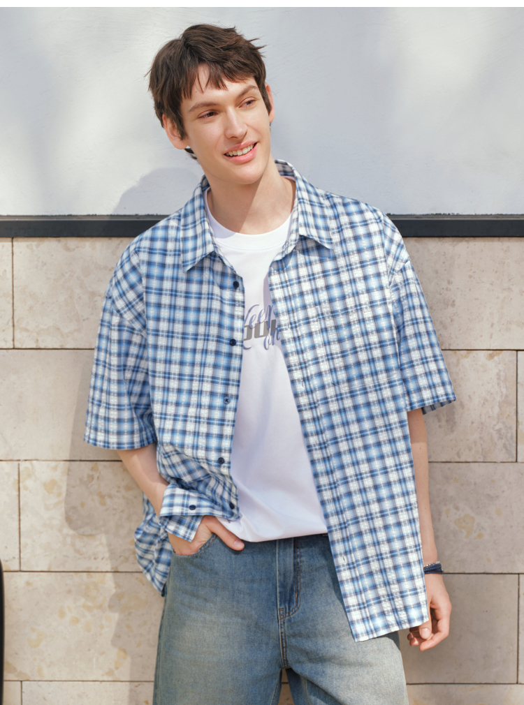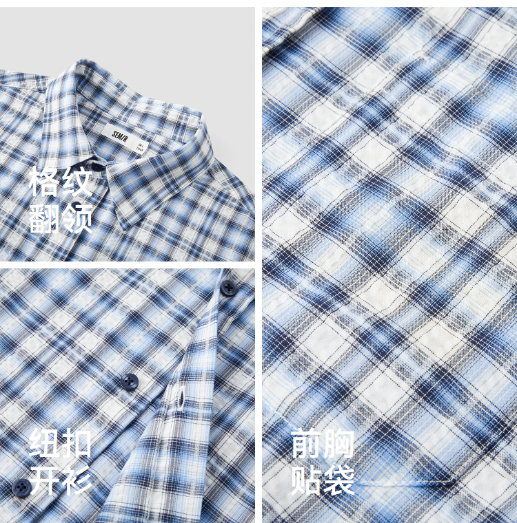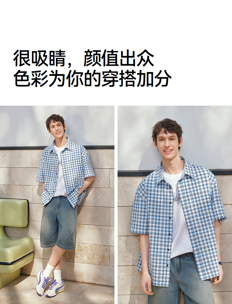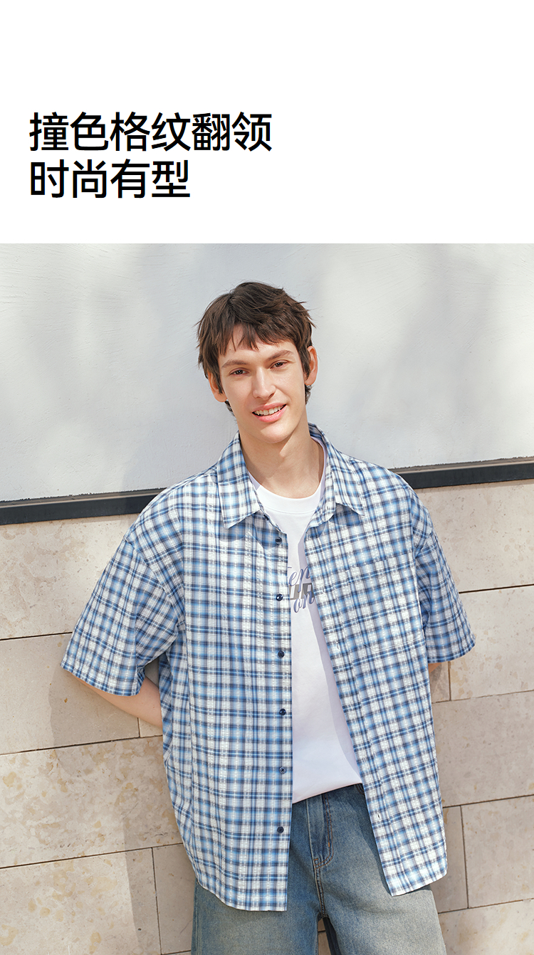 森马短袖衬衫男夏宽松格纹翻领上衣2026新款时尚贴袋衬衣休闲百搭