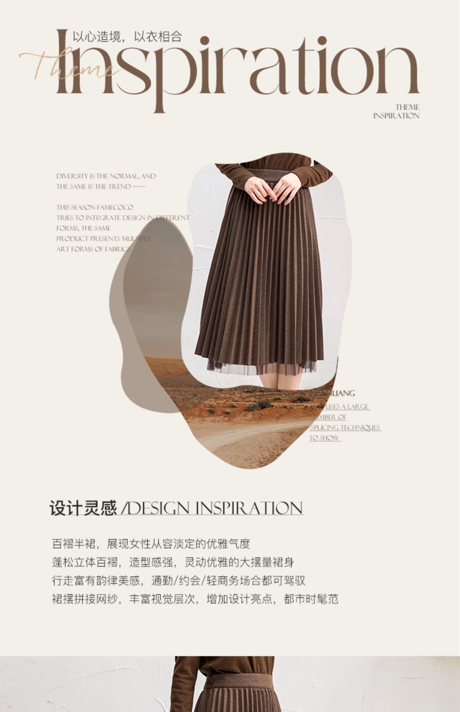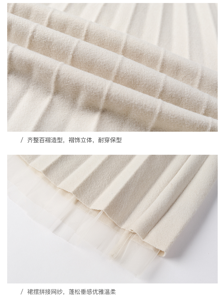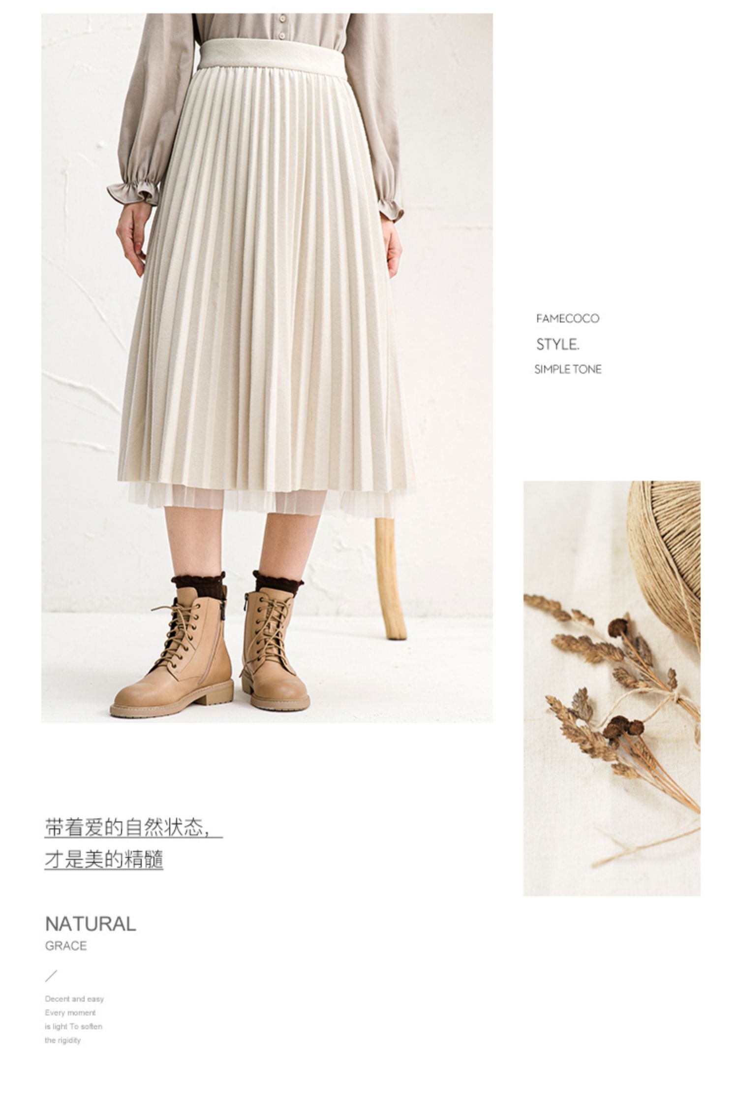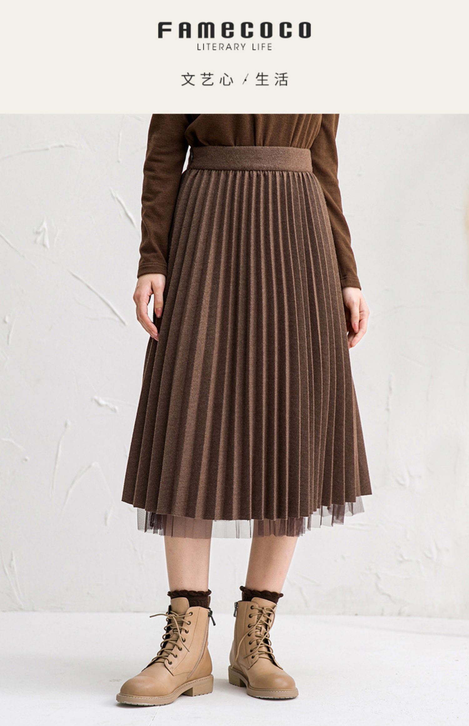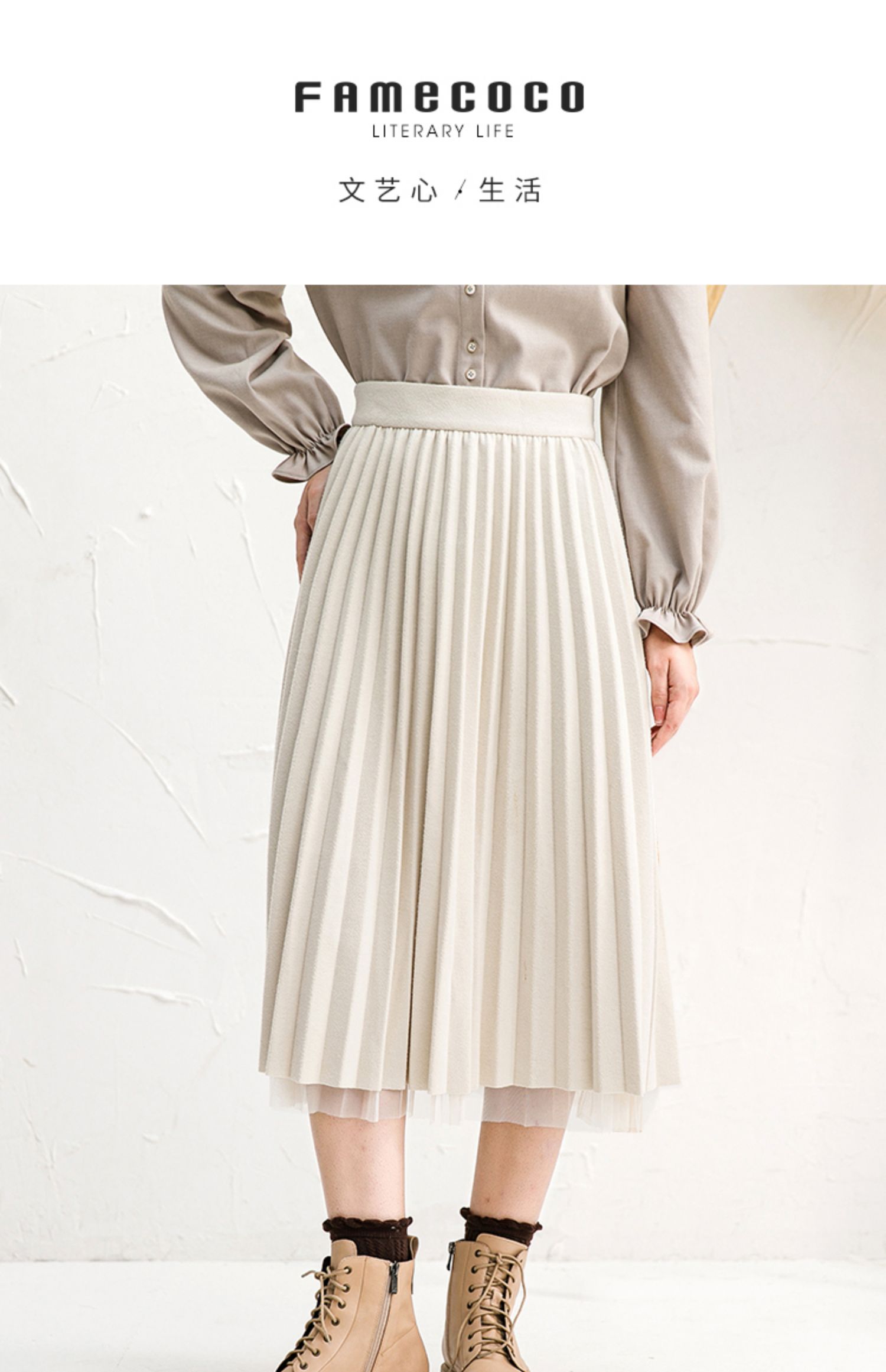 Famecoco范可儿纯色半身裙女秋冬季网纱拼接百褶裙F218HA004