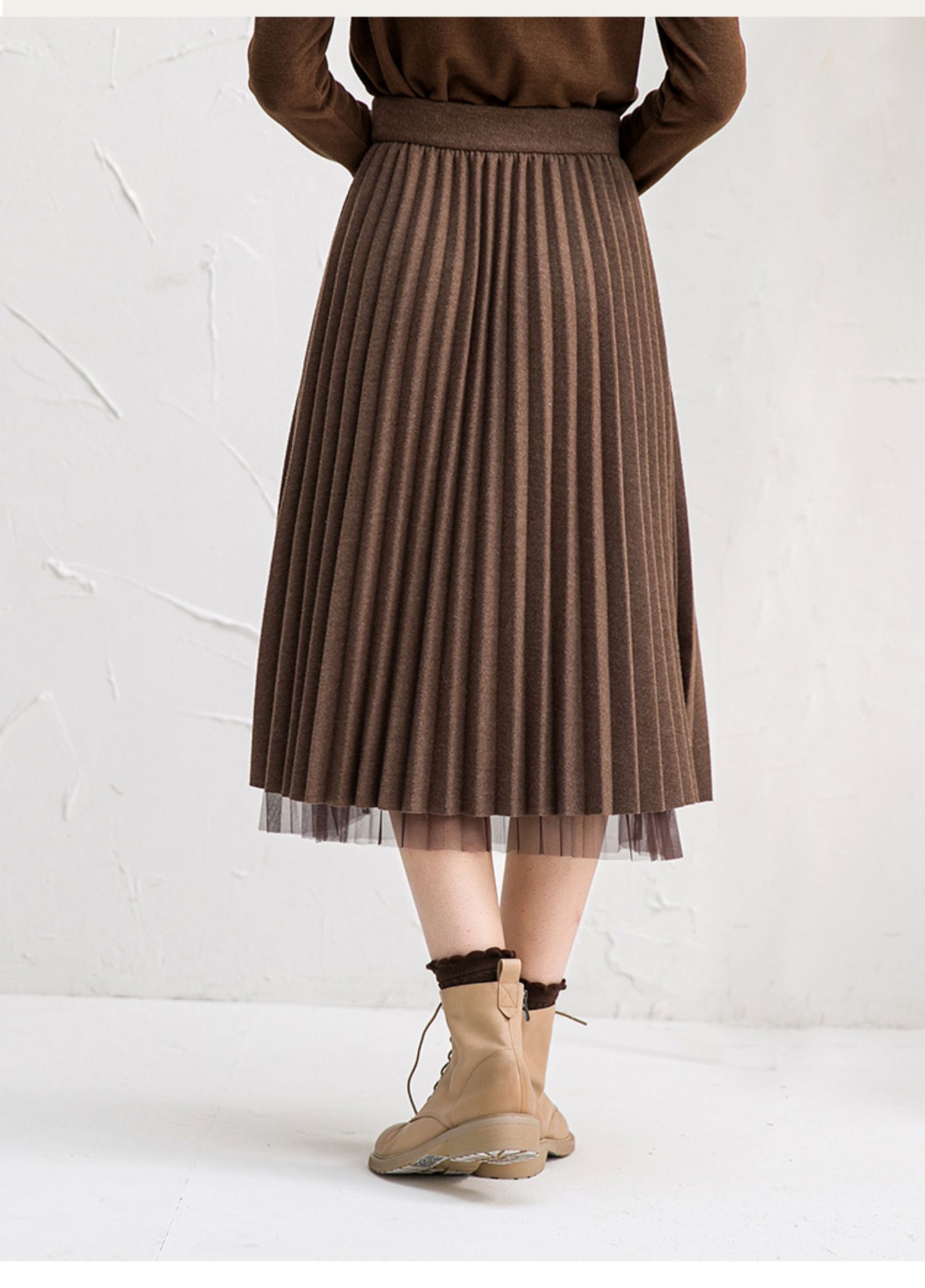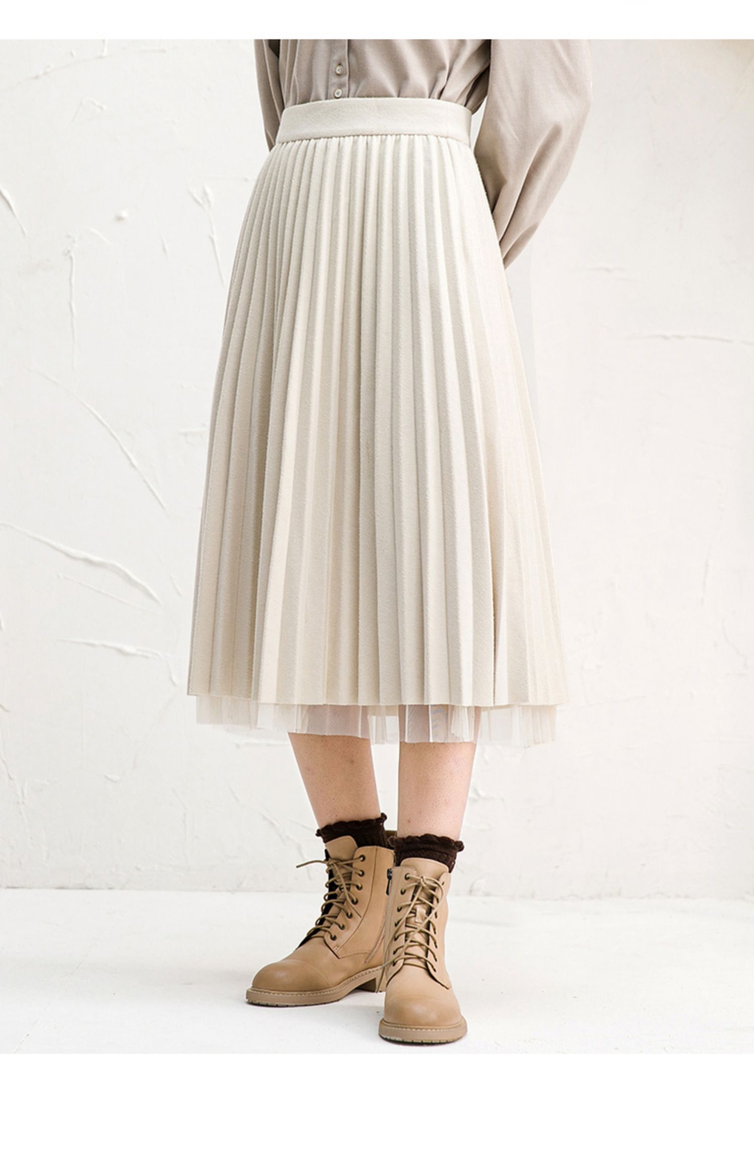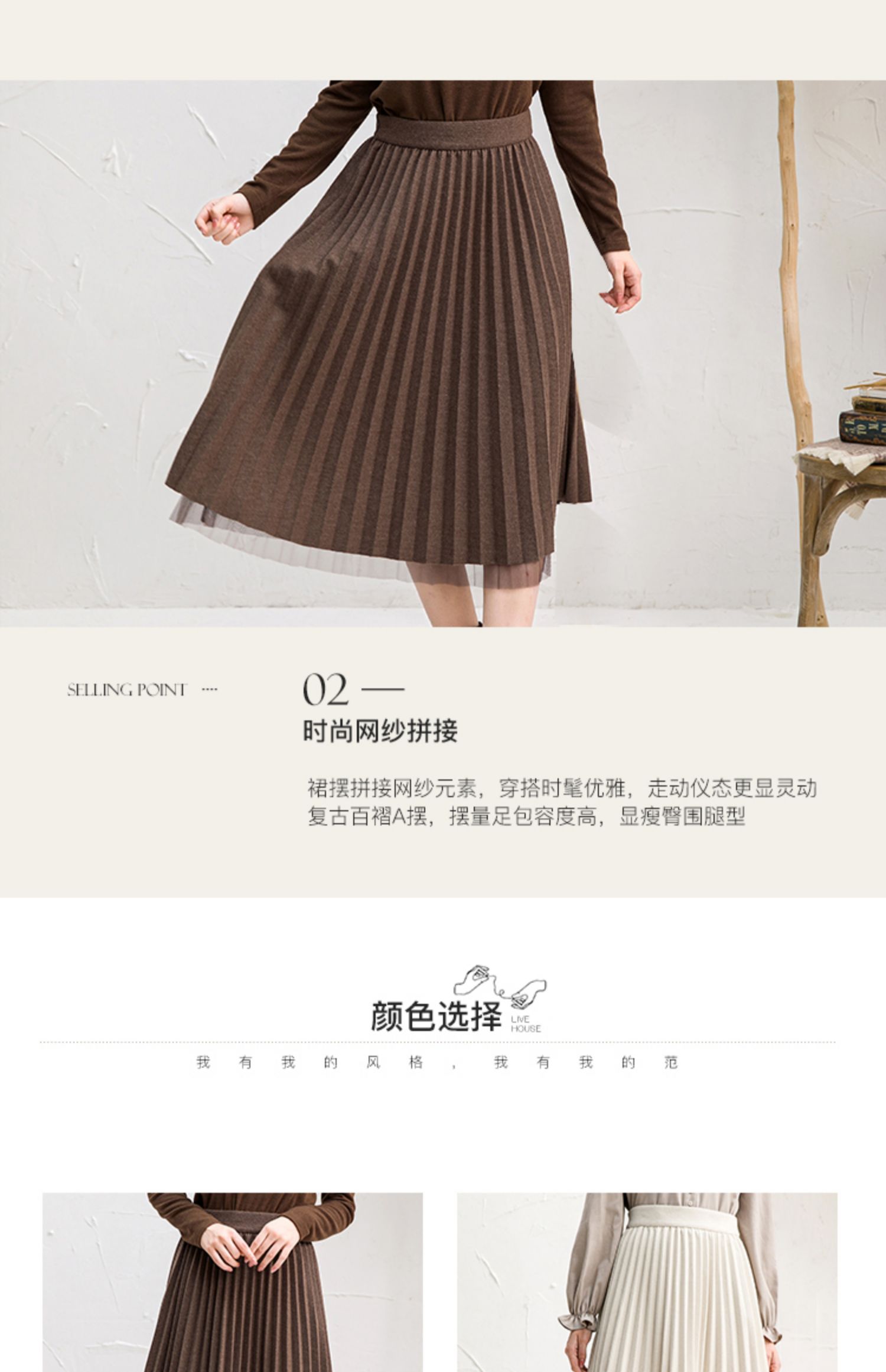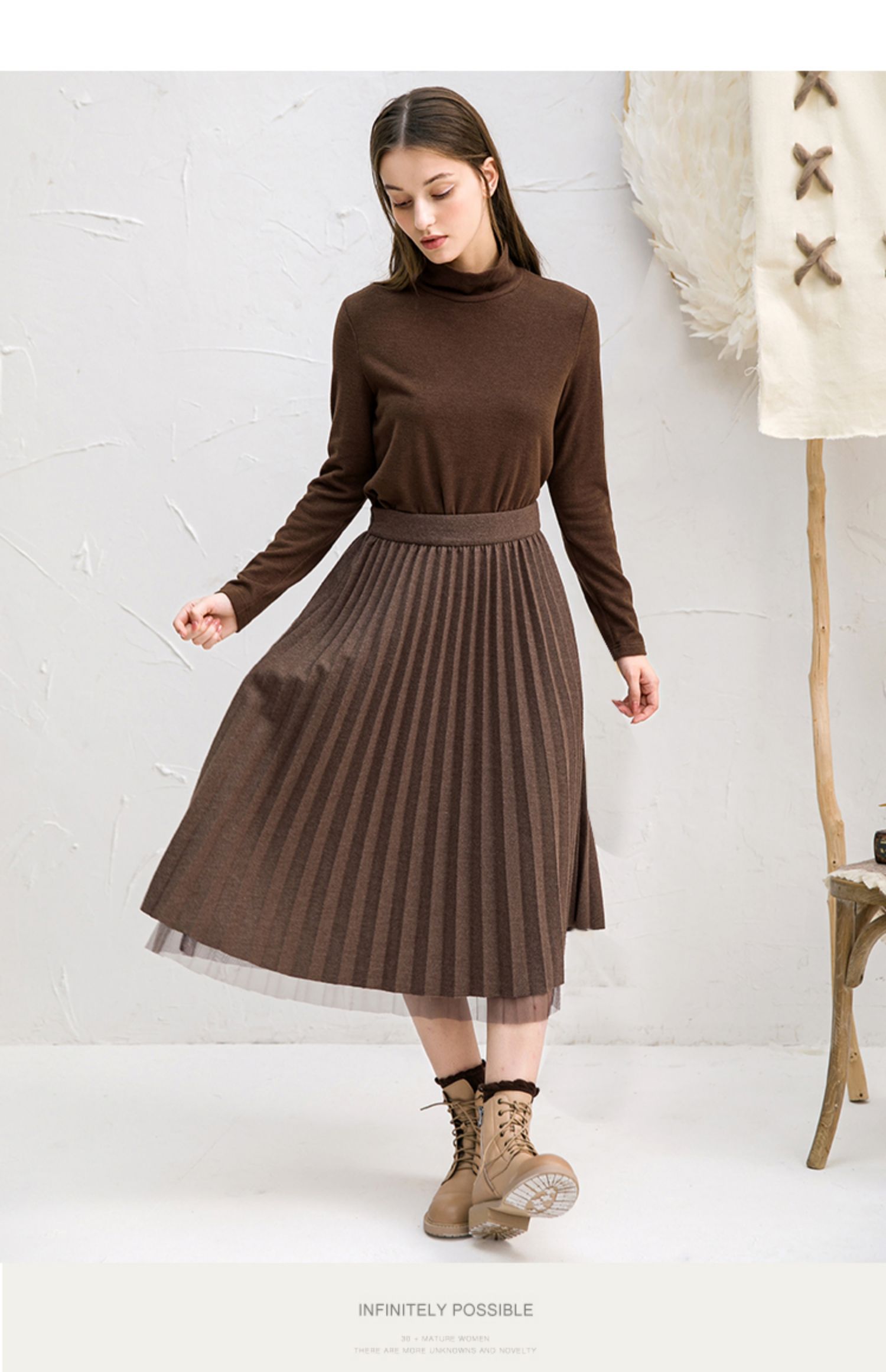Famecoco范可儿纯色半身裙女秋冬季网纱拼接百褶裙F218HA004