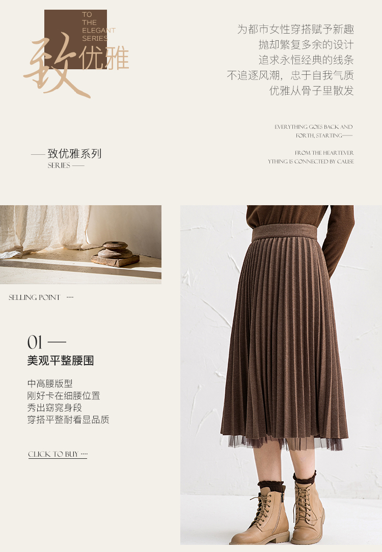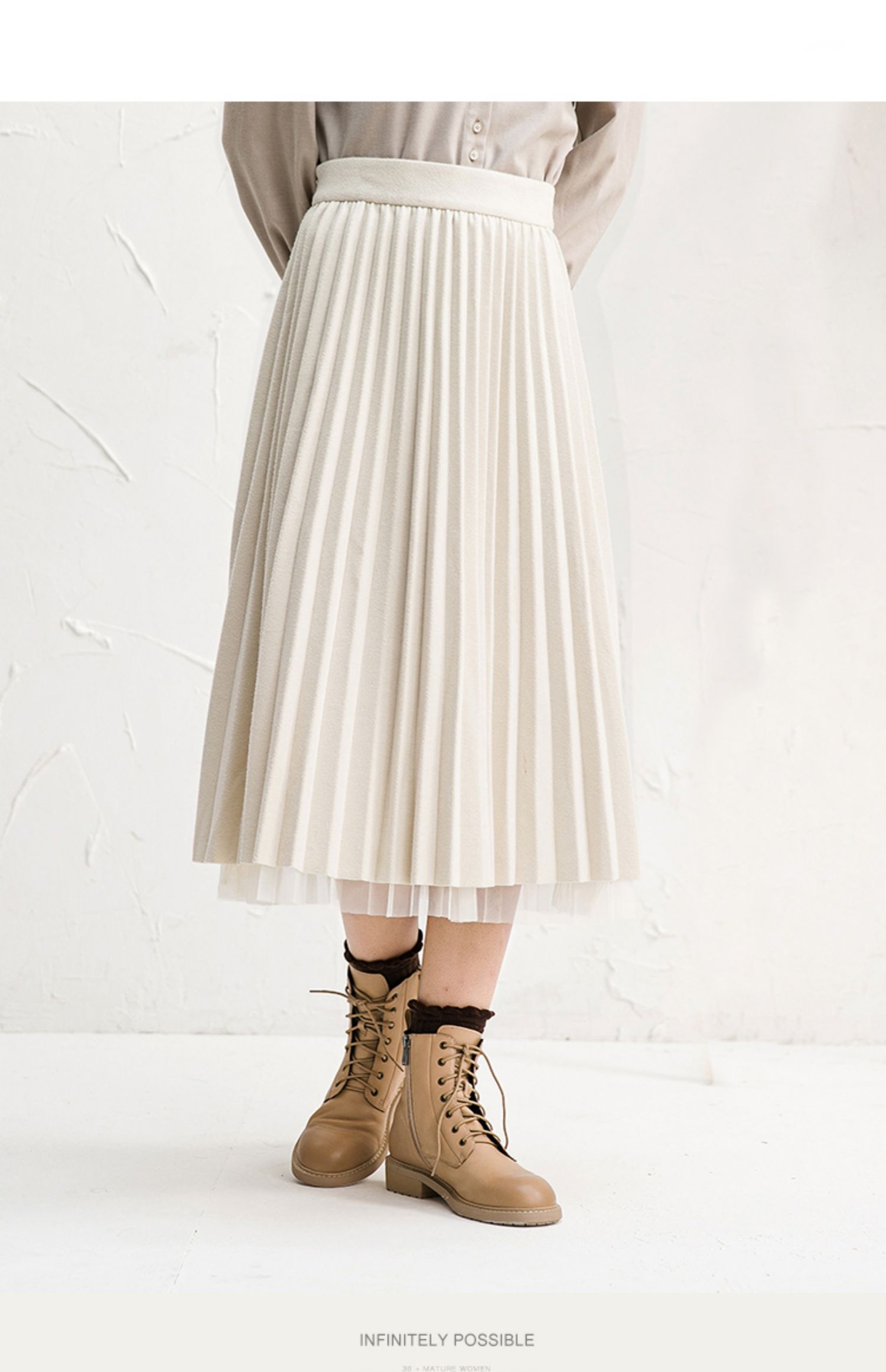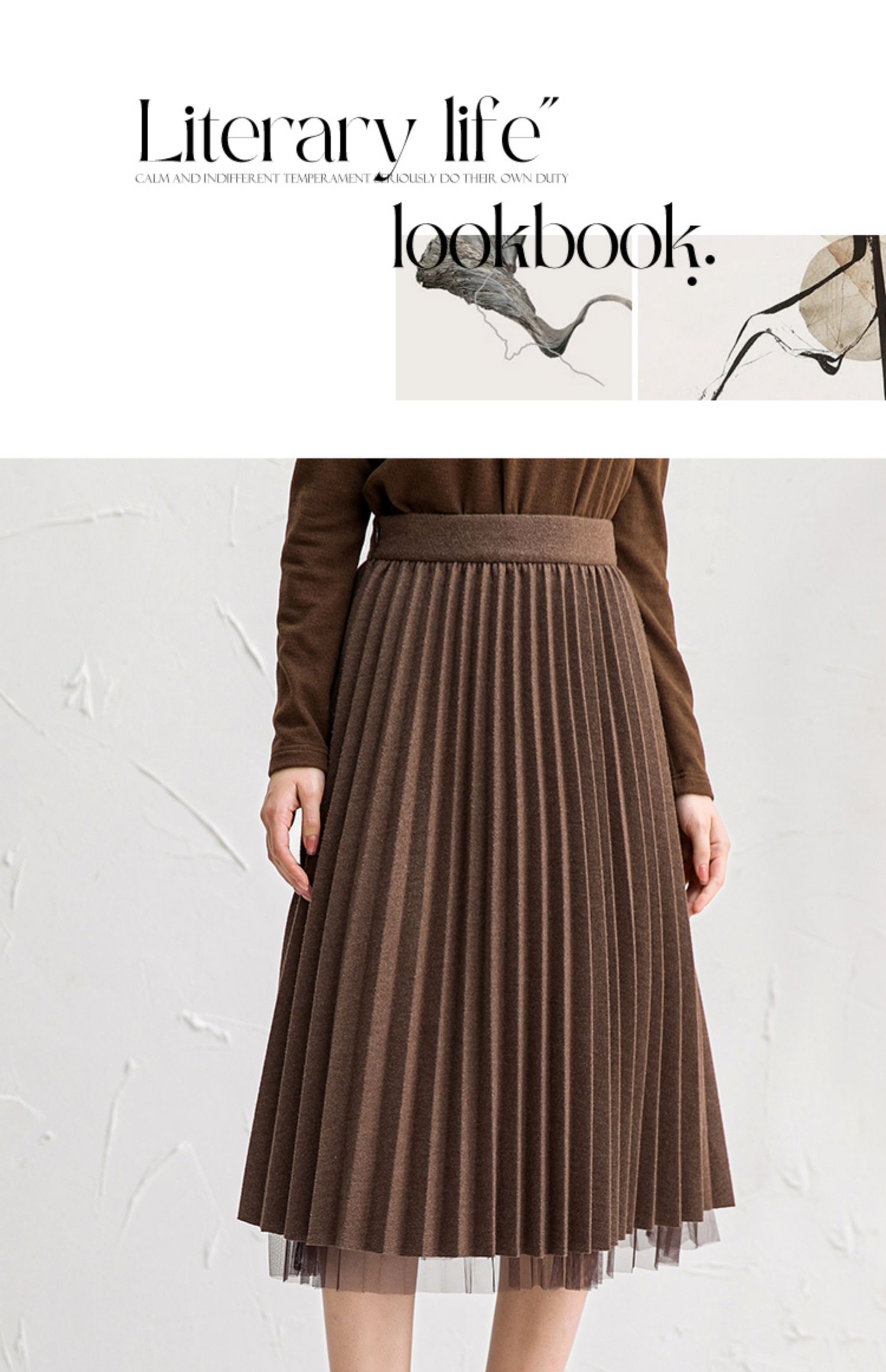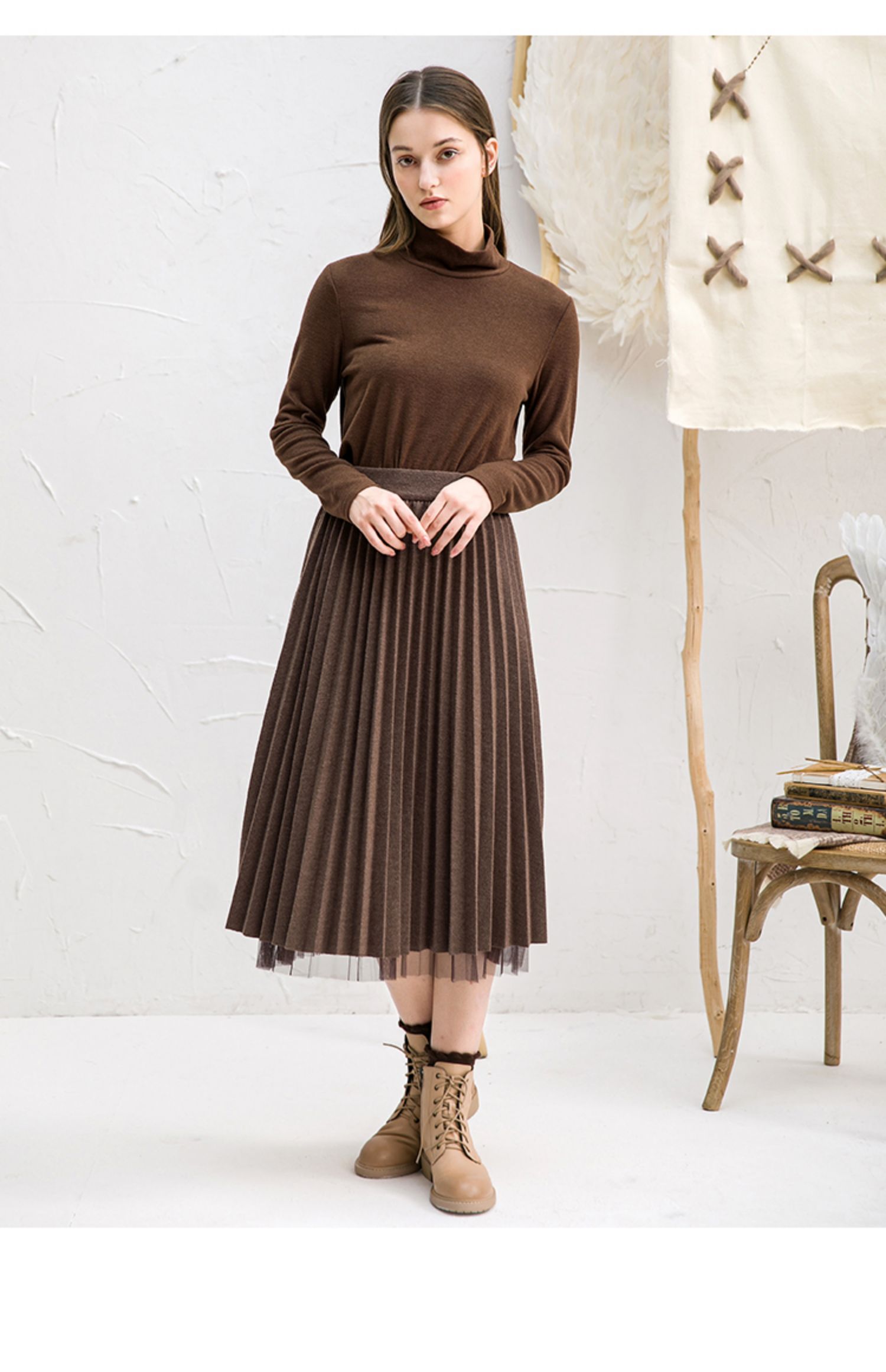 Famecoco范可儿纯色半身裙女秋冬季网纱拼接百褶裙F218HA004