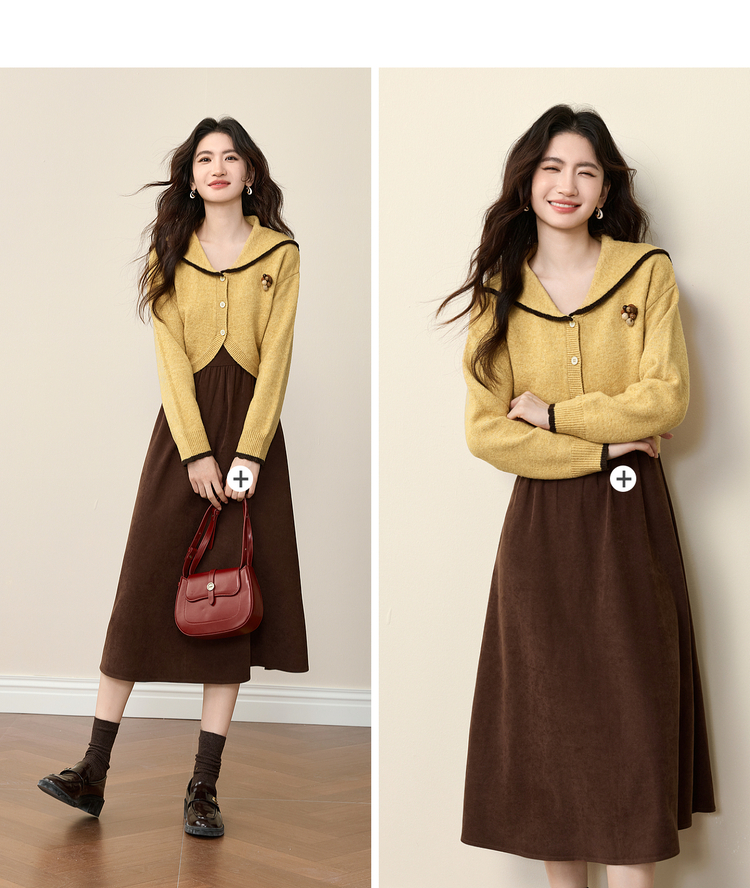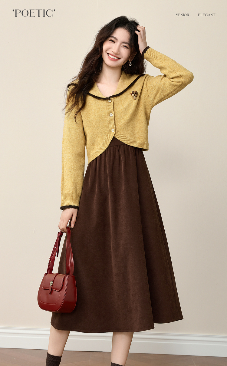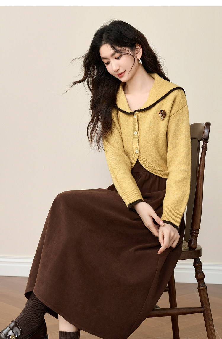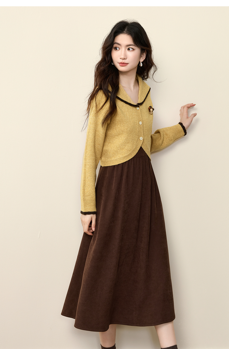【12/10新品6折】熙世界千金感可露丽风套装女装秋冬短款翻领毛衣磨毛连衣裙两件套