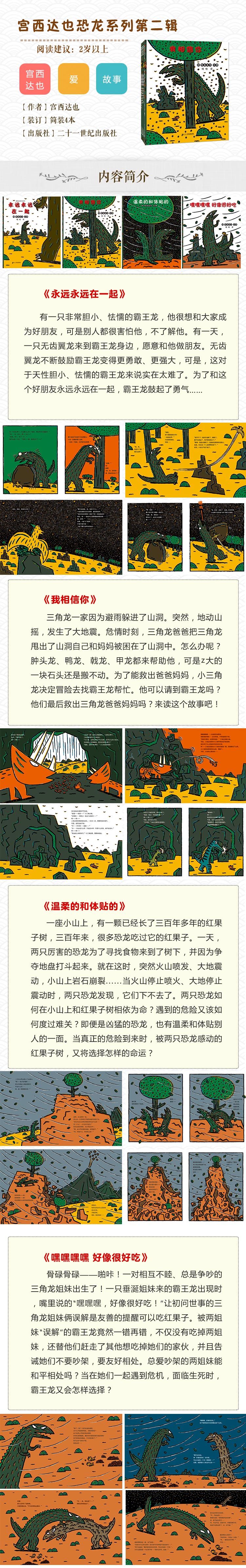 有一只非常胆小、怯懦的霸王龙,他很想和大家成为好朋友,可是别人都很害怕他,不了解他。有一天,一只无齿翼龙来到霸王龙身边,愿意和他做朋友。无齿翼龙不断鼓励霸王龙变得更勇敢、更强大,可是,这对于天性胆小、怯懦的霸王龙来说实在太难了。为了和这个好朋友永远永远在一起,霸王龙鼓起了勇气……