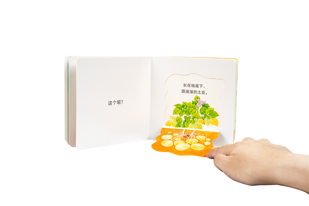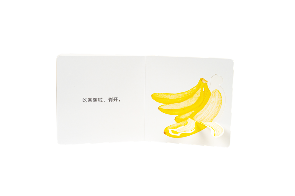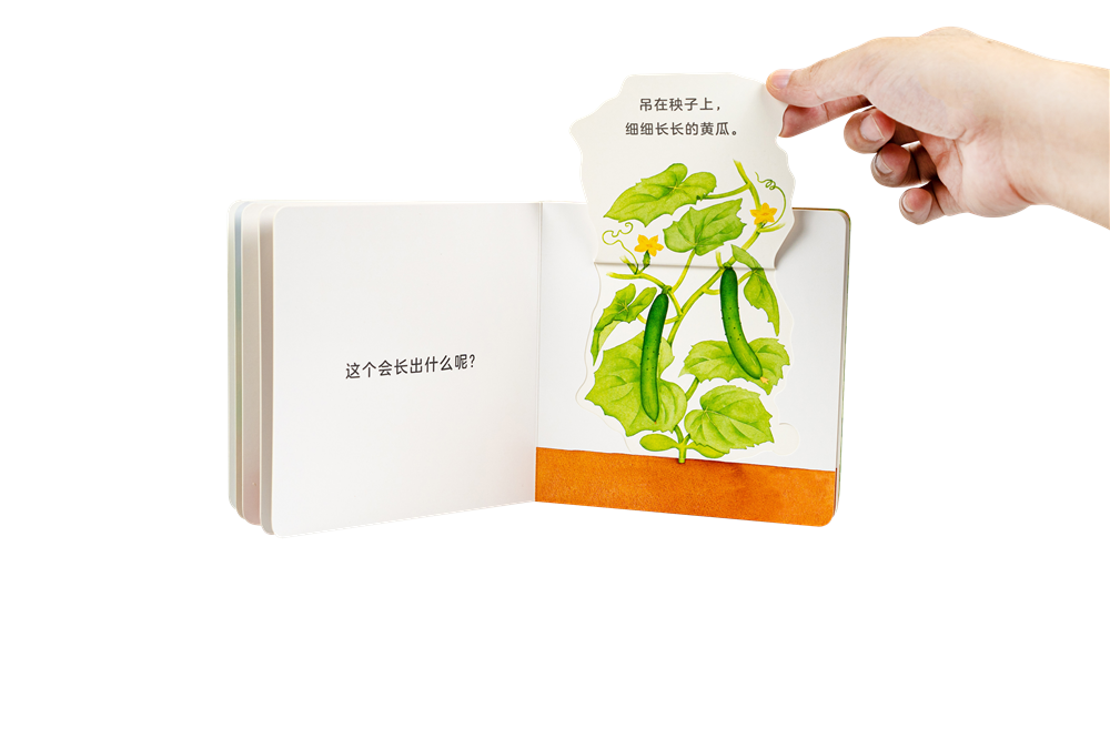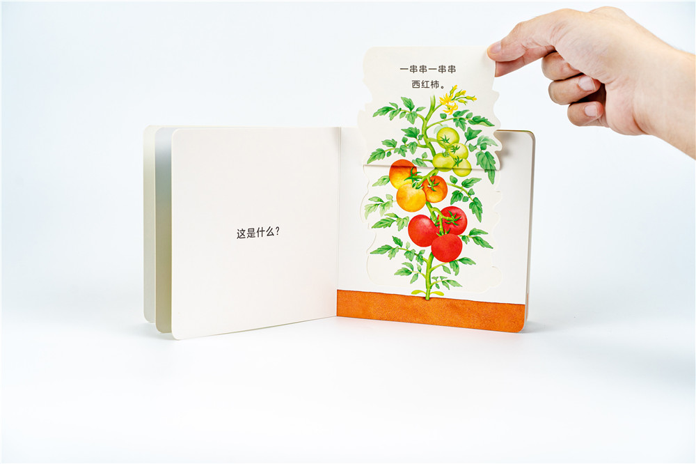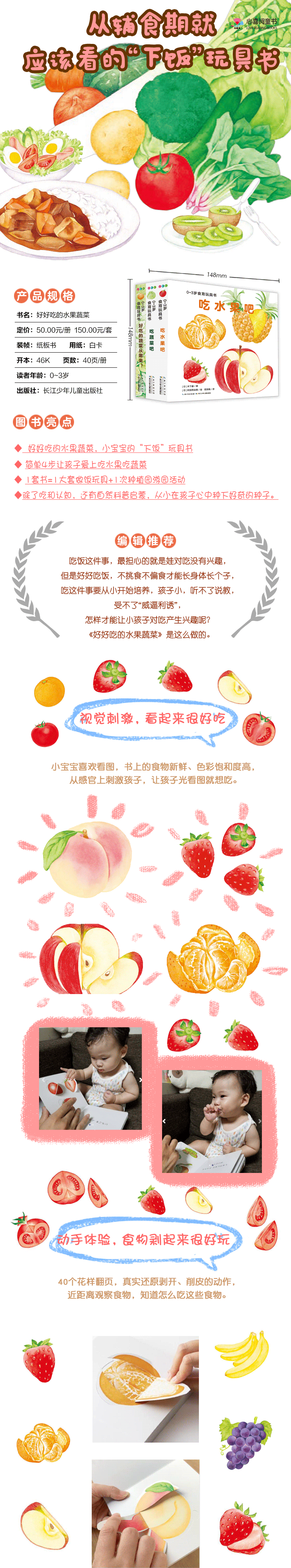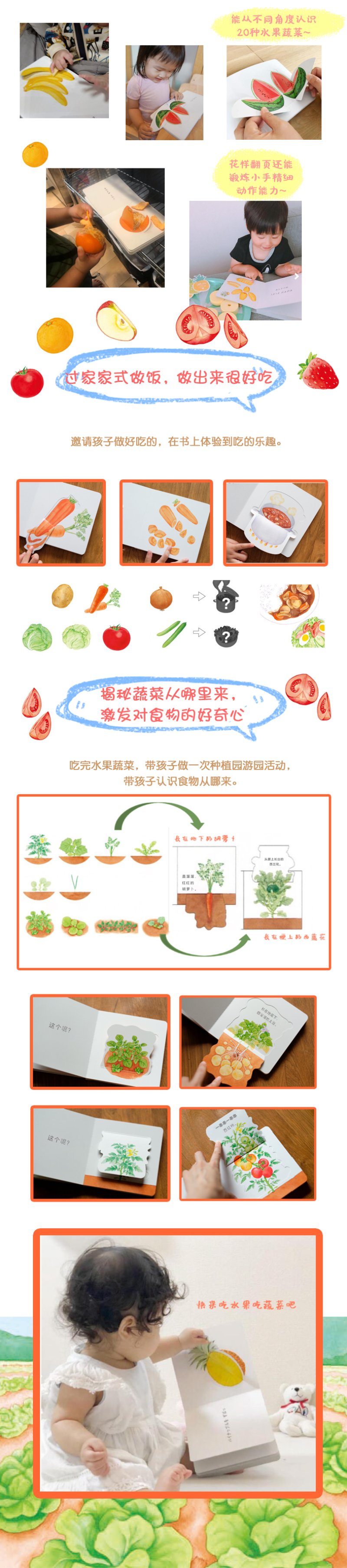 《好好吃的水果蔬菜》是一套引导低龄宝宝去看食物、玩食物、探索食物的玩具书。它首先根据这个年龄段孩子对图片感兴趣的特点,用鲜艳的、水灵灵的水果蔬菜从感官上刺激孩子,接着用好玩的互动设计,让孩子玩剥桔子剥香蕉剥水蜜桃的游戏,再一起玩做饭的游戏,并且邀请孩子一起来吃。在看完吃完之后,再带孩子到菜园里去探索,动手翻开地面,扒开绿油油的秧子,去看我们吃的蔬菜是长在地上还是地下,是植物的果实还是根,让孩子从接触到认识到吃再到去探索,系统地了解食物,对食物产生兴趣,爱吃水果和蔬菜。