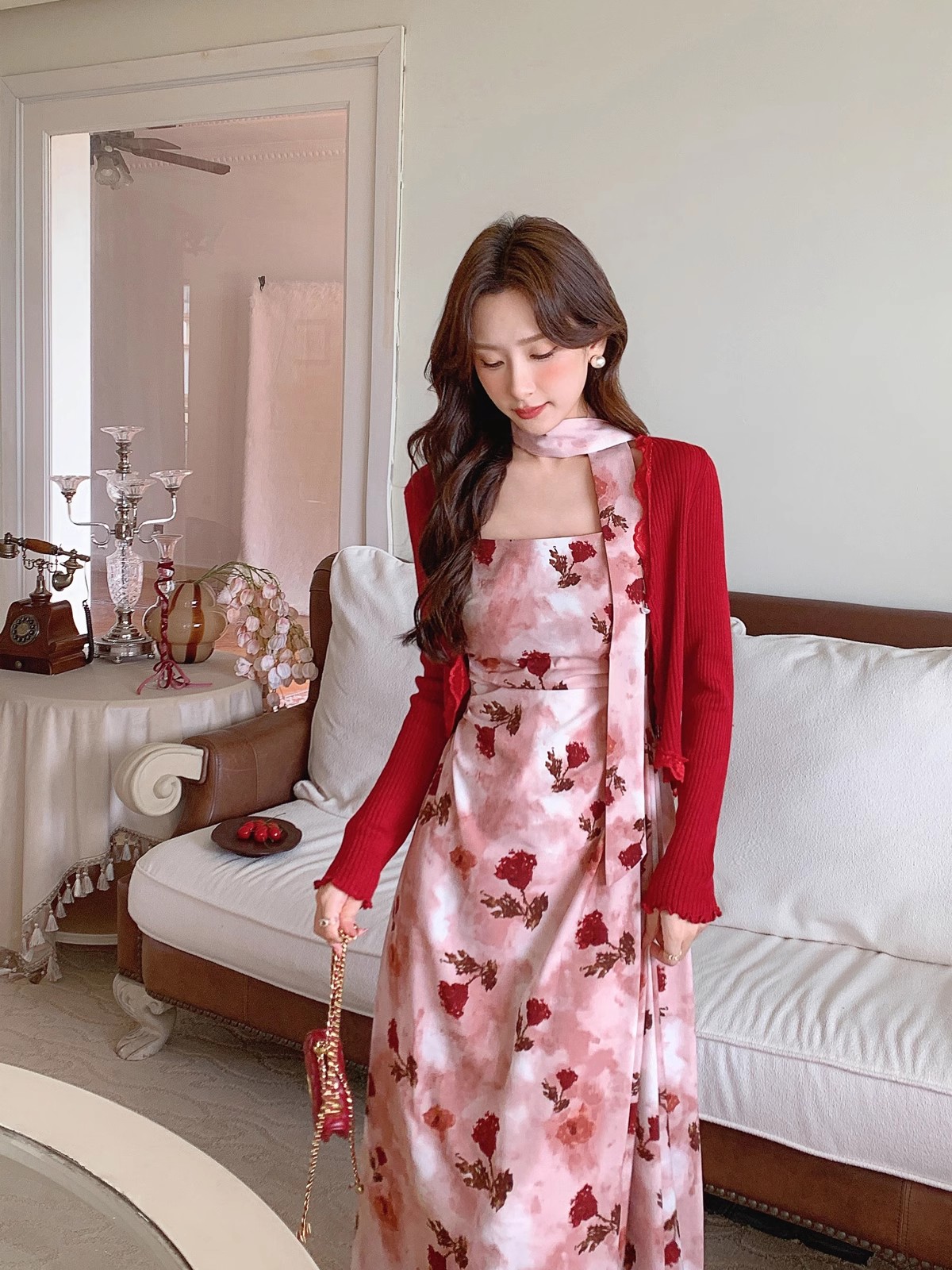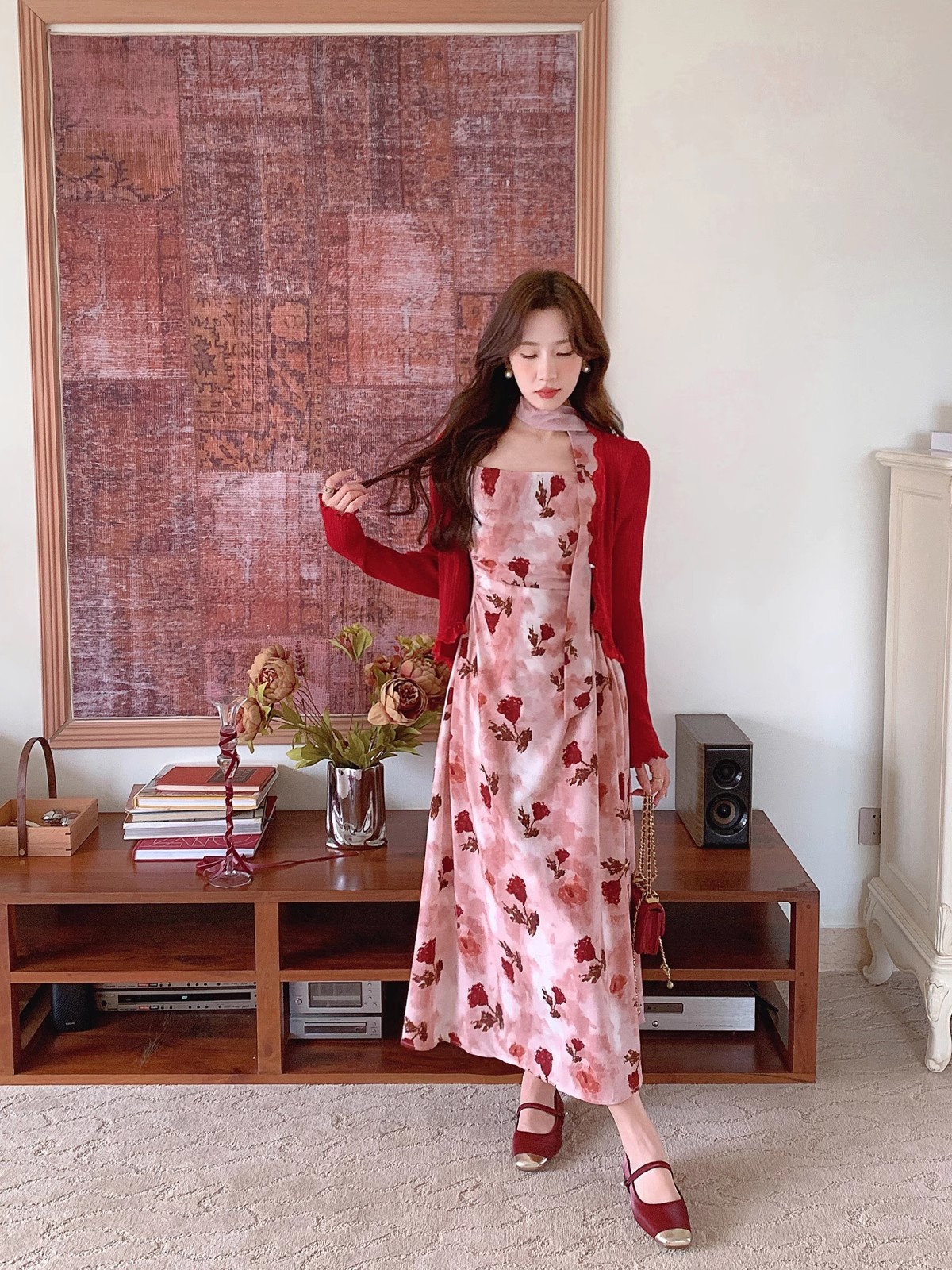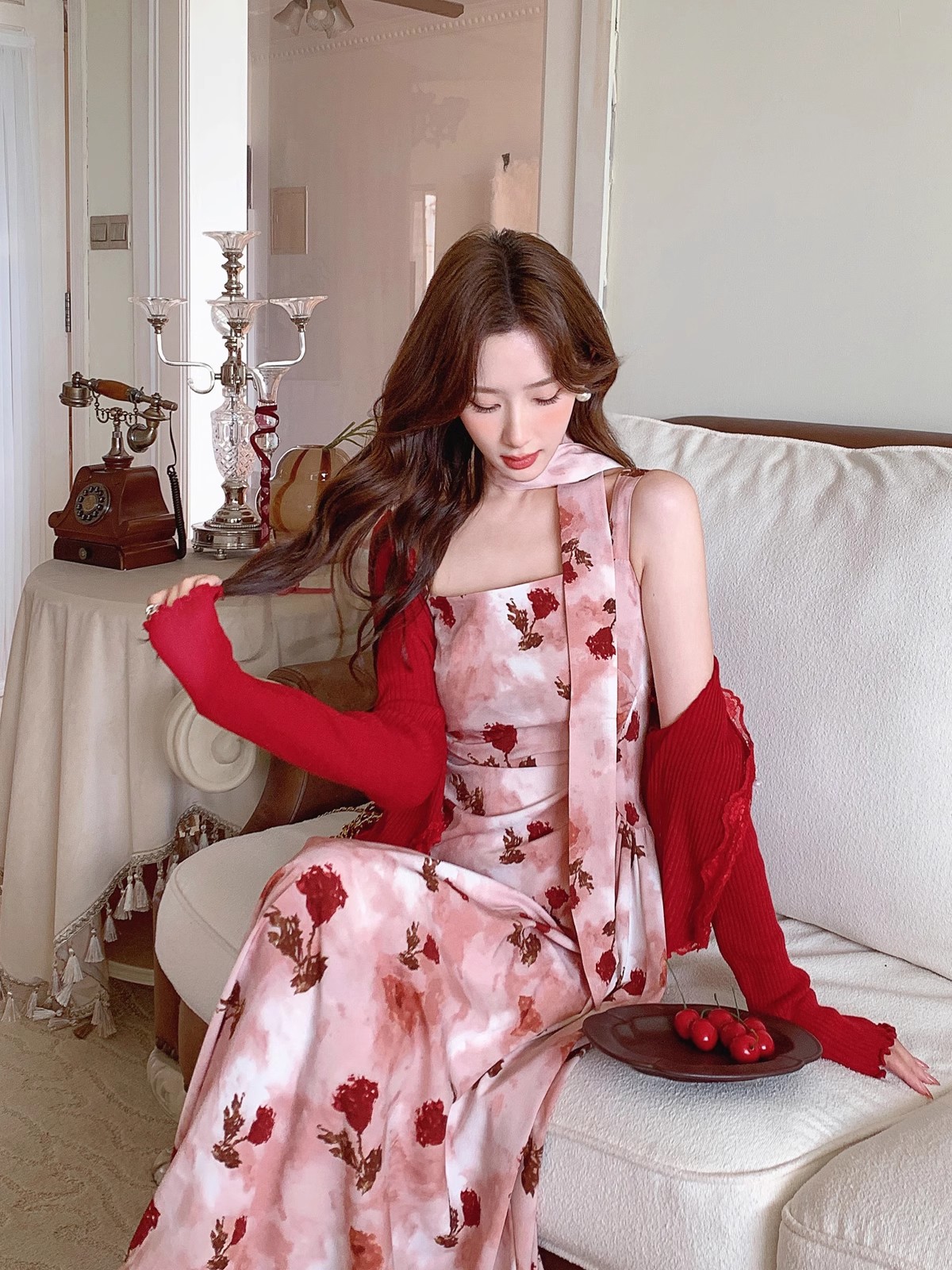 张心子【雾色玫瑰】法式浪漫印花雪纺吊带连衣裙女秋季新款长裙仙 U2408081