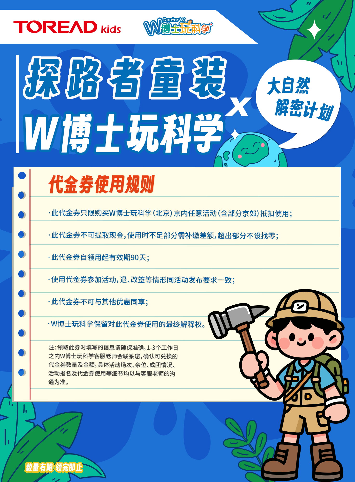 本活动需要在探路者童装实体店消费满599元即赠200元W博士玩科学活动代金券1张,数量有限(可以叠加),先到先得,按实际下单先后时间为准。