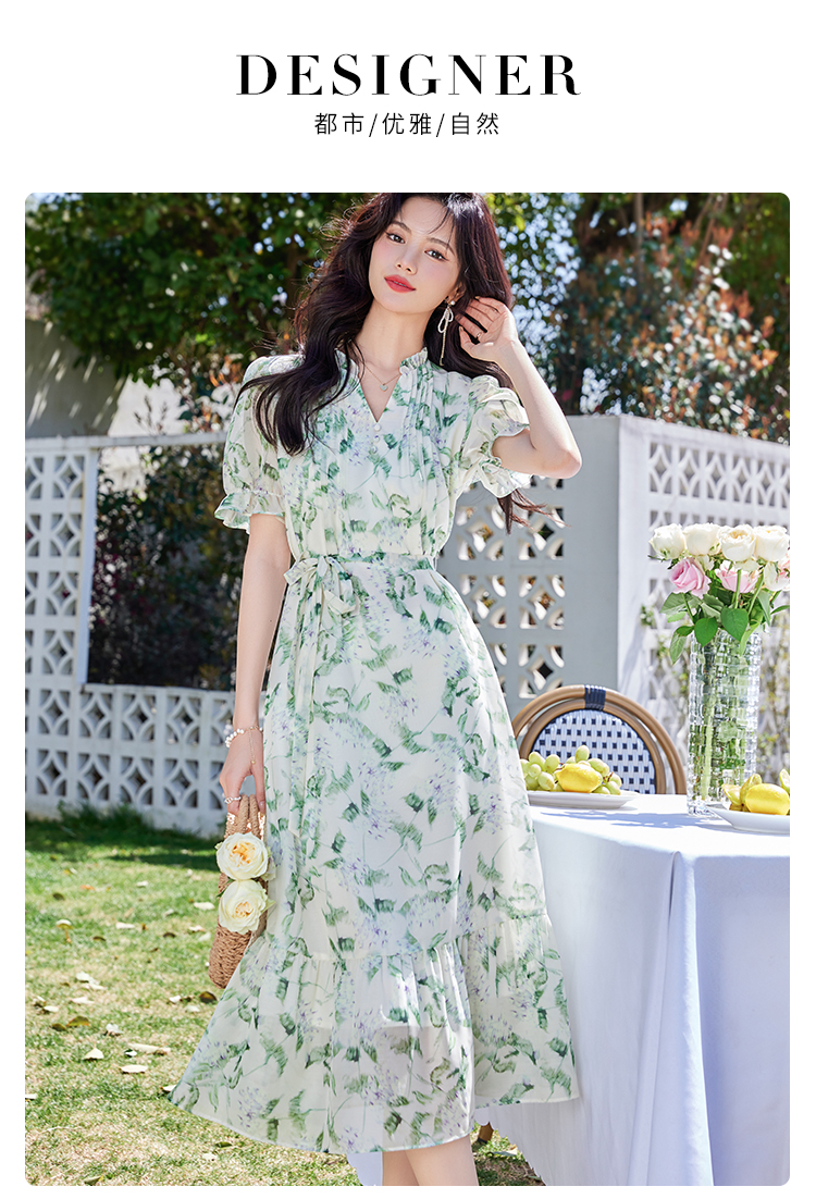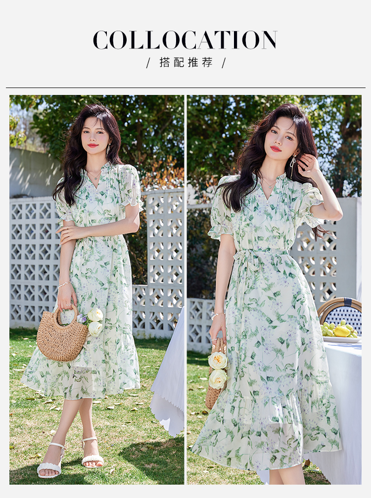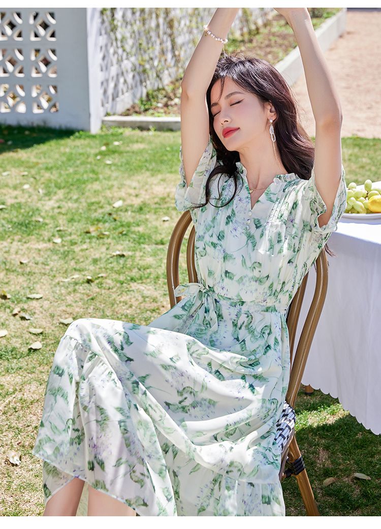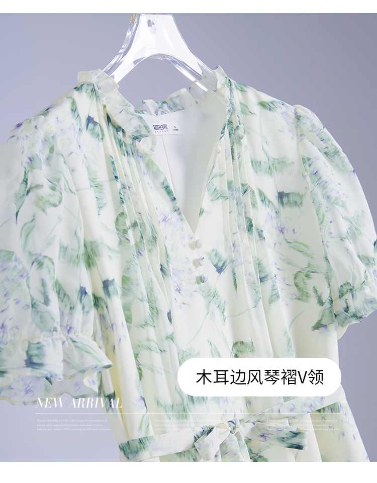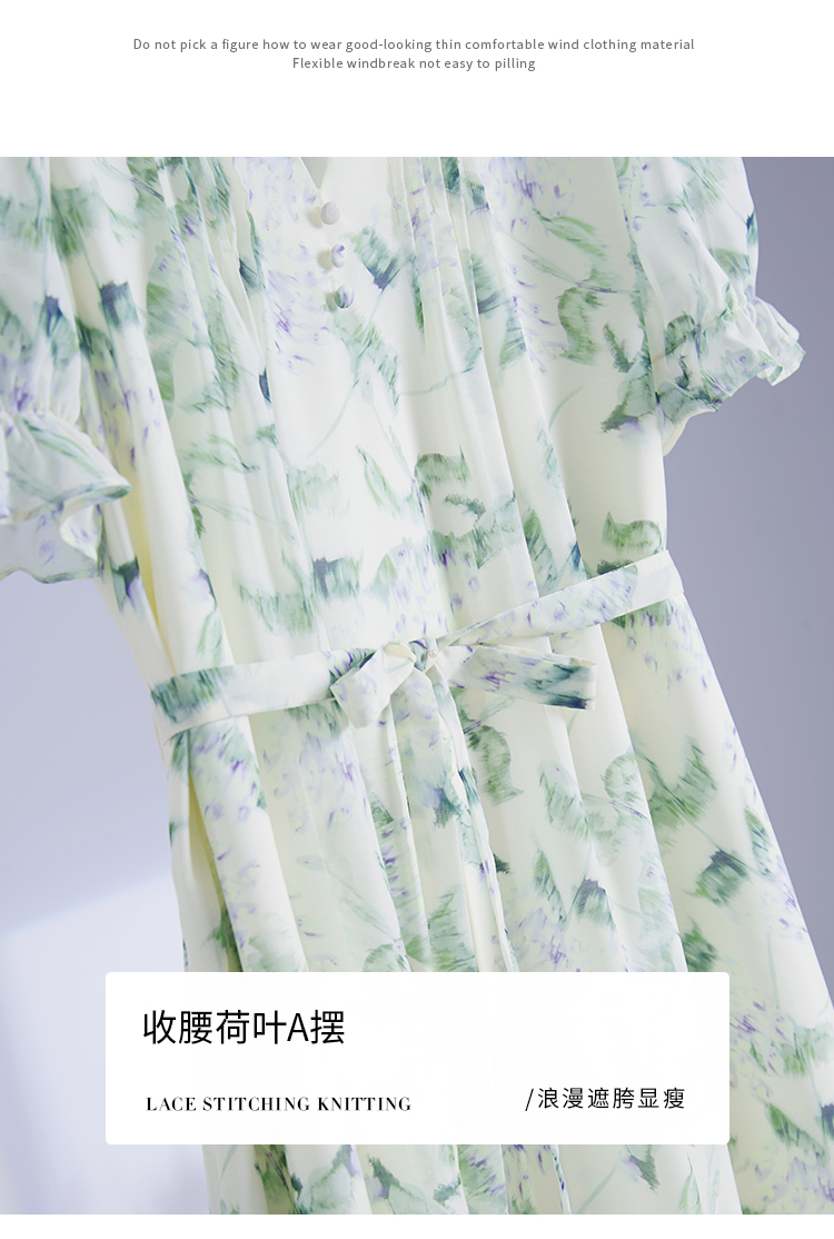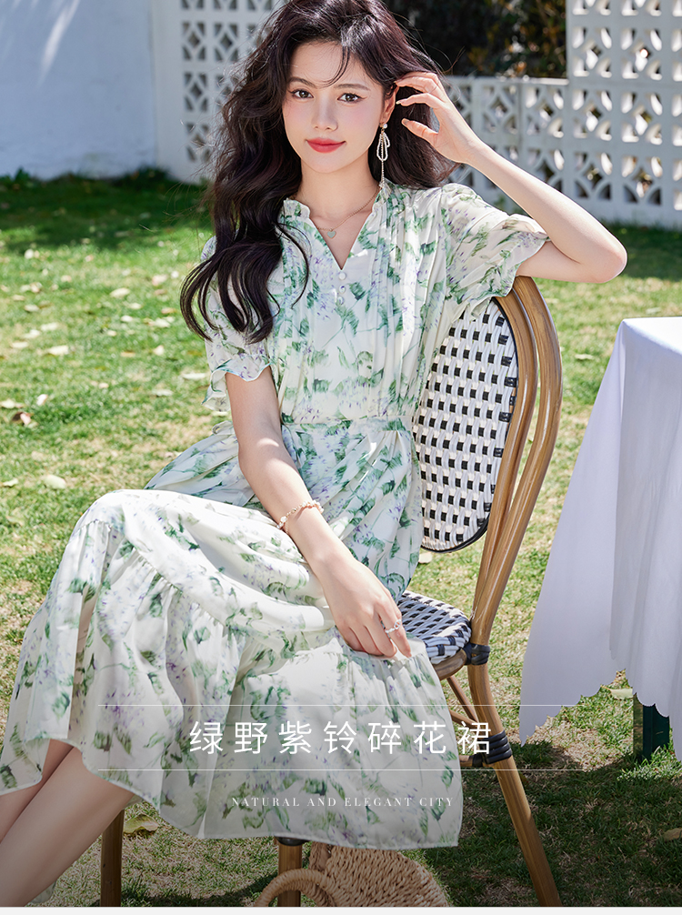 【专属特价】熙世界【绿野紫铃】仙气清新绿色碎花连衣裙女夏季荷叶边雪纺裙子
