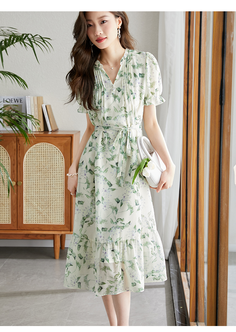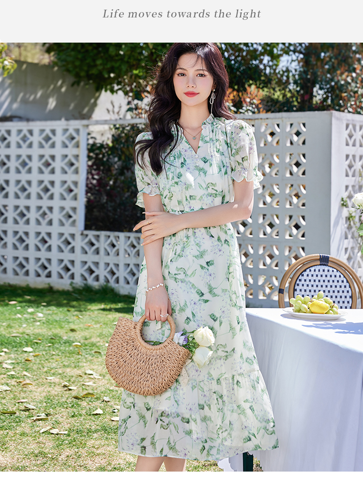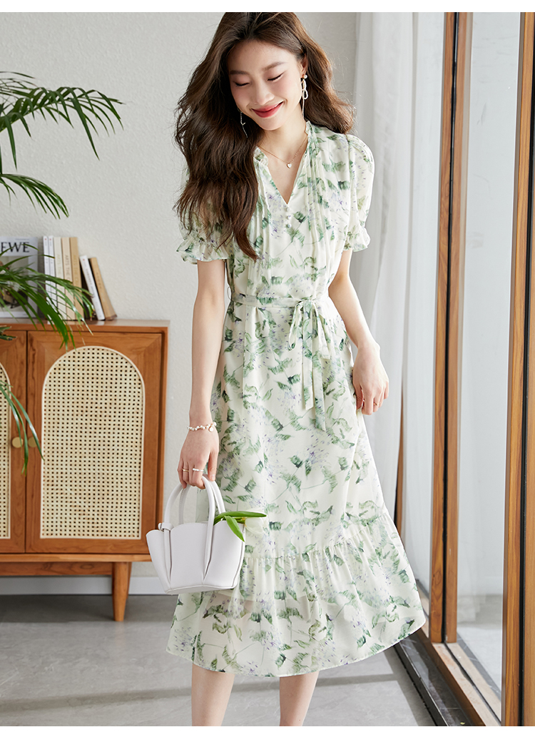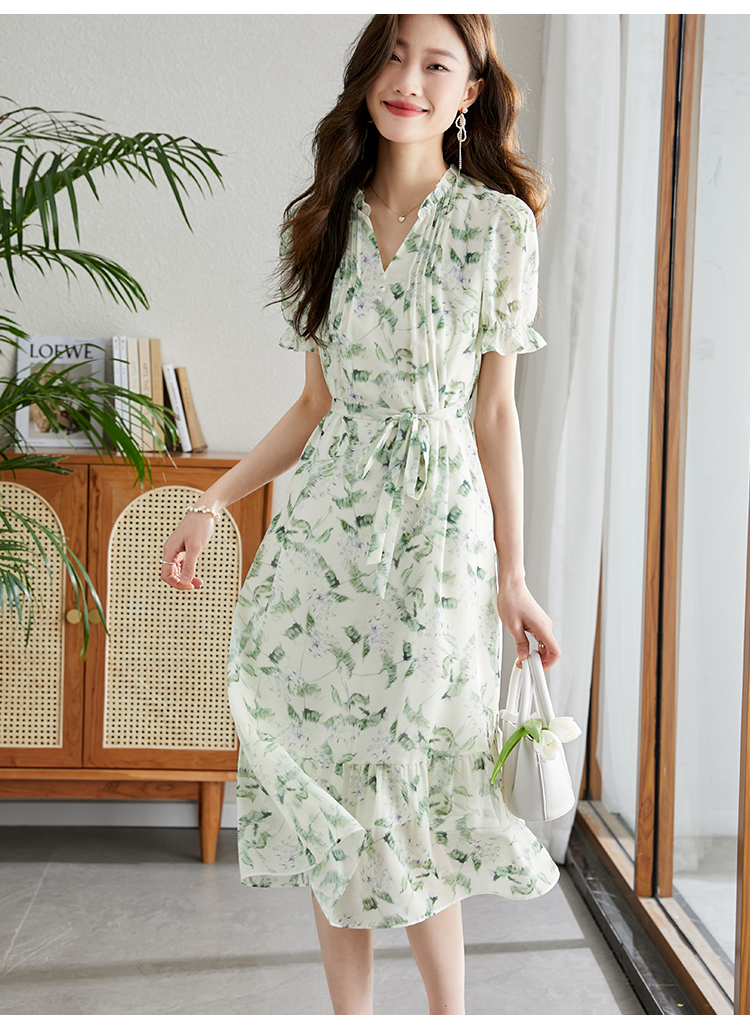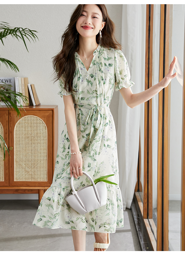 【专属特价】熙世界【绿野紫铃】仙气清新绿色碎花连衣裙女夏季荷叶边雪纺裙子