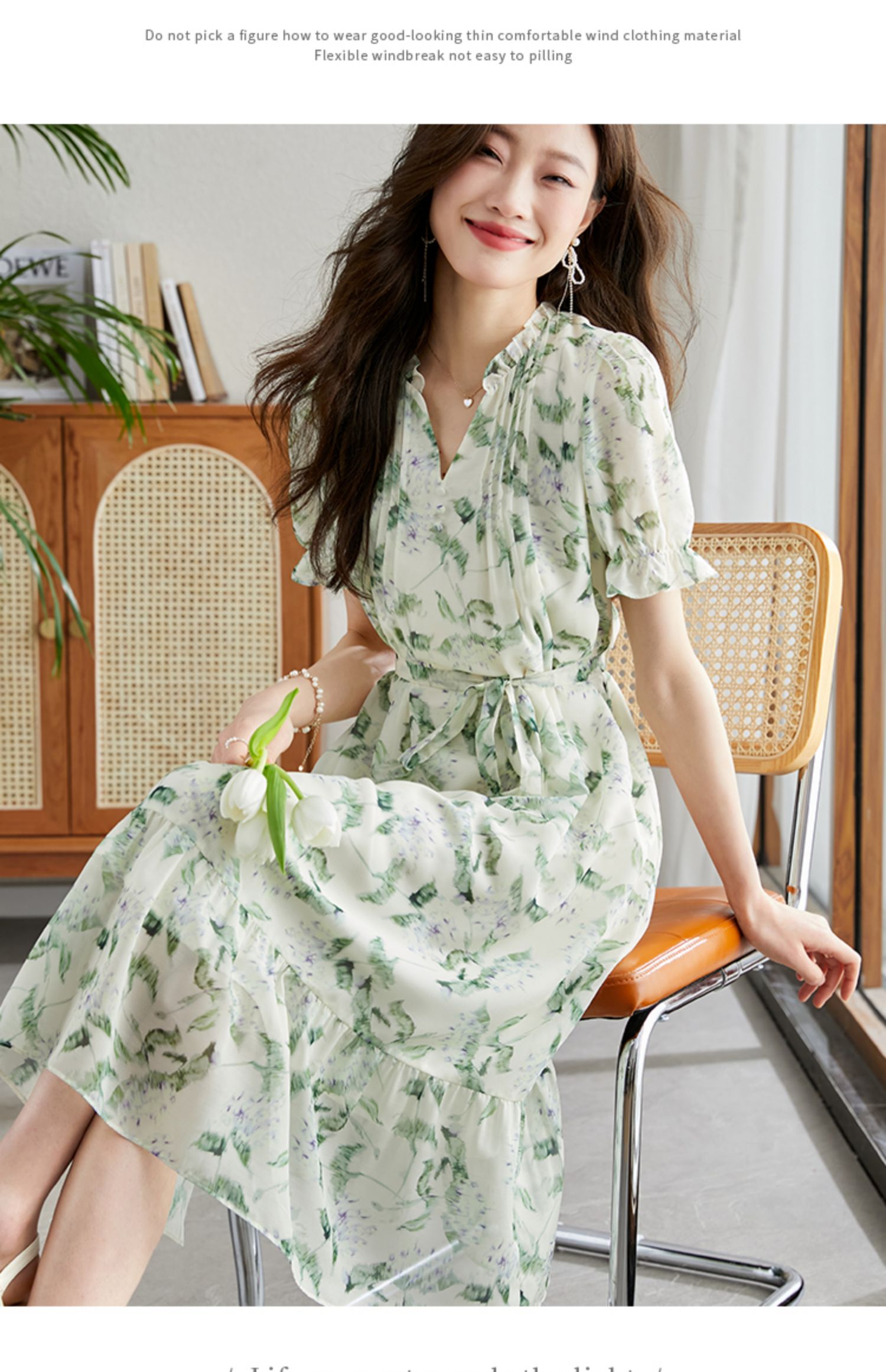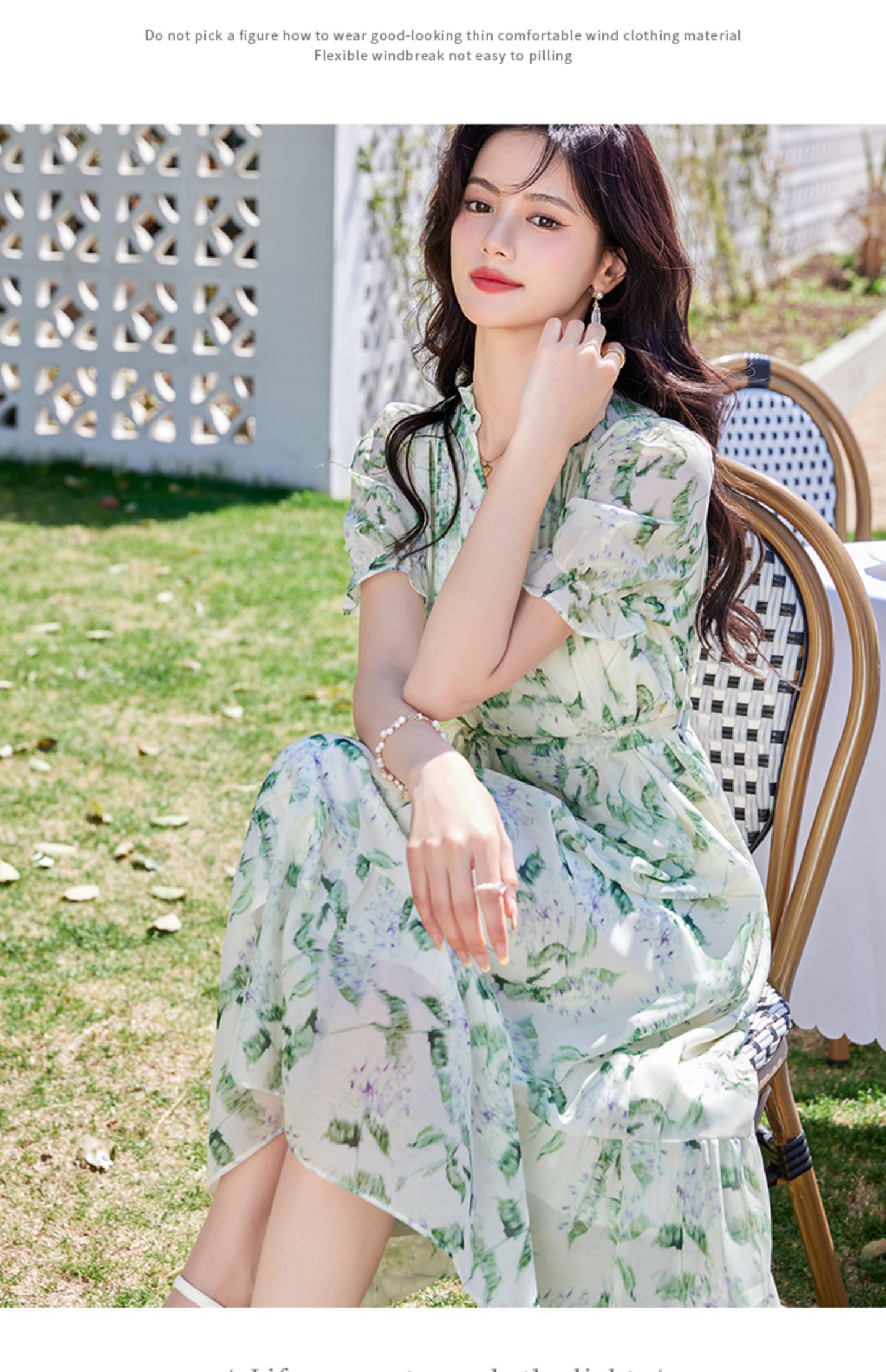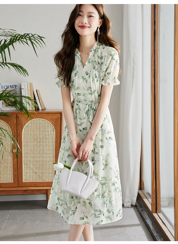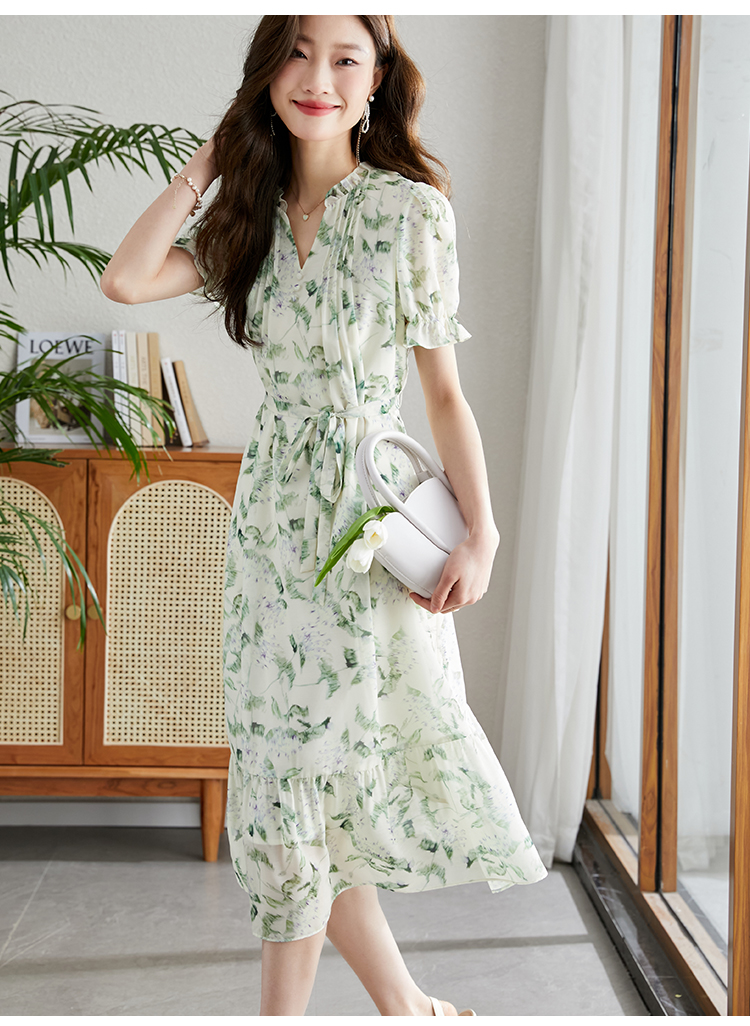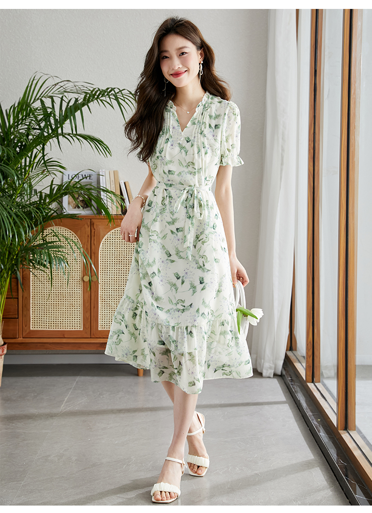 【专属特价】熙世界【绿野紫铃】仙气清新绿色碎花连衣裙女夏季荷叶边雪纺裙子
