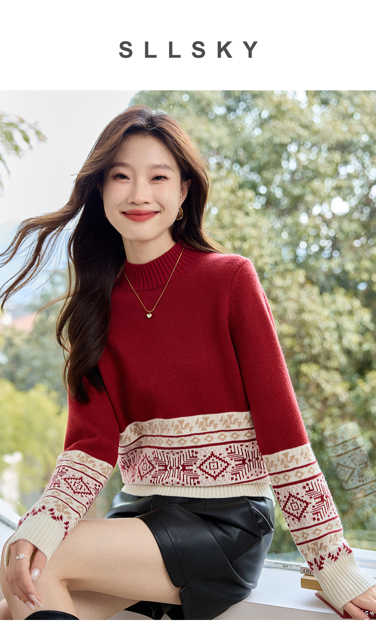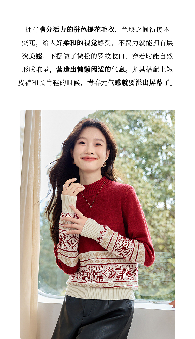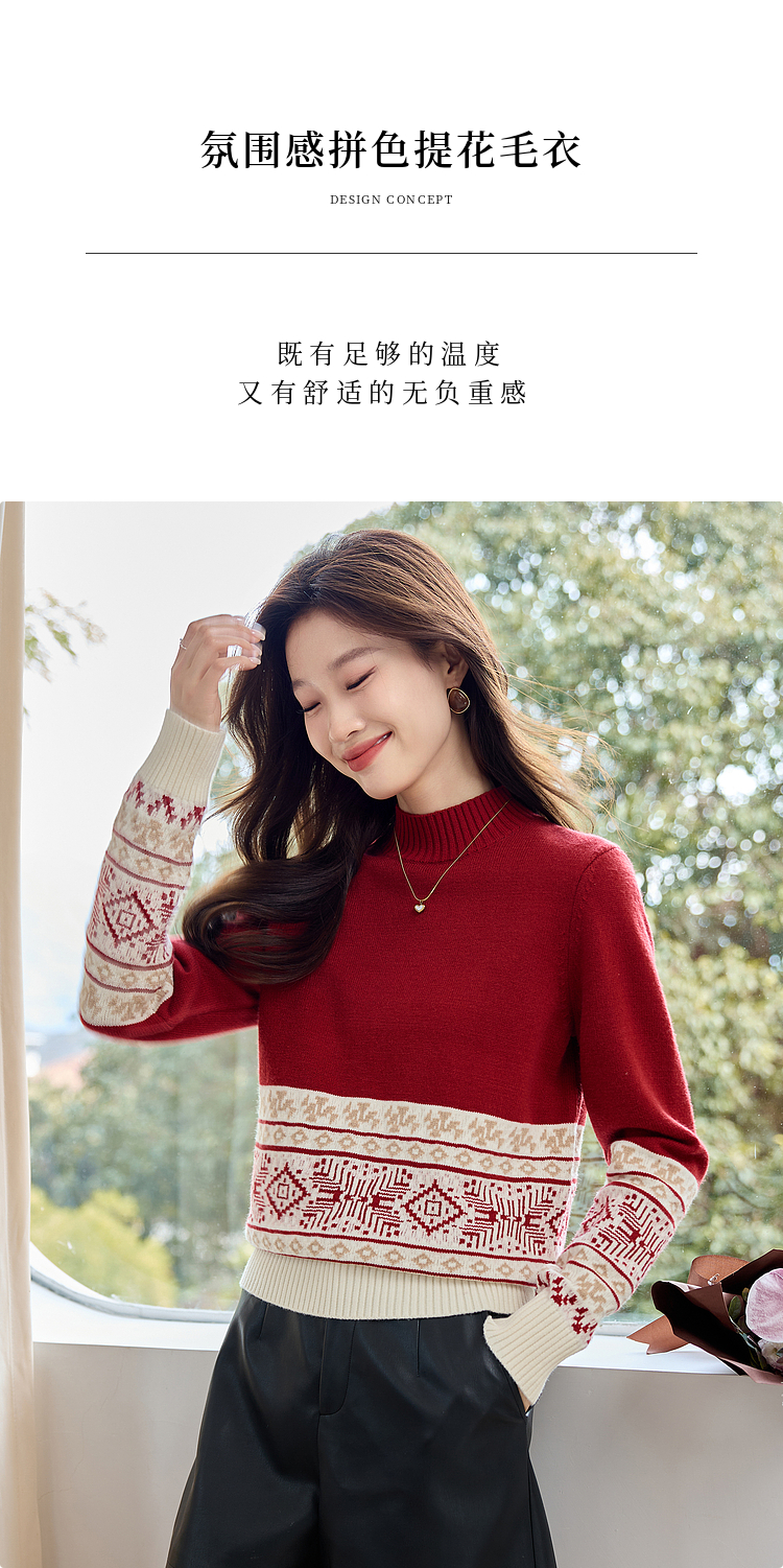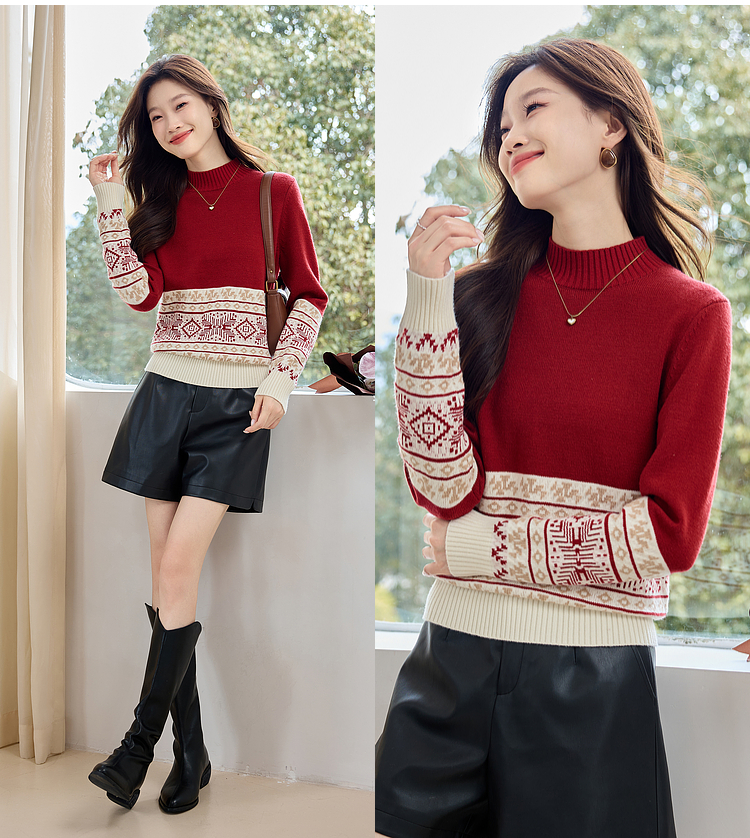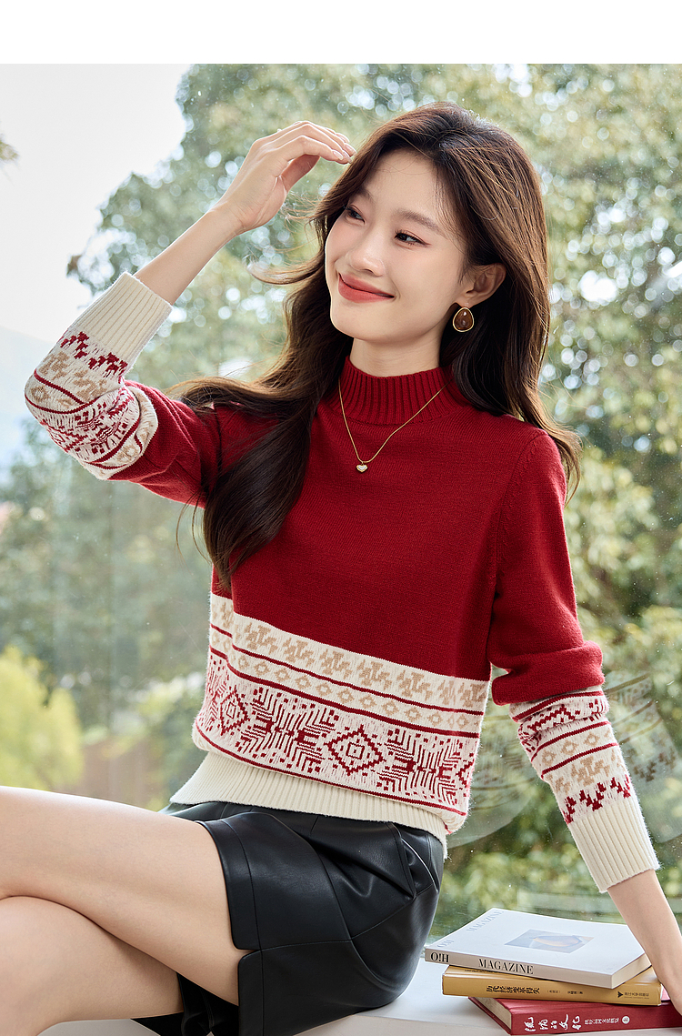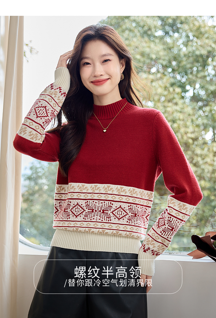 【年终特卖】熙世界氛围感撞色提花毛衣半高领红色打底针织衫2025年冬季新款