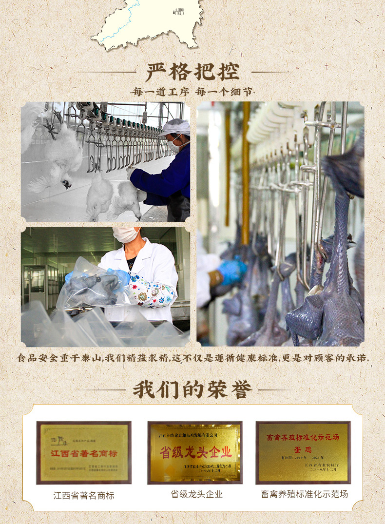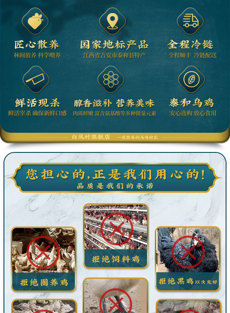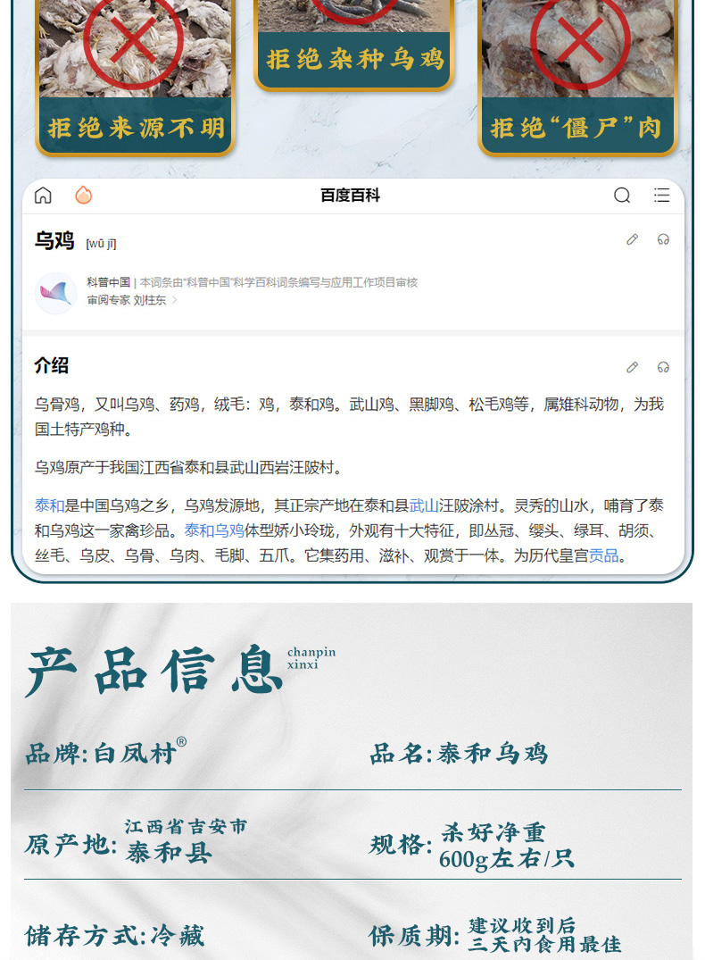 发货前3天内宰杀,生鲜产品一经发出不支持退换拦截。客户收到货品后24小时内拆封检查。如客户收到乌鸡,有臭,腐败的现象可为客户补发或者退款。