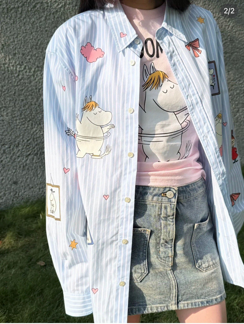 312-7 我爱的姆明 25早春 AC联名姆明 长袖衬衫卡通印花衬衣 条纹宽松休闲衬衫