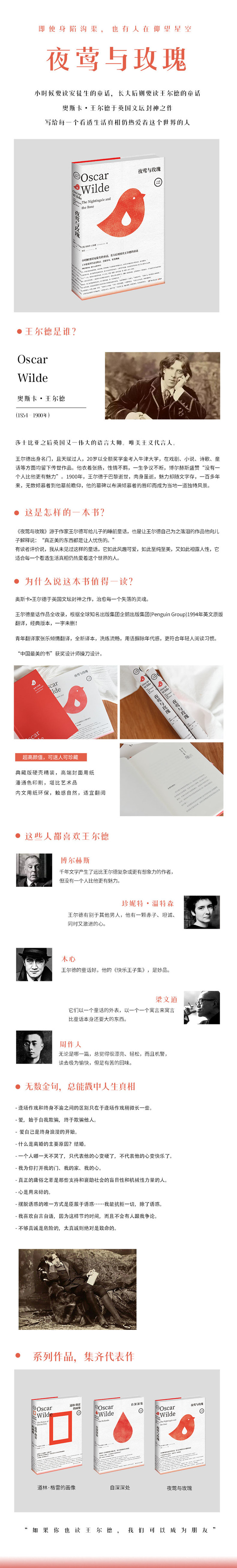 本书为王尔德的经典童话作品集,包括《夜莺与玫瑰》《快乐王子》《好朋友》《了不起的高筒炮》《少年国王》《西班牙公主的生日》《渔夫和灵魂》《星童》《自私的巨人》九部脍炙人口的作品。王尔德首创的成人童话,风格独树一帜,构思巧妙,想象丰富,语言轻松机警,不乏讽刺,每一个故事的讲述都饱含对社会的同情,在童话中蕴含着比寓言更丰富的社会内容,他跟儿子讲童话的时候曾落泪道:“真正美的东西都是让人忧伤的。”