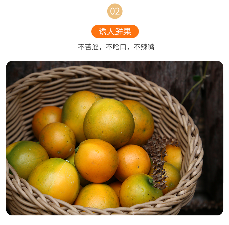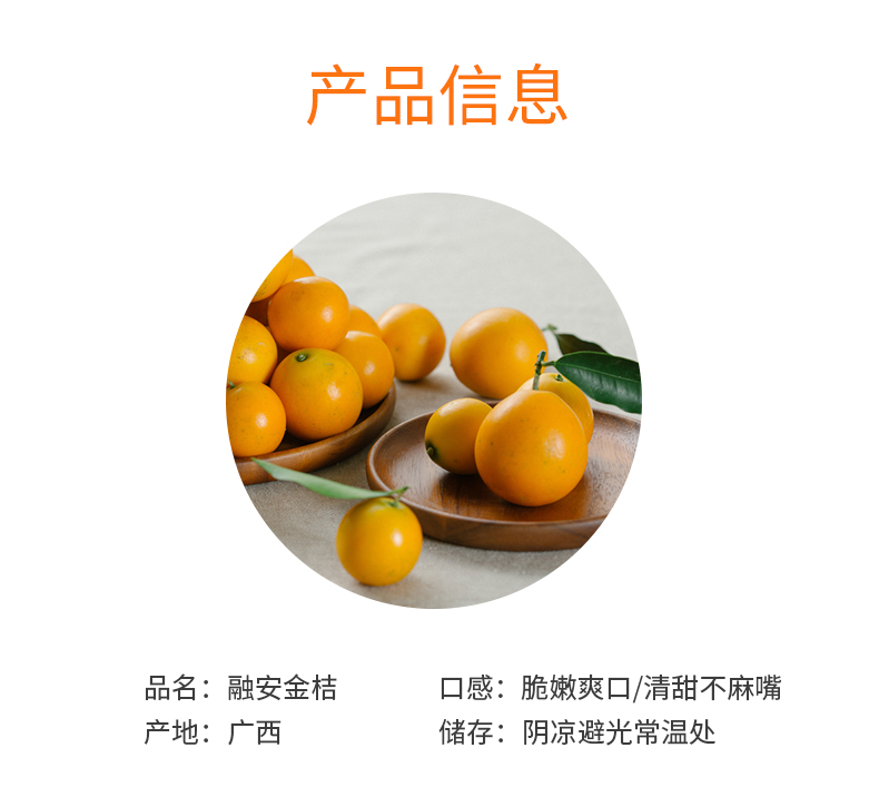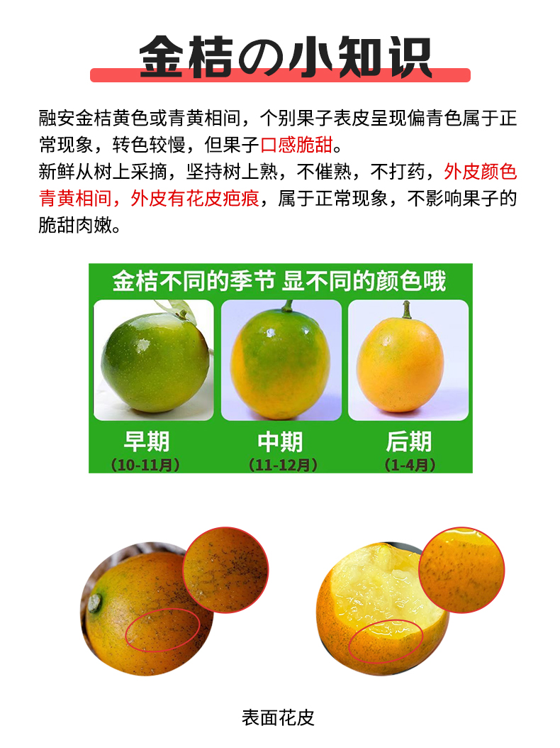温馨提示:融安金桔都是新鲜从树上采摘,坚持树上熟,不催熟,不打药,外皮颜色青黄相间,外皮有花皮疤痕,属于正常现象,不影响果子的脆甜肉嫩。