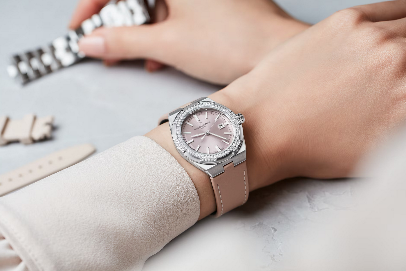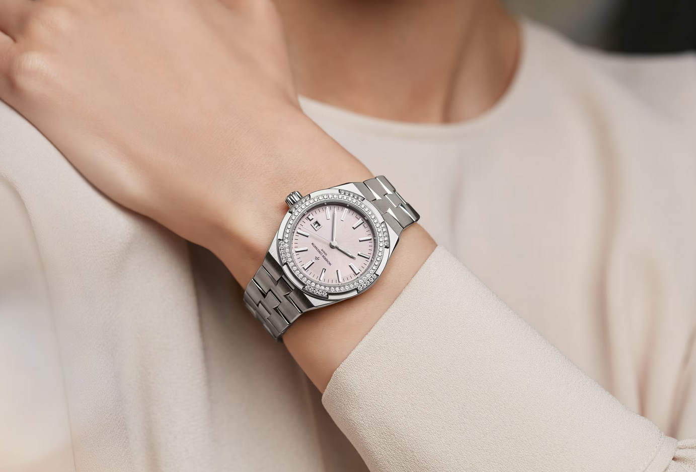 镜面材质 | 蓝宝石水晶玻璃 | 表盘 | 精钢表壳 半透明粉色调漆面,18K白金时标、时针和分针均覆有蓝色Super-LumiNova®夜光涂层 精钢镶90颗钻总重约0.86克拉,配有防磁软铁内圈 日期显示 透底 |