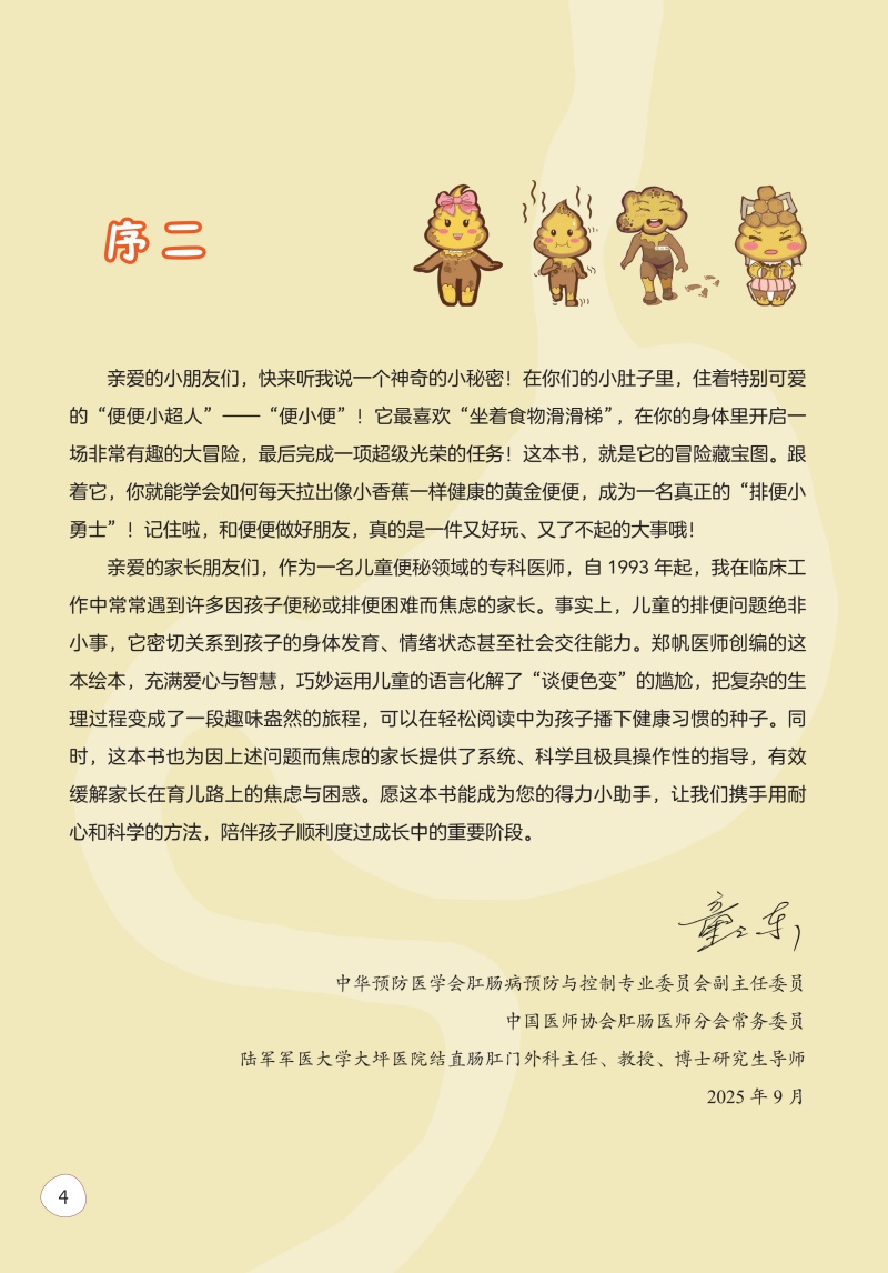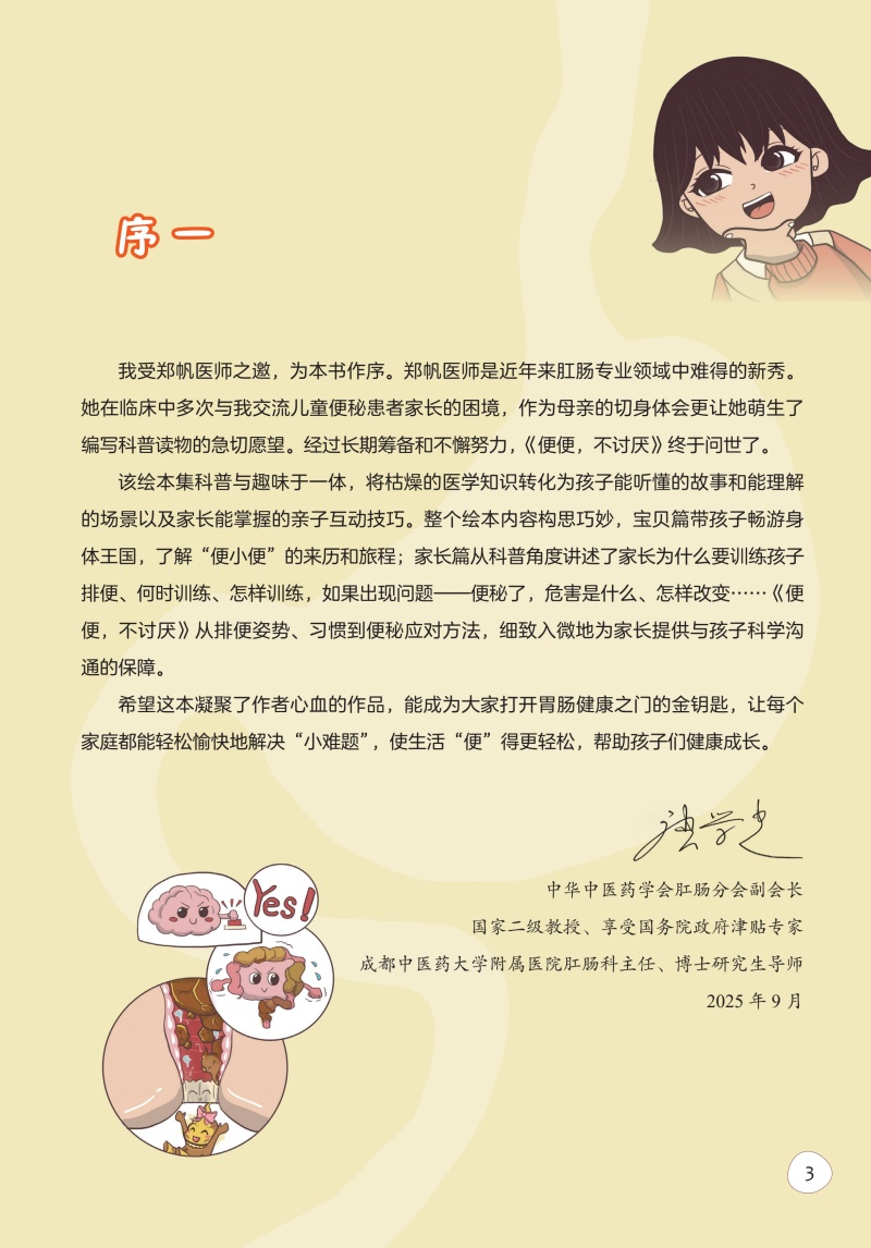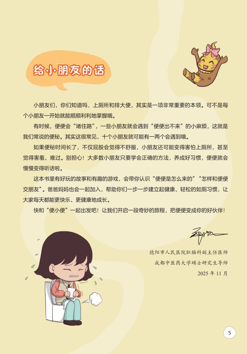 本图书为图文并茂的科普书,分为上下两篇。上篇以简洁明了而生动有趣的图画为主,主要介绍便便那些事;了解便便的来源、形状;人为什么要便便,怎么才是理想的、健康的便便;树立家长与孩子对于便便的正确认识。采用故事化的视角,如通过家长和孩子喜欢的甜甜圈的神奇旅行,体现食物经口到肛门排出的消化过程以阐述便便的产生。引入便便的类型,介绍便小便家族成员。以大众易理解的方式认识理解不同类型的便便及其意义。下篇,重点突出介绍不适宜的便便教育和认知,常见喂养的误区及排便训练的意义。让家长学会下篇所论述的内容,如Boppps教学,是一种注重教学互动和反思的闭环反馈课程设计模式,对于孩子的排便训练非常有效,掌握下篇的知识点可将其运用到Boppps教学模式来设计。
