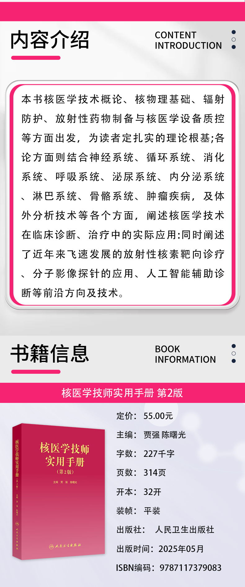 再版书秉承**版的编写原则从核医学技术概论引入,全面详实介绍核医学设备及原理,注重时效性对标国际新技术的发展,结合国标和相关的法律及行业规范,阐述核医学设备常规性及预防性质量控制为重点,结合临床实践撰写核医学成像参数选取和图像采集方式规范化和系统化要求,并结合相关学科包括生物医学、机械工程学、生理生化、人工智能等助力核医学技术创造性发展的科学性论述。本书作为核医学技术临床专业性指导用书,应遵循核医学技术飞速发展的实际情况,具有较强的时效性,及时更新再版,并预计于5年后再次修订。