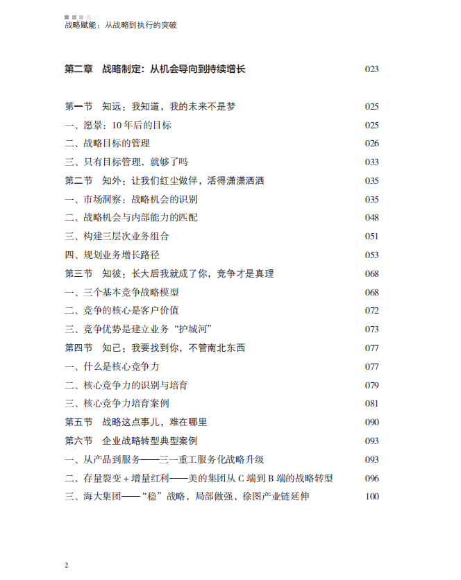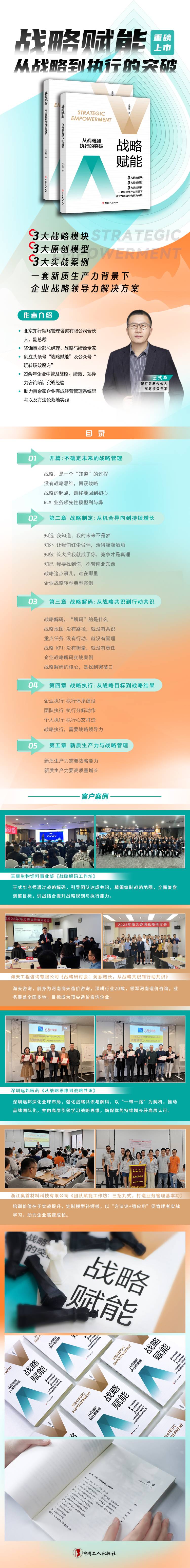 《战略赋能:从战略到执行的突破》一书主要讲了面对瞬息万变的市场环境,诸多企业正处于战略转型期,如何锚定企业发展方向,找寻战略落地路径,达成战略执行结果,是企业急需解决的重要课题。本书涵盖企业战略管理的全过程,以独创的战略模型为主线,辅之以大量的实战案例,既有方法论指引,又有可操作的工具模板,可以有效帮助企业中高层管理者完成战略管理的系统思考以及实践落地。