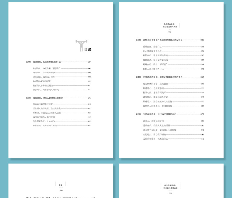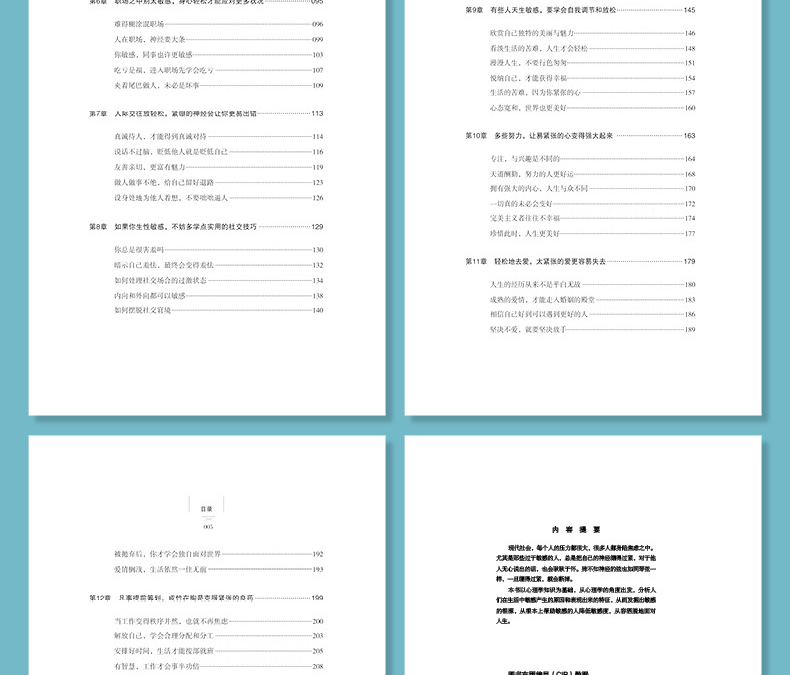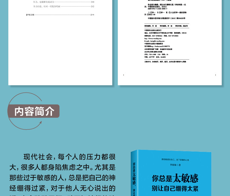 章 太过敏感,其实是和自己过不去 001敏感的人,心里住着“假想敌” 002内向的人,往往更加敏感 004过度敏感,就变成了自卑 006敏感的人更追求 009敏感的人容易错过爱情 011敏感的人,太在意他人的目光 014第2章 别太敏感,没有人会时刻注意着你 017你远远不如想象中重要 018活在别人的目光里,会迷失自我 021再努力,你也无法让所有人满意 024远离患得患失,获得幸福 027学会摒弃杂音,让心清净 029心若改变,世界也随之改变 032第3章 为什么过于敏感?其实是你对自己太没信心 035看重自己,珍爱自己 036让心从沙粒变为珍珠 039相信自己,你才能创造奇迹 042自己,你会变得更强大 045自己,战胜“不可能” 048任何人都不能伤害自己 051第4章 不尝试战胜敏感,就是让情绪成为你的主人 057成为情绪的主宰,远离敏感 058敏感的心,总是更恐惧 060打开心窗,才能看到美好 064过度忧虑,使敏感的人变老 067敏感的人,更会被嫉妒之火焚烧 070敏感的人抱怨不休,被问题纠缠 073第5章 生活本就不易,放过本已很累的自己 077虚荣心,是烦恼的阶梯 078爱慕虚荣,会陷入人生的黑洞 080追求公平无限度,敏感的心不得解脱 084忘记过去,让心变得轻松 089无法改变外界,就改变自己 092第6章 职场之中别太敏感,身心轻松才能应对更多状况 095难得糊涂混职场 096人在职场,神经要大条 099你敏感,同事也许更敏感 3吃亏是福,进入职场先学会吃亏 7夹着尾巴做人,未必是坏事 9第7章 人际交往放轻松,紧绷的神经会让你更易出错 113真诚待人,才能得到真诚对待 114说话不过脑,贬低他人就是贬低自己 116友善亲切,更富有魅力 119做人做事不绝,给自己留好退路 123设身处地为他人着想,不要咄咄逼人 126第8章 如果你生性敏感,不妨多学点实用的技巧 129你总是很害羞吗 130暗示自己羞怯,终会变得羞怯 132如何处理场合的过激状态 134内向和外向都可以敏感 138如何摆脱窘境 140第9章 有些人天生敏感,要学会自我调节和放松 145欣赏自己独特的美丽与魅力 146看淡生活的苦难,人生才会轻松 148漫漫人生,不要行色匆匆 151悦纳自己,才能获得幸福 154生活的苦难,因为你紧张的心 157心态宽和,世界也更美好 160第章 多些努力,让易紧张的心变得强大起来 163专注,与兴趣是不同的 164天道酬勤,努力的人更好运 168拥有强大的内心,人生与众不同 170一切真的未必会变好 172主义者往往不幸福 174珍惜此时,人生更美好 1771章 轻松地去爱,太紧张的爱更容易失去 179人生的经历从来不是平白无故 180成熟的爱情,才能走入婚姻的殿堂 183相信自己好到可以遇到更好的人 186坚决不爱,就要坚决放手 189被抛弃后,你才学会独自面对世界 192爱情搁浅,生活依然一往无前 1952章 凡事提前筹划,成竹在胸是克服紧张的良 199当工作变得秩序井然,也就不再焦虑 200解放自己,学会合理分配和分工 203安排好时间,生活才能按部就班 205有智慧,工作才会 208压力,也能够变成动力 2全力以赴,应对一切复杂局面 212参考文献 214