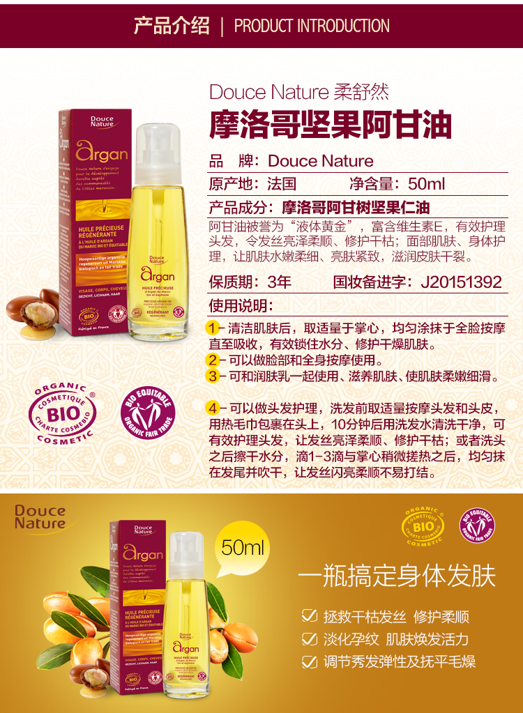 柔舒然 Douce Nature 法国有机进口摩洛哥坚果阿甘油护发精华 100ML1瓶