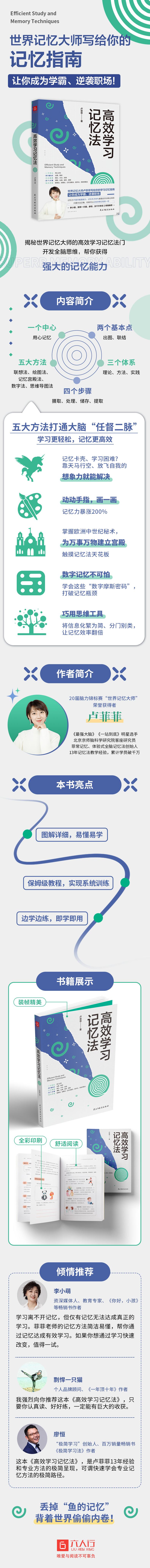 世界记忆大师卢菲菲的记忆密码,揭秘记忆的“道、法、术”。本书介绍大脑正确记忆的规律,记忆法入门;四大核心技能,奠定优秀记忆基础;有效记忆的五大方法,在实战中打造不错大脑;以及运用记忆法,快速提升学习效率。对书中涉及的记忆方法加以举例说明,并有训练实际运用。全程沉浸式学习记忆,有趣味且高效。记忆力不是天赋是能力,记忆天才99%都是后天训练出来的!方法恰当,你就可以记住你想记住的一切!一个中心“用心记忆”两个基本点“出图、联结”三个体系“理论、方法、实践”四个步骤“摄取、处理、储存、提取”五大方法“联想法、绘图法、记忆宫殿法、数字法、思维导图法”记忆法带来的优选改变是重塑你对人生的信心和勇气。