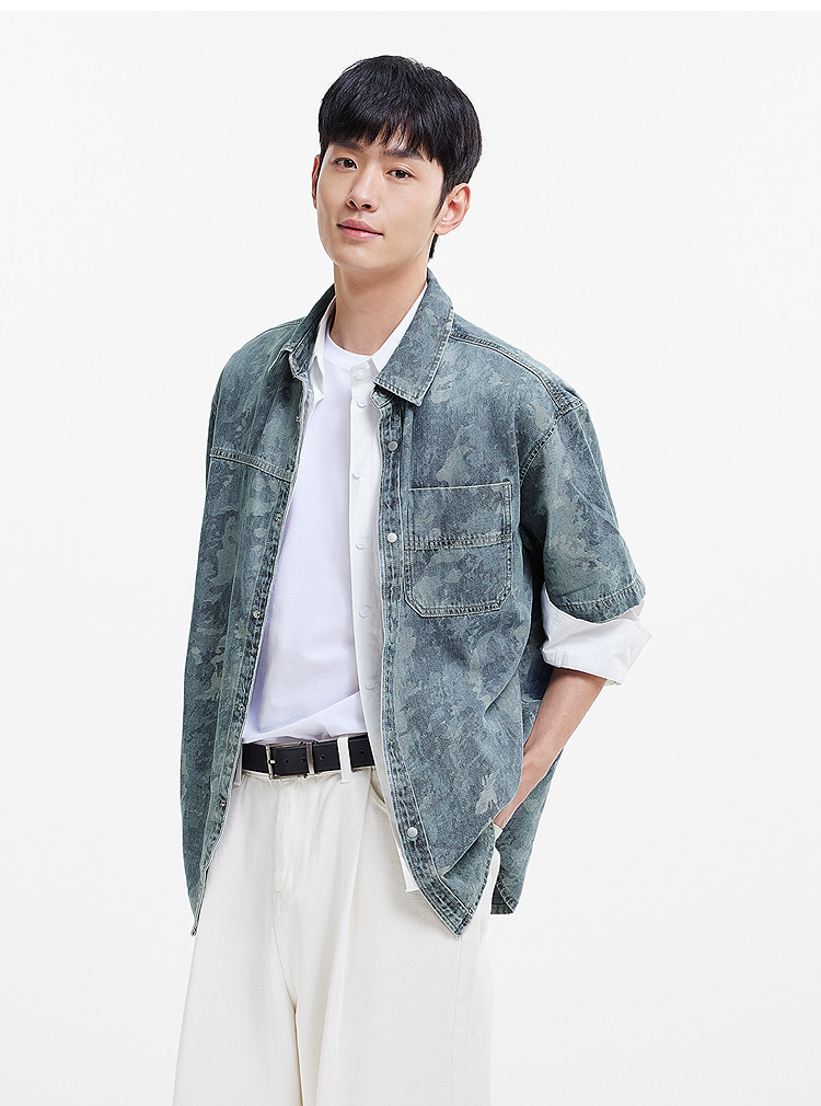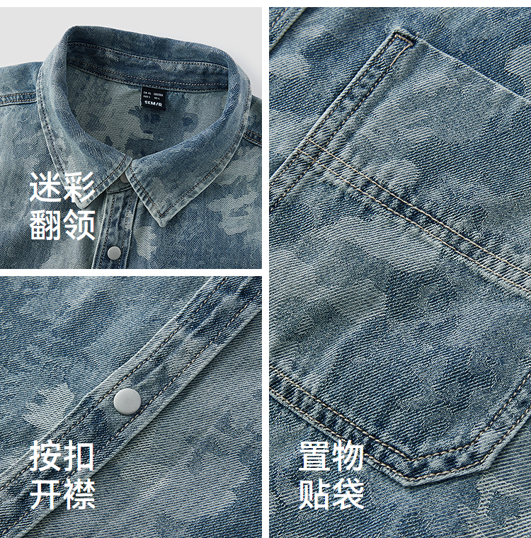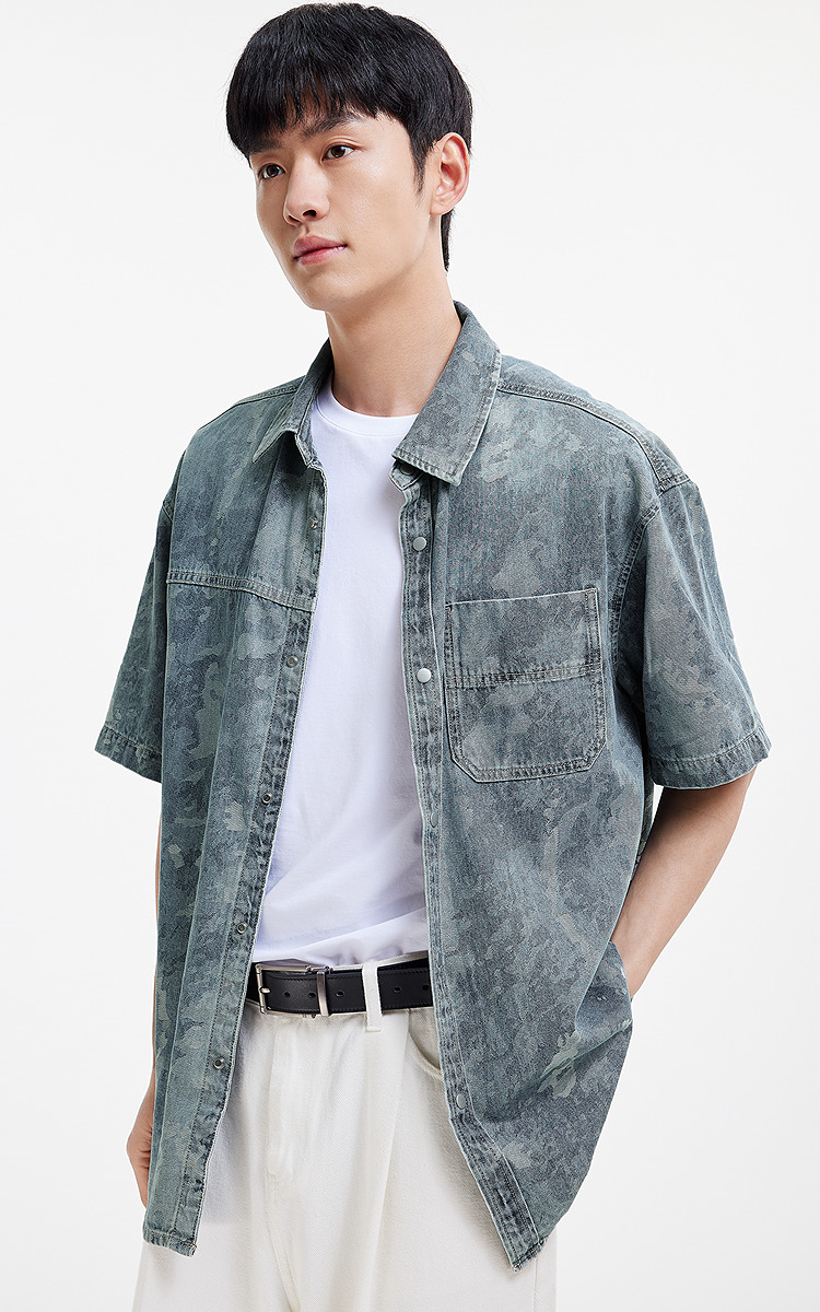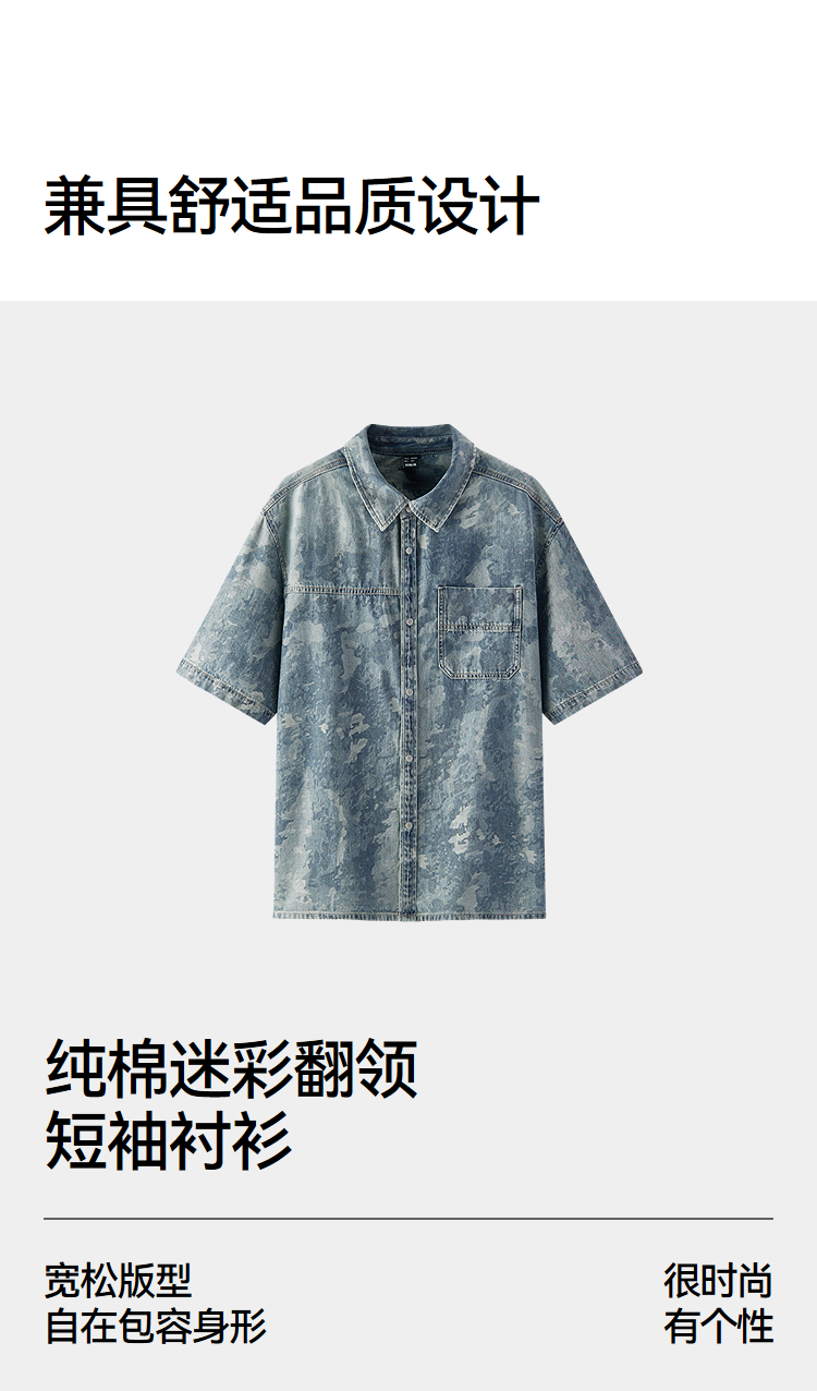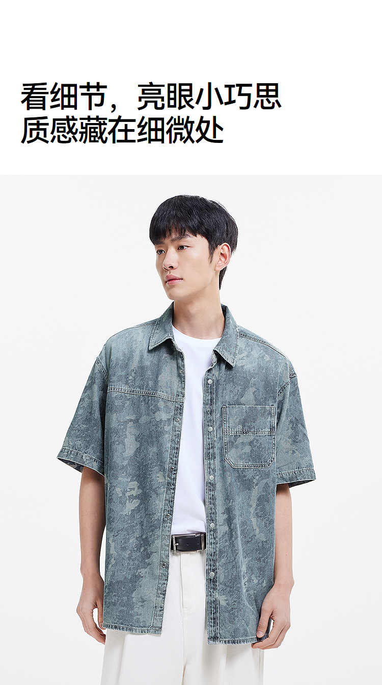 森马短袖衬衫男夏季纯棉宽松迷彩牛仔外套时髦潮流个性短袖上衣
