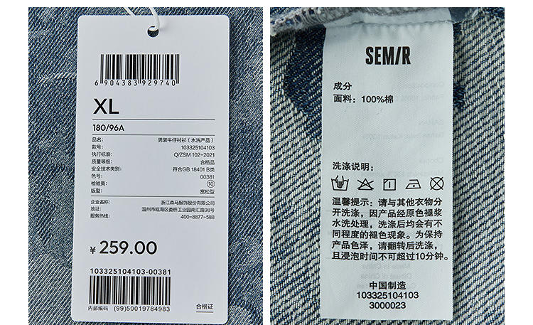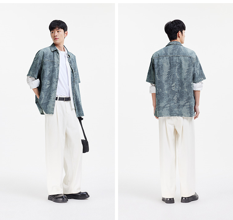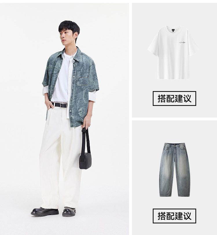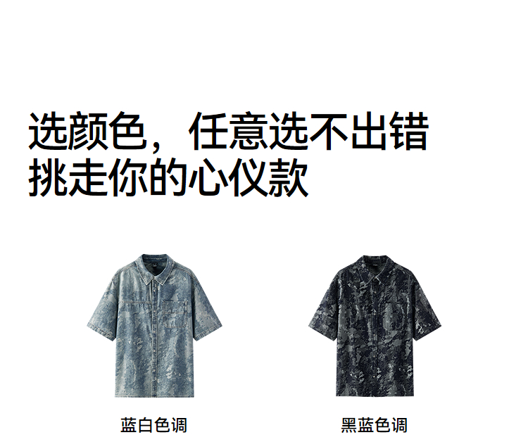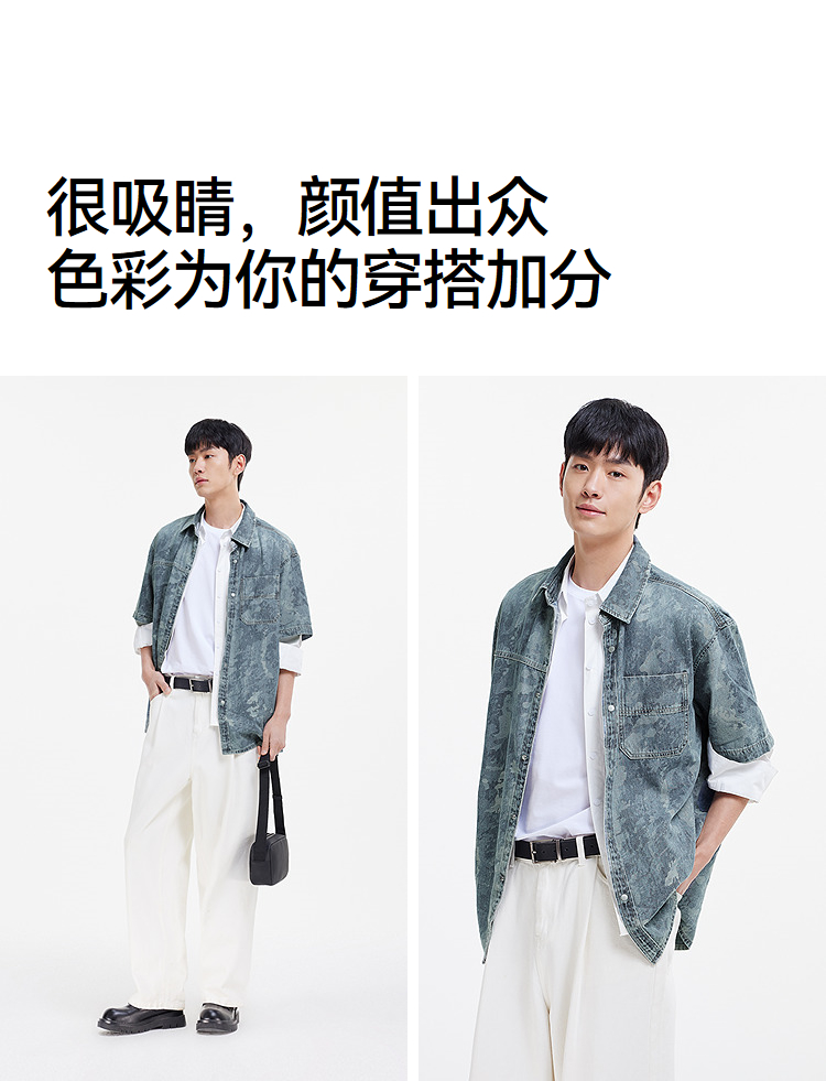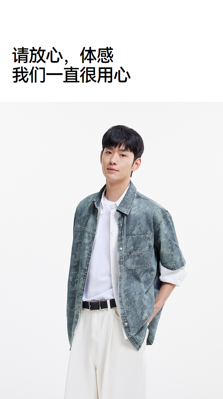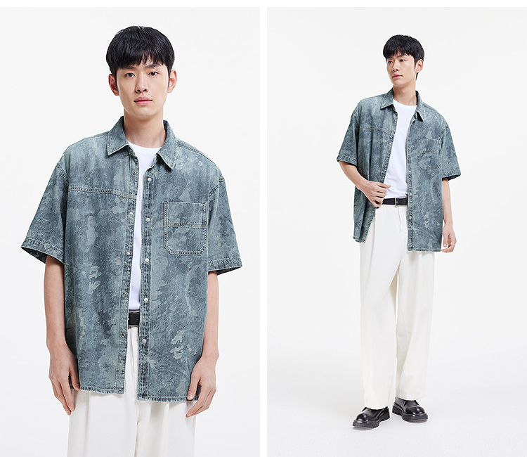 森马短袖衬衫男夏季纯棉宽松迷彩牛仔外套时髦潮流个性短袖上衣